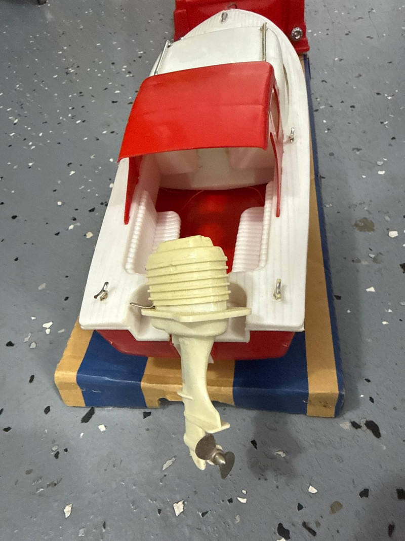 Power cruiser boat: White and red boat described as battery operated, with a motor that turns and tilts the propeller.