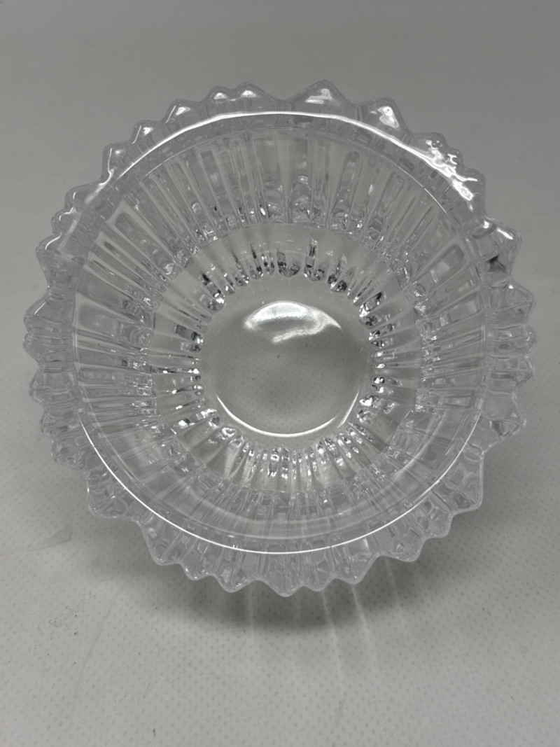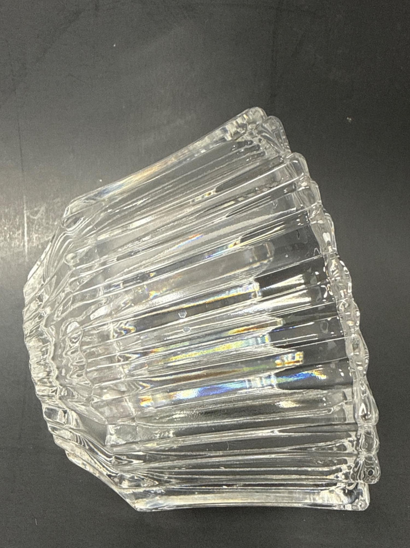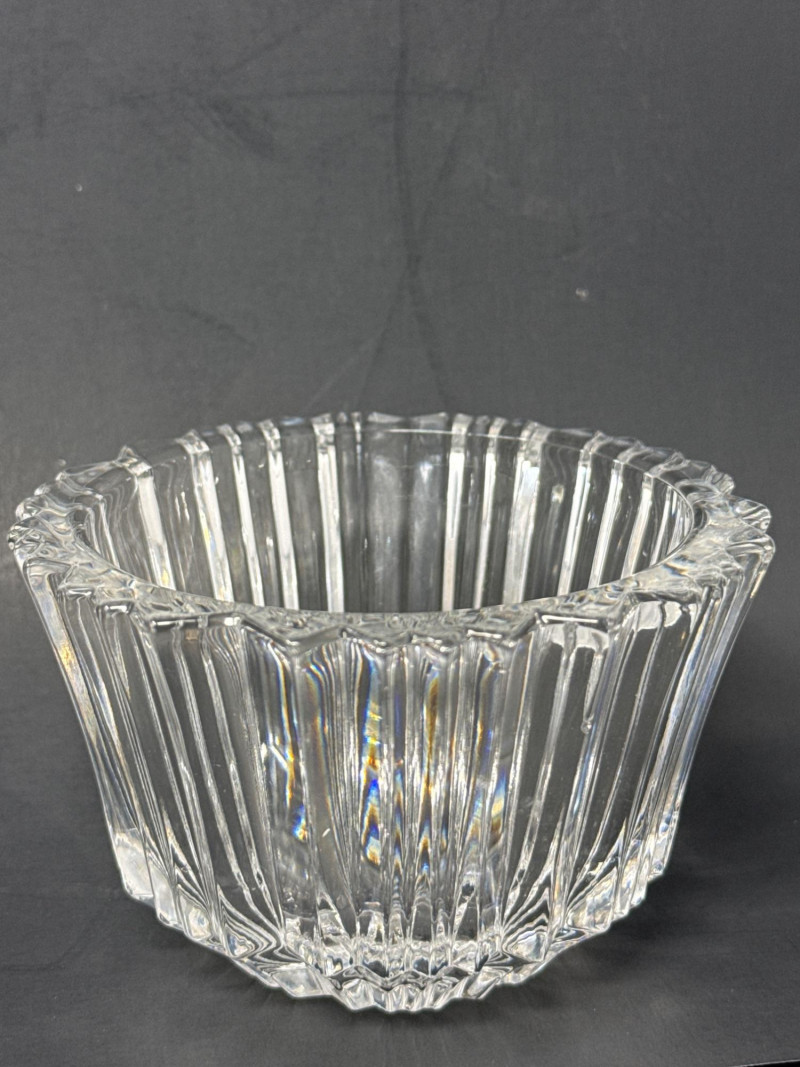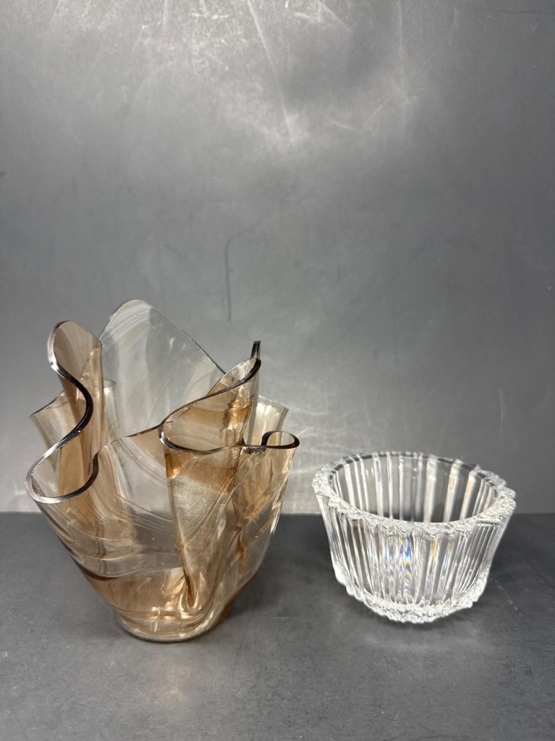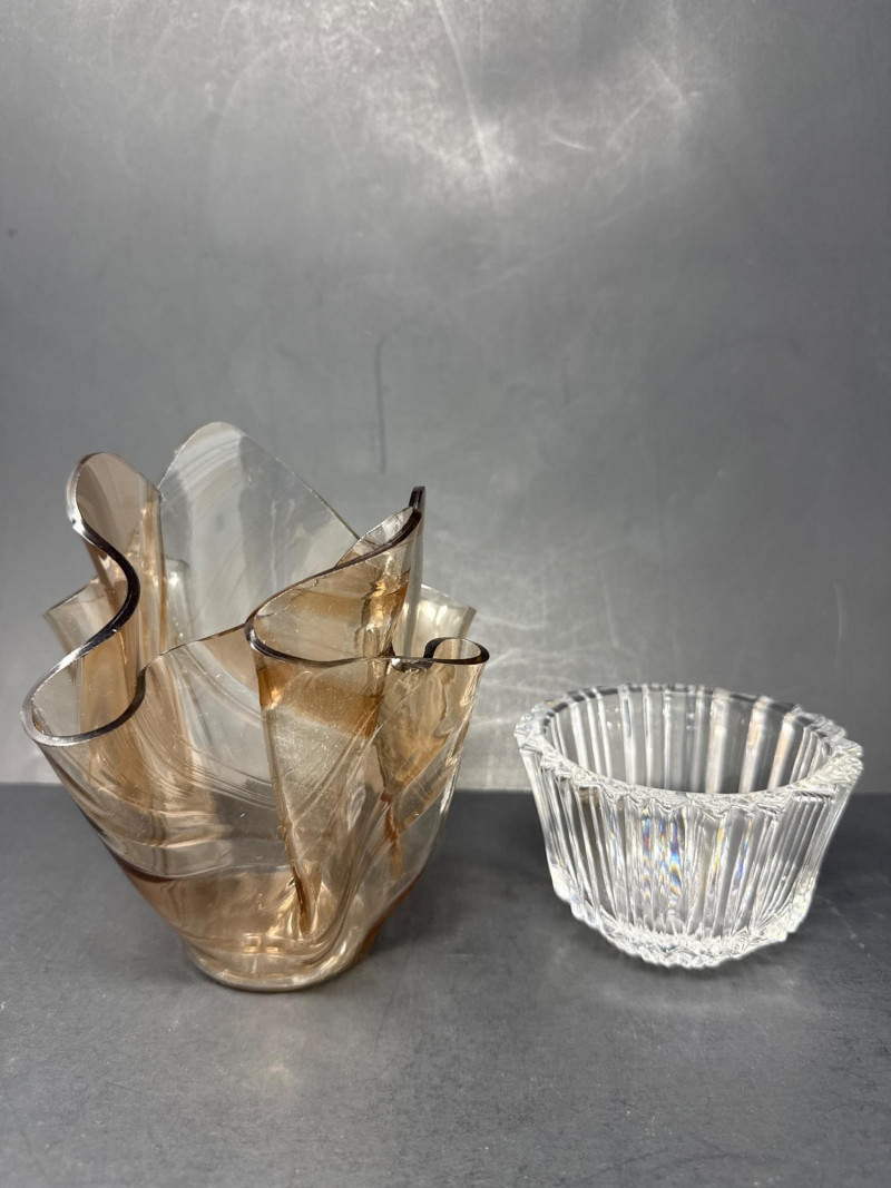 Kosta Koda Bowl: clear glass bowl with vertical ridges and a symmetrical, cylindrical profile. Kosta bowl dimensions are 4.25 inch wide, 2.75 inch tall. Visual contrast: the two pieces contrast in color (brown tint vs clear) and style (organic, sculptural form vs regular, ridged geometry), highlighting different approaches to glass craftsmanship.