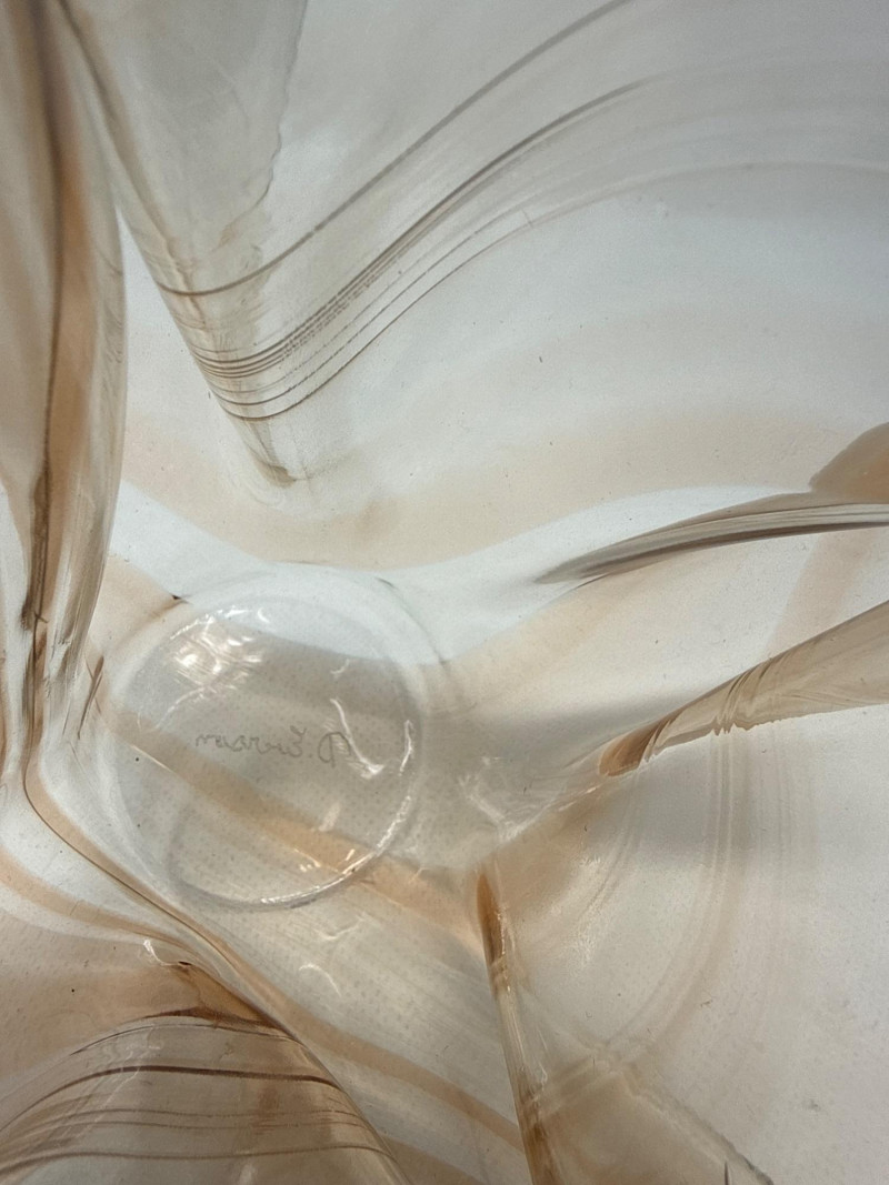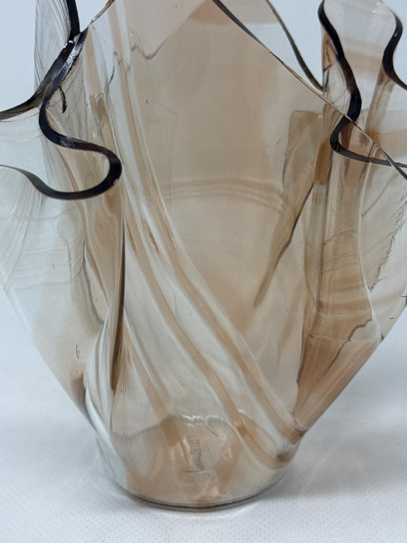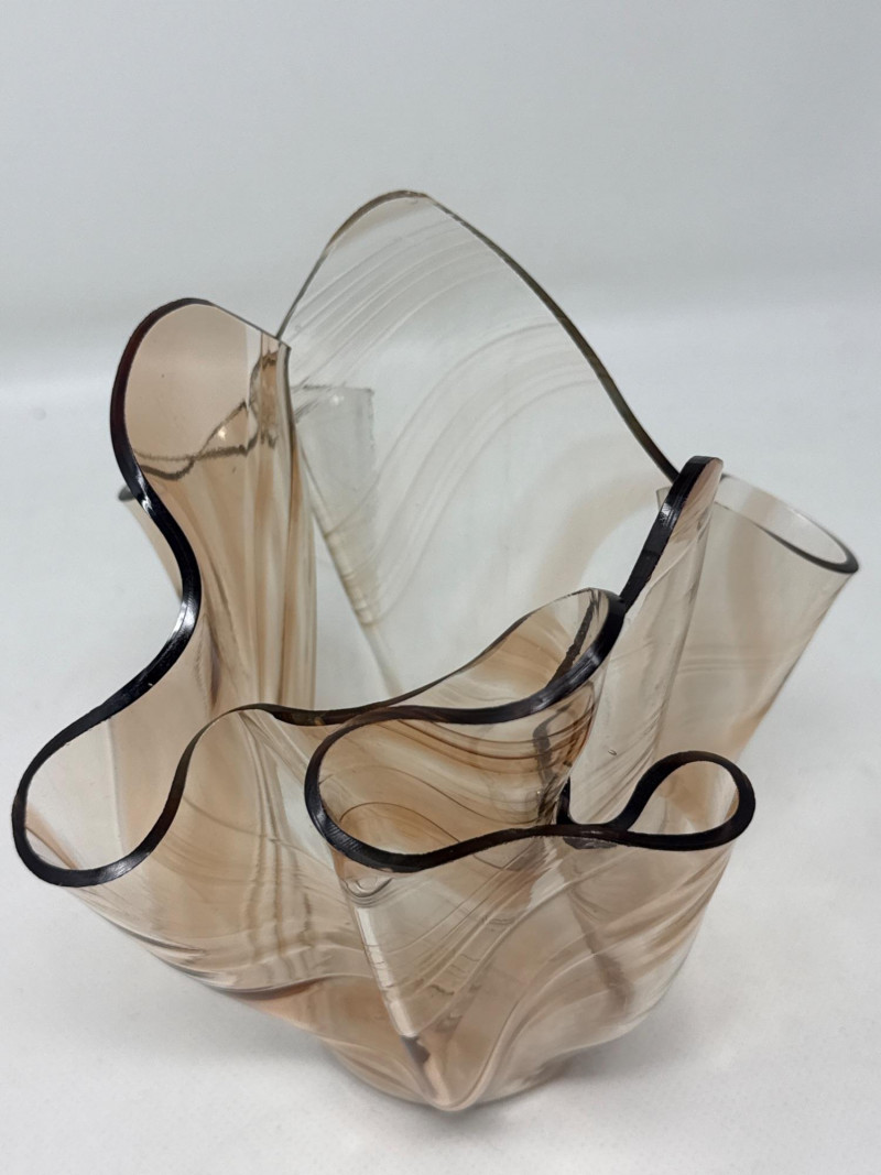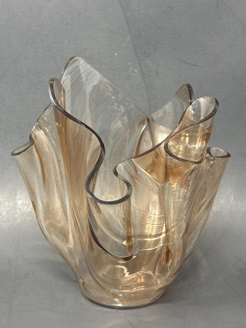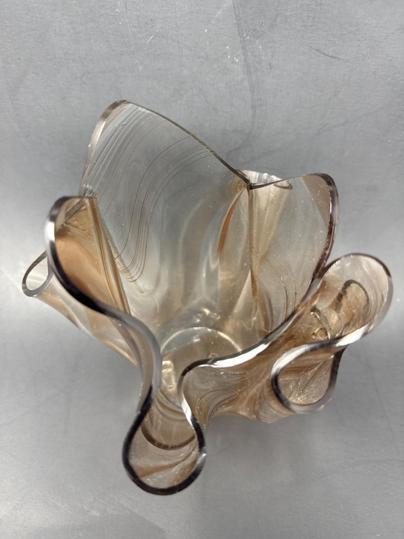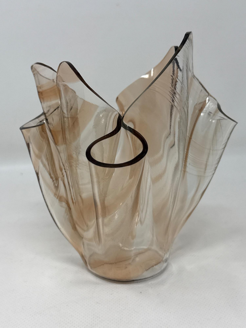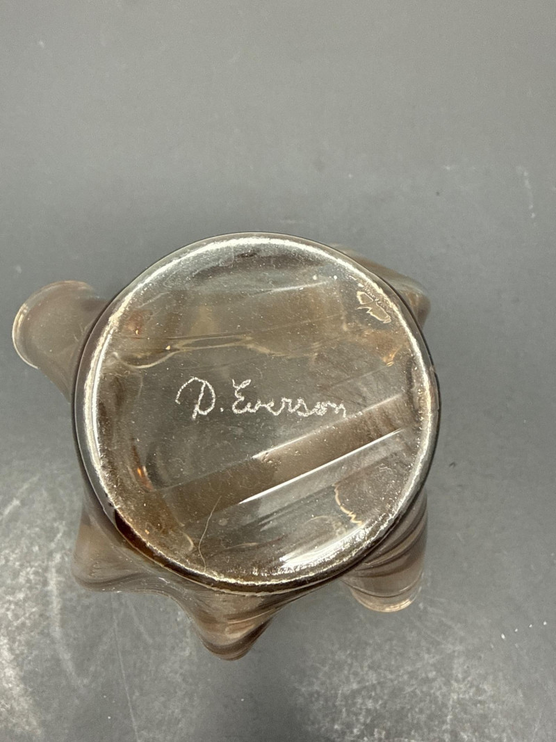 Two decorative glass collectibles. D. Everson: Brown‑tinted glass with an abstract, wavy, sculptural form that resembles a crumpled or folded shape. Peach tinted vase dimensions 6.75 inch tall, 7 inch wide.