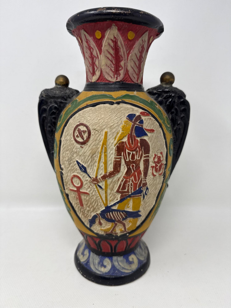 This ornate vase draws heavily from ancient Egyptian art and symbolism. The central motif features a regal figure dressed in traditional Egyptian attire, holding two iconic symbols: Ankh – representing life and immortality Staff – symbolizing authority and divine power Symbolic Elements: