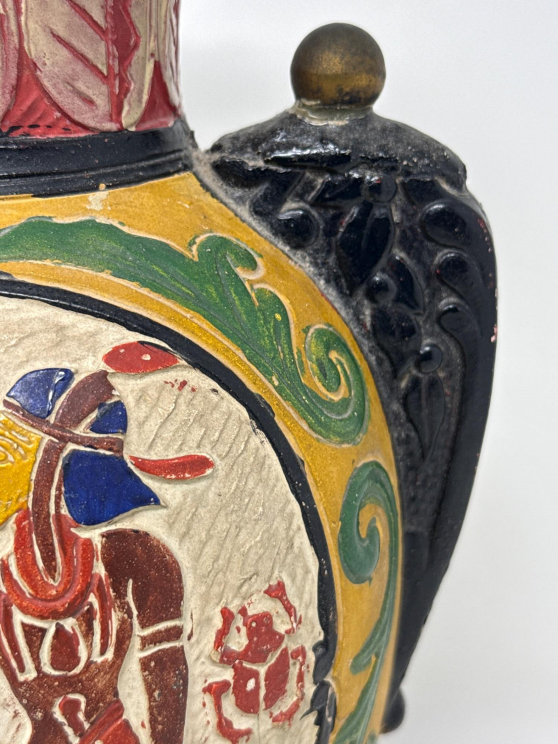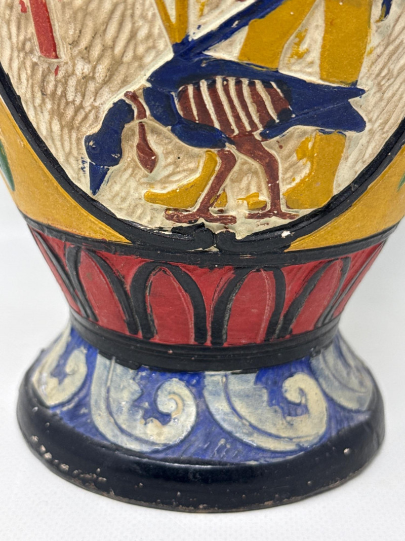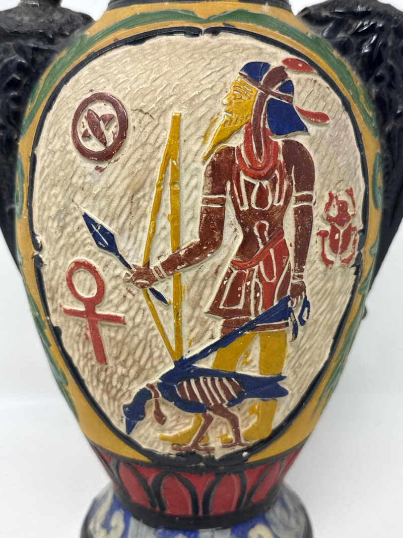 This piece is not only decorative but also educational, offering a visual narrative of ancient Egyptian beliefs and aesthetics. It would appeal to collectors of historical art, educators, or anyone with an appreciation for ancient civilizations. Signature not found. Made in JapanAncient Egyptian-Inspired Decorative Vase in the style of Gualdo Tadina Majolica from Italy.