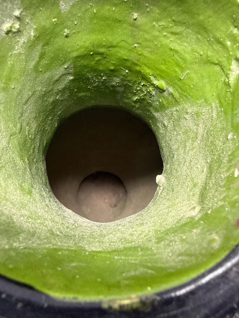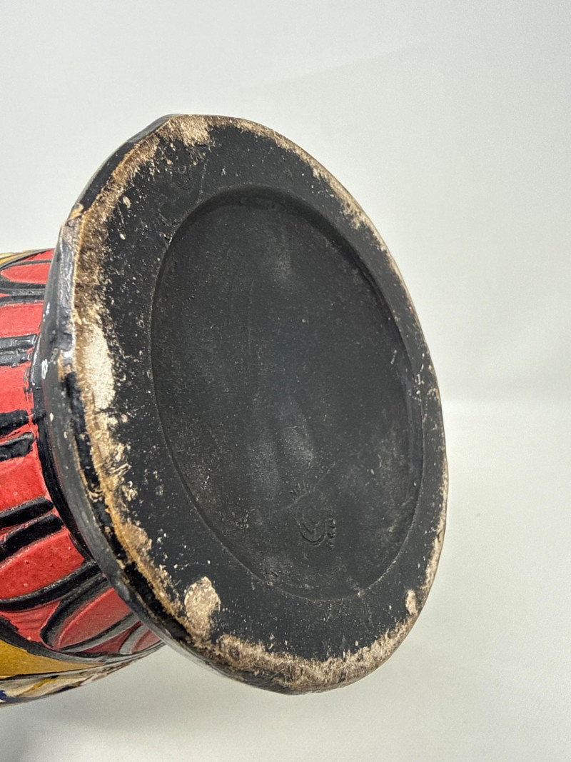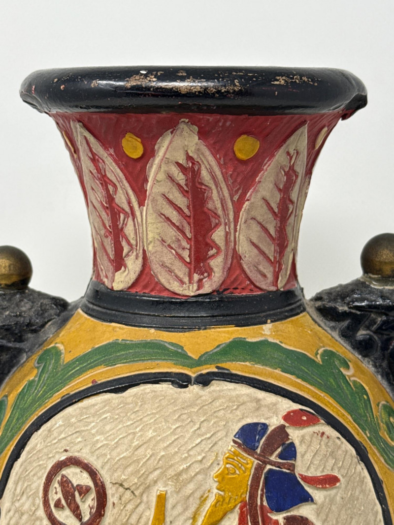 While the exact material isn't specified, the vase appears to be ceramic or clay with a semi-glossy finish, ideal for display in a curated collection or themed interior. Condition: Shows some age and wear. May be intentional or due to normal wear and use. Cultural Relevance: