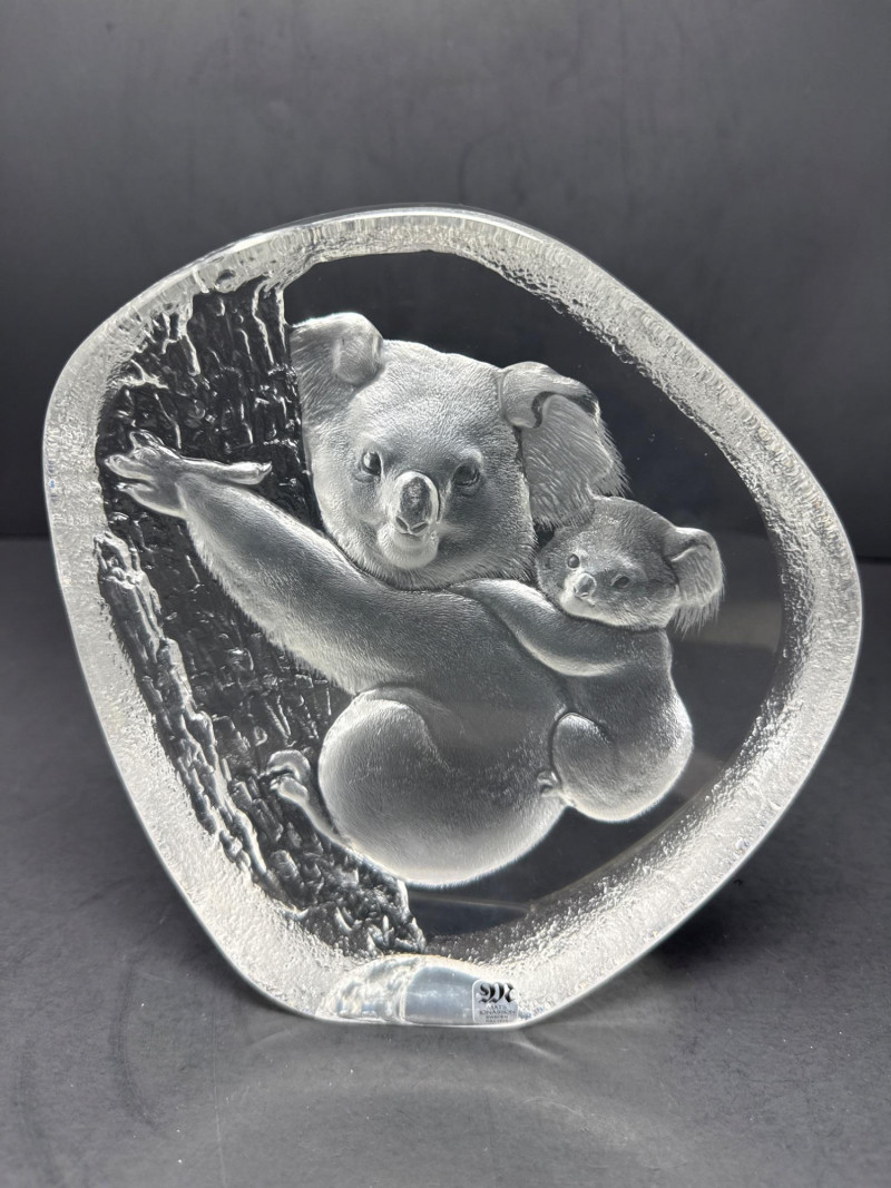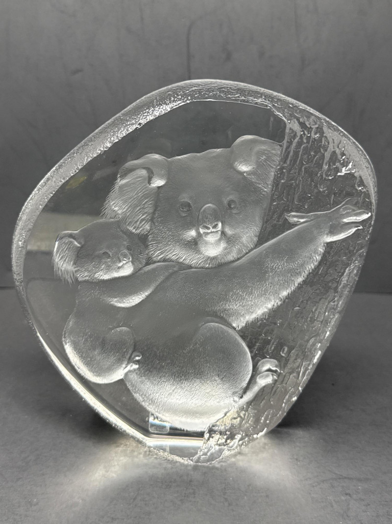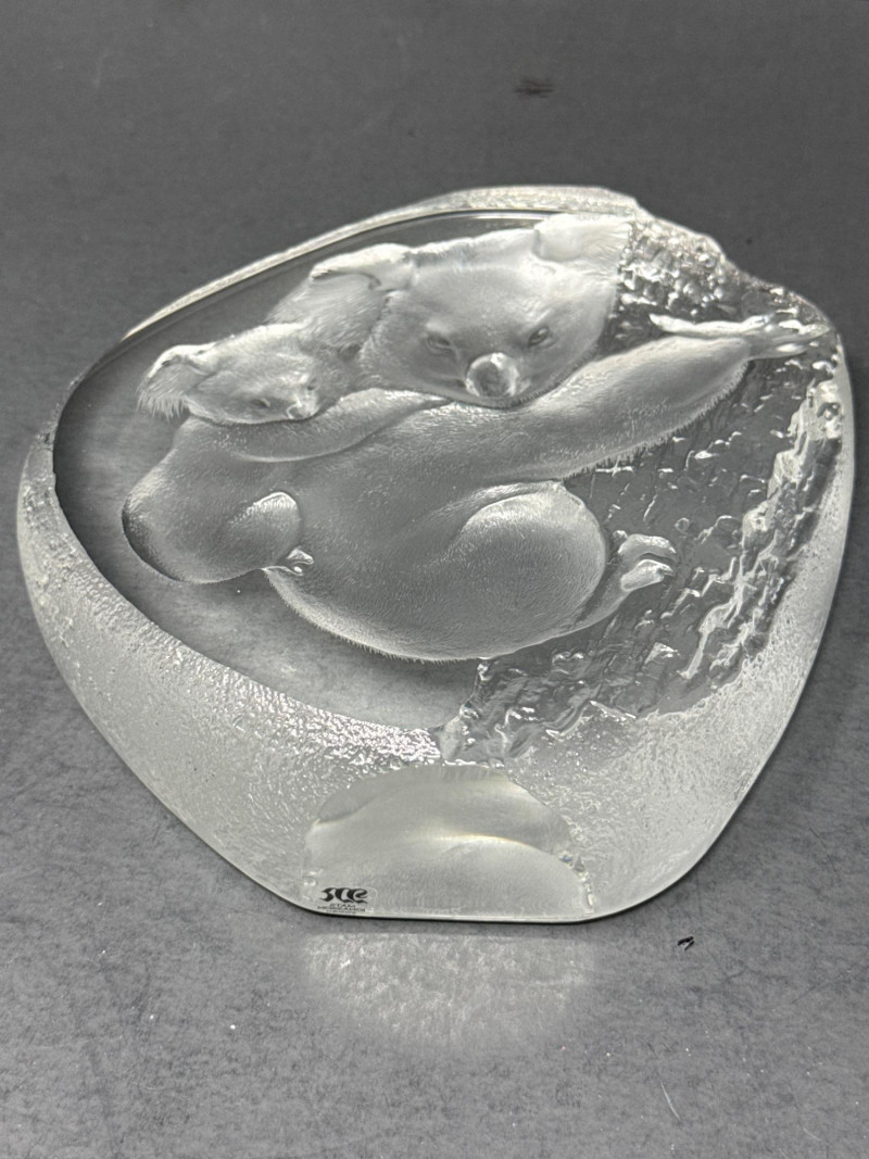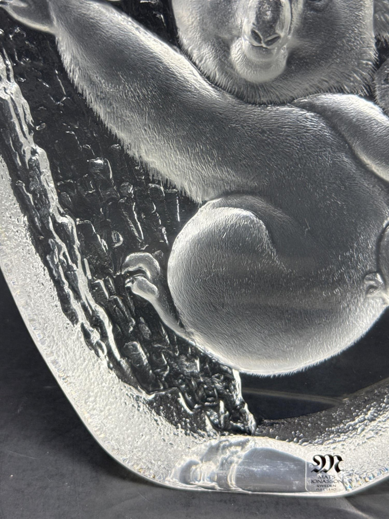 A clear glass or crystal sculpture depicting an adult koala climbing a tree with a baby koala clinging to its back. The composition centers on the two animals carved in relief within an irregular, organic block of glass framed by a frosted edge. Technique: Intricate internal engraving and etching create textured fur and bark; frosted edges provide contrast with the polished interior. Shape and Form: Asymmetrical, naturalistic block that emphasizes depth and three-dimensionality; the scene appears set slightly recessed from the outer surface. Marking: A small maker’s mark is visible at the base identifying the piece as Swedish art glass. Material: Clear crystal or high-quality glass with both polished and frosted surfaces. Finish: Smooth, glossy faces around the central scene; matte frosted rim that softens the silhouette. Condition: No visible chips or cracks in the photographed area; engraving details appear crisp. Includes original box Display: Best shown with directional lighting from above or behind to highlight internal etching and create subtle shadows that enhance the relief. A neutral or dark background will increase contrast and make the frosted edge stand out.
