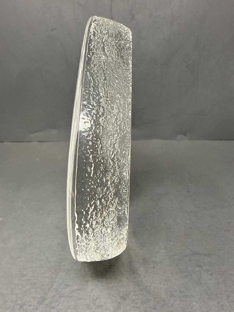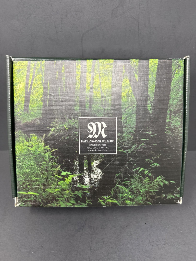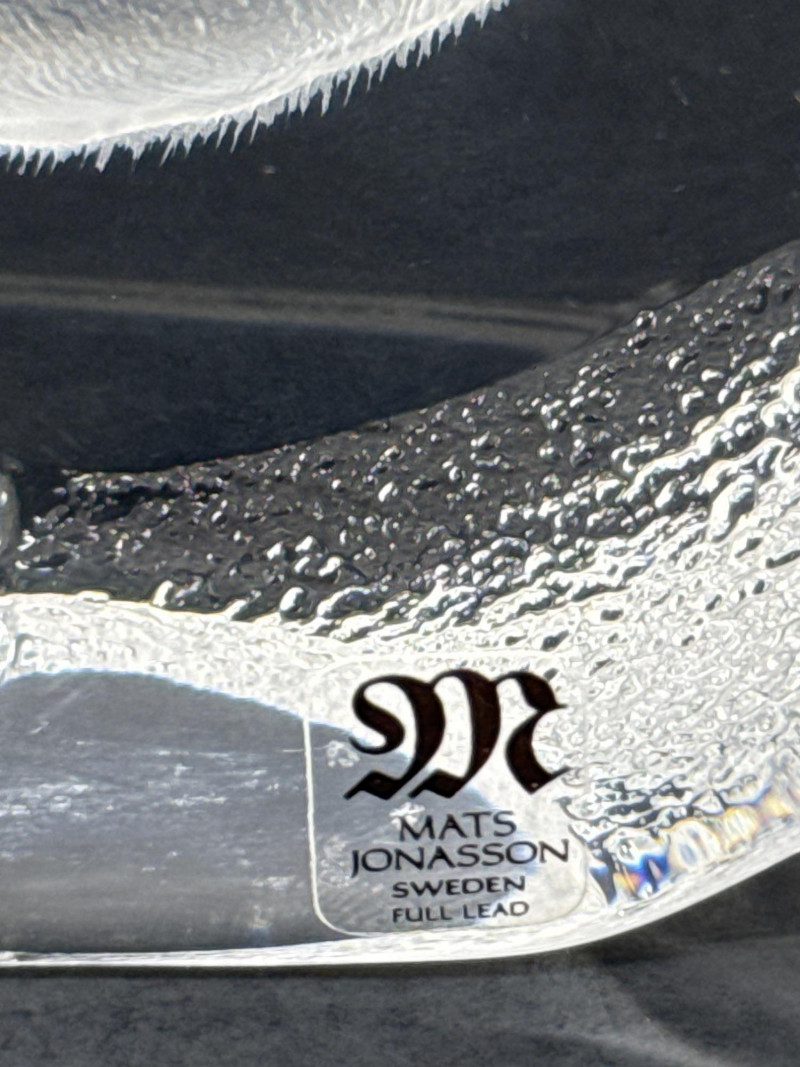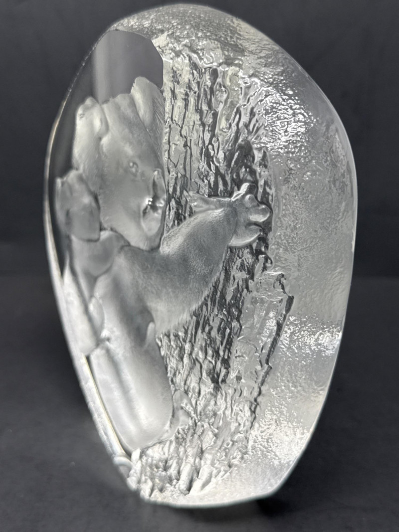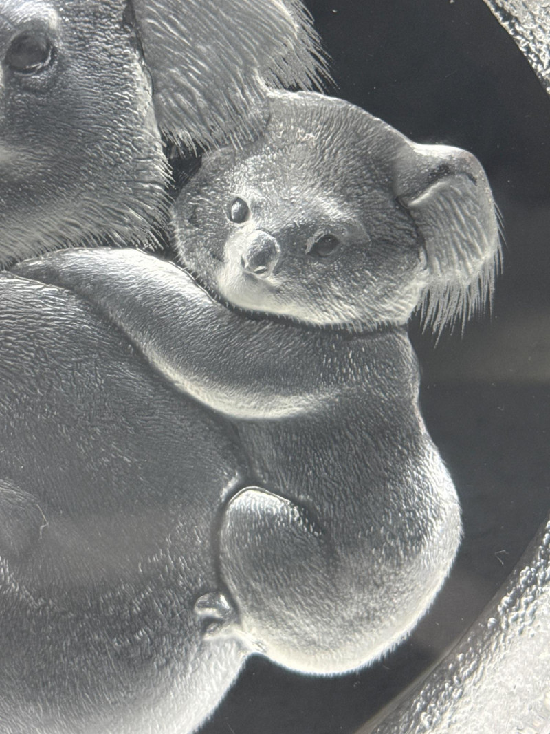 A clear glass or crystal sculpture depicting an adult koala climbing a tree with a baby koala clinging to its back. The composition centers on the two animals carved in relief within an irregular, organic block of glass framed by a frosted edge. Technique: Intricate internal engraving and etching create textured fur and bark; frosted edges provide contrast with the polished interior. Shape and Form: Asymmetrical, naturalistic block that emphasizes depth and three-dimensionality; the scene appears set slightly recessed from the outer surface. Marking: A small maker’s mark is visible at the base identifying the piece as Swedish art glass. Material: Clear crystal or high-quality glass with both polished and frosted surfaces. Finish: Smooth, glossy faces around the central scene; matte frosted rim that softens the silhouette. Condition: No visible chips or cracks in the photographed area; engraving details appear crisp. Includes original box Display: Best shown with directional lighting from above or behind to highlight internal etching and create subtle shadows that enhance the relief. A neutral or dark background will increase contrast and make the frosted edge stand out.