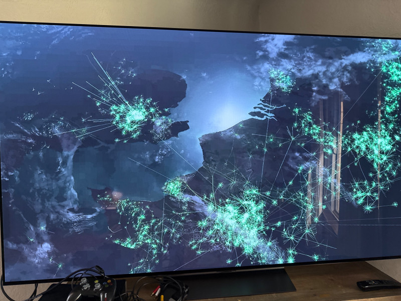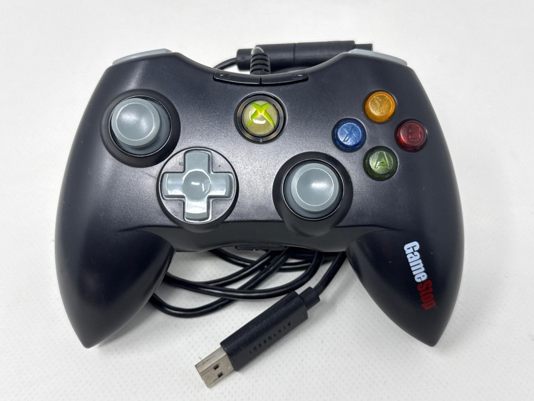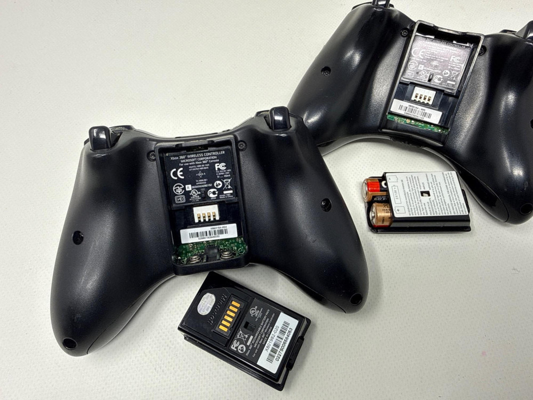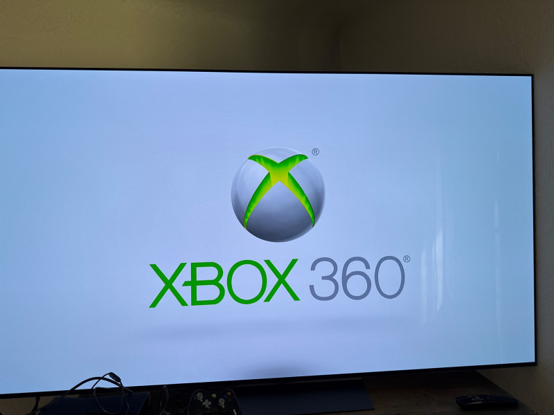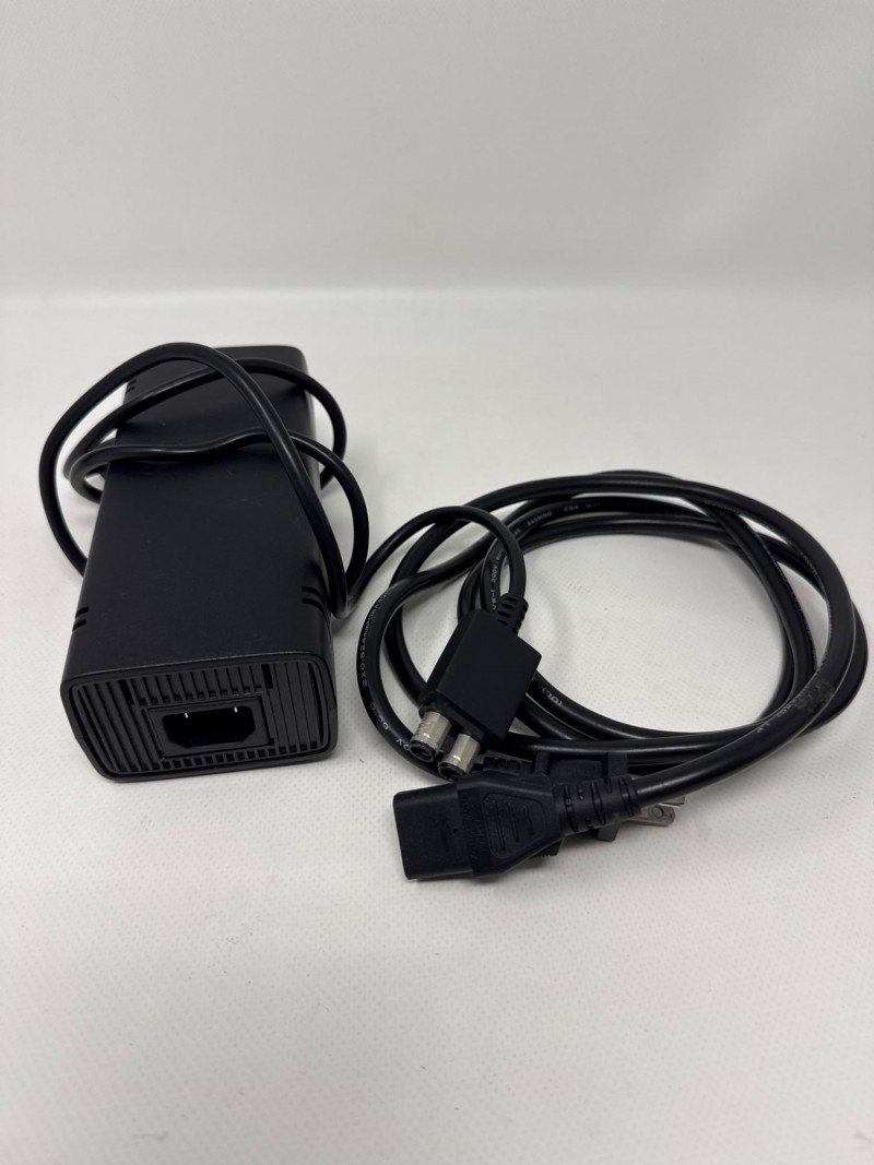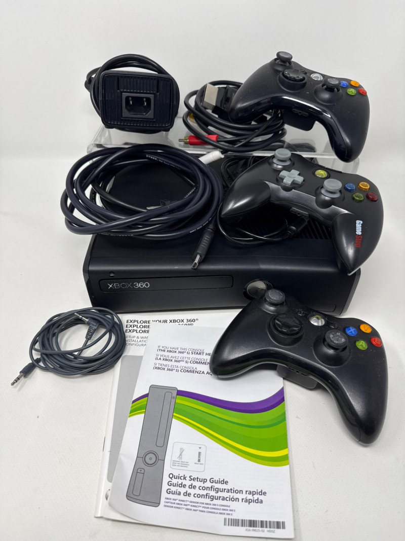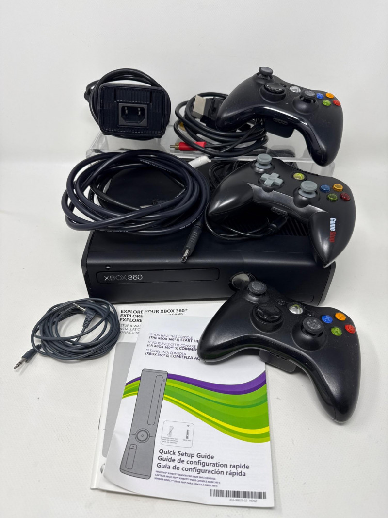 Powered up when connected to TV. Complete Xbox 360 console kit. Center-left is the console unit with the Xbox 360 logo visible on the front Included items: Three wireless controllers, one is standard Xbox 360 controllers and two are wireless. Power supply brick with its attached power cord. AV cables for connecting the console to a TV. Quick Setup Guide booklet, showing English, French, and Spanish headings. Wireless Controls were not tested. One has AAA batteries. The other is rechargeable. Did not have cord to charge. Notable details: The setup guide’s cover lists basic setup actions (installing games, networks, USB flash drive, hard drive) and includes the phrase "Quick Setup Guide" in three languages. All components look like original Xbox 360 hardware and accessories; items are laid out so each piece is clearly visible.