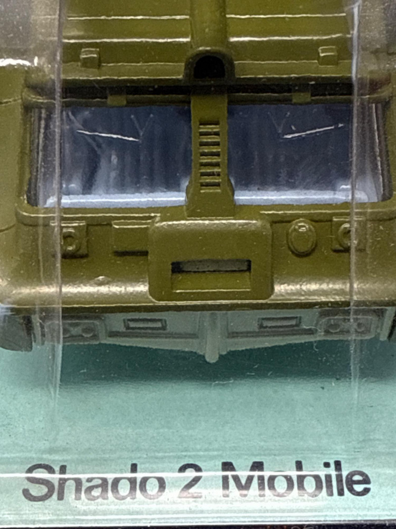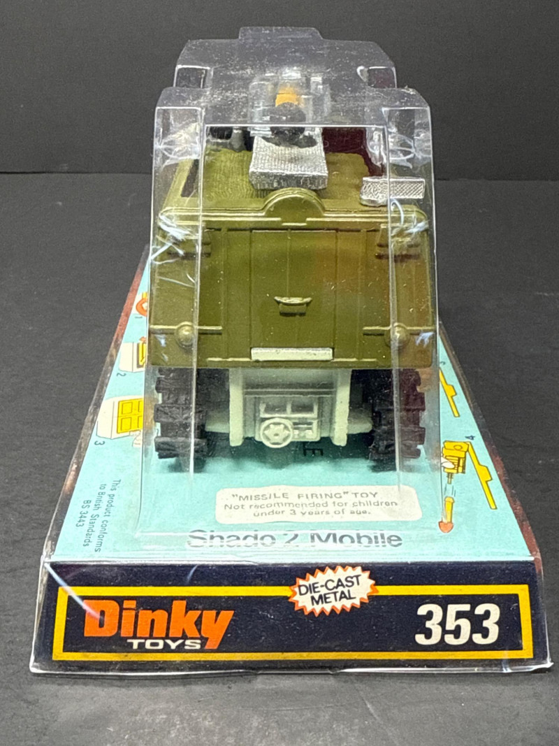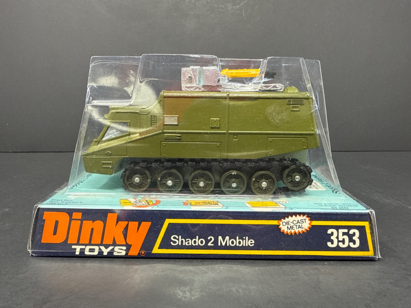 Vintage die-cast toy vehicle known as the "Shado 2 Mobile," produced by Dinky Toys as model number 353. This collectible piece is presented in its original packaging, which prominently displays the brand name in bold orange and white lettering, along with the model name and number in a yellow-bordered box. The packaging also notes the toy's "DIE-CAST METAL" construction. The vehicle itself is painted in a military-style olive green and designed with a tracked wheel system, showing six wheels on each side. It has a rugged, futuristic exterior with molded detailing and a small rotating turret or radar dome mounted on top. The design is inspired by the SHADO vehicles from the 1970s British sci-fi television series UFO, making it a desirable item for collectors of vintage toys and TV memorabilia. Its preserved condition and original box enhance its appeal and potential value.