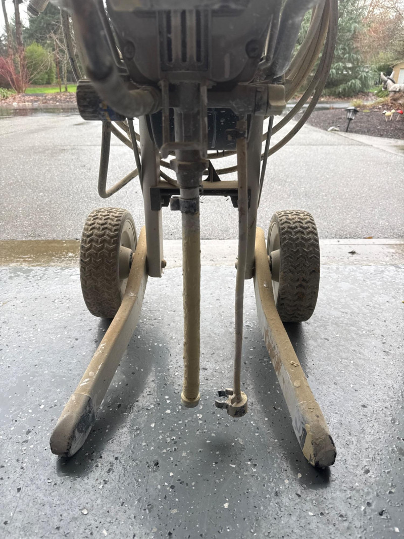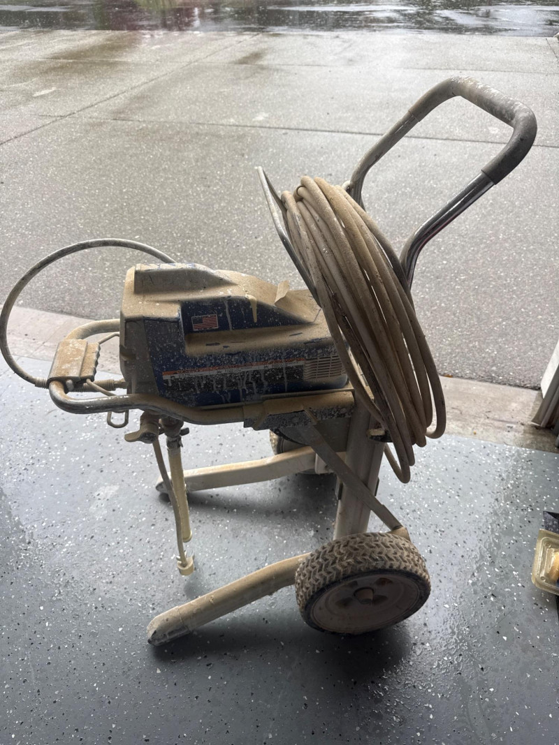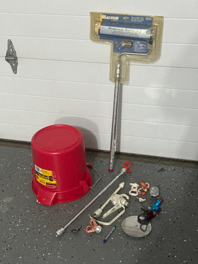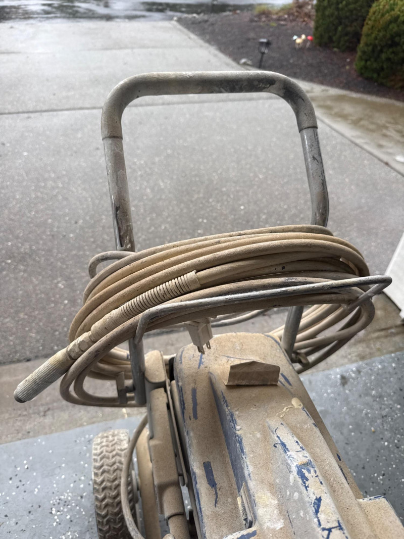 Condition and details: The unit shows visible paint residue and general wear; a long hose is coiled around the handle. Works well and has been maintained. Several accessories. New pressure roller in package. Several wands and sprayer adapters.