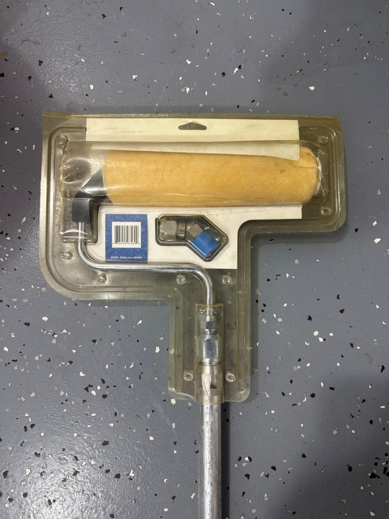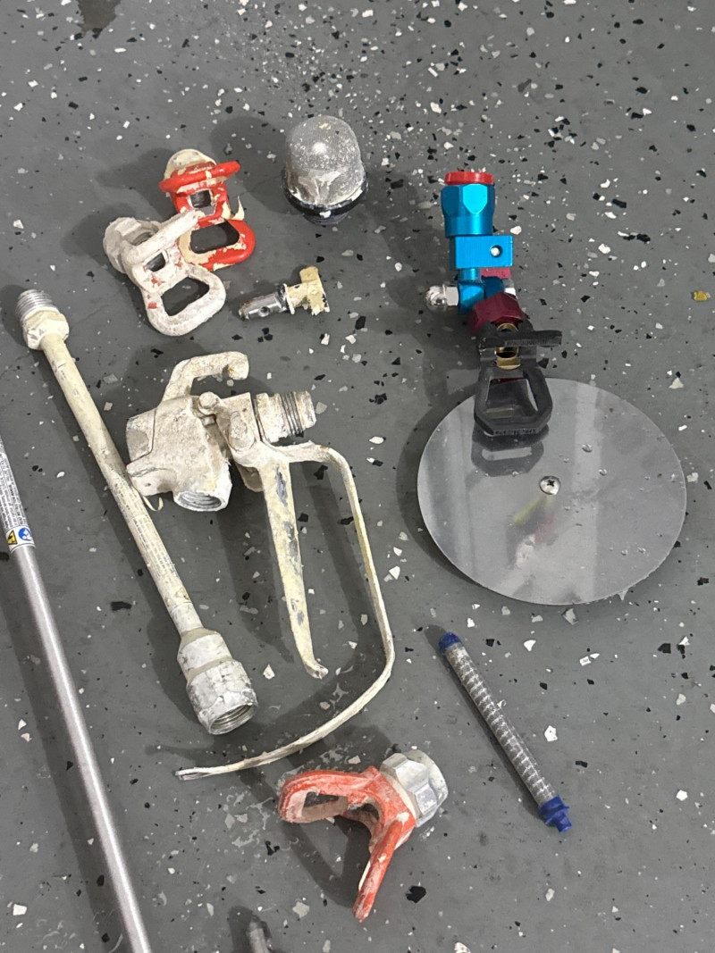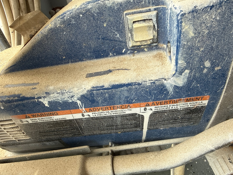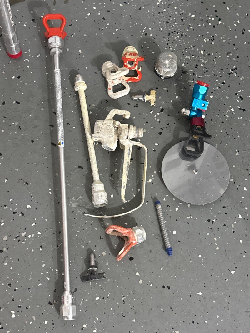 Condition and details: The unit shows visible paint residue and general wear; a long hose is coiled around the handle. Works well and has been maintained. Several accessories. New pressure roller in package. Several wands and sprayer adapters.