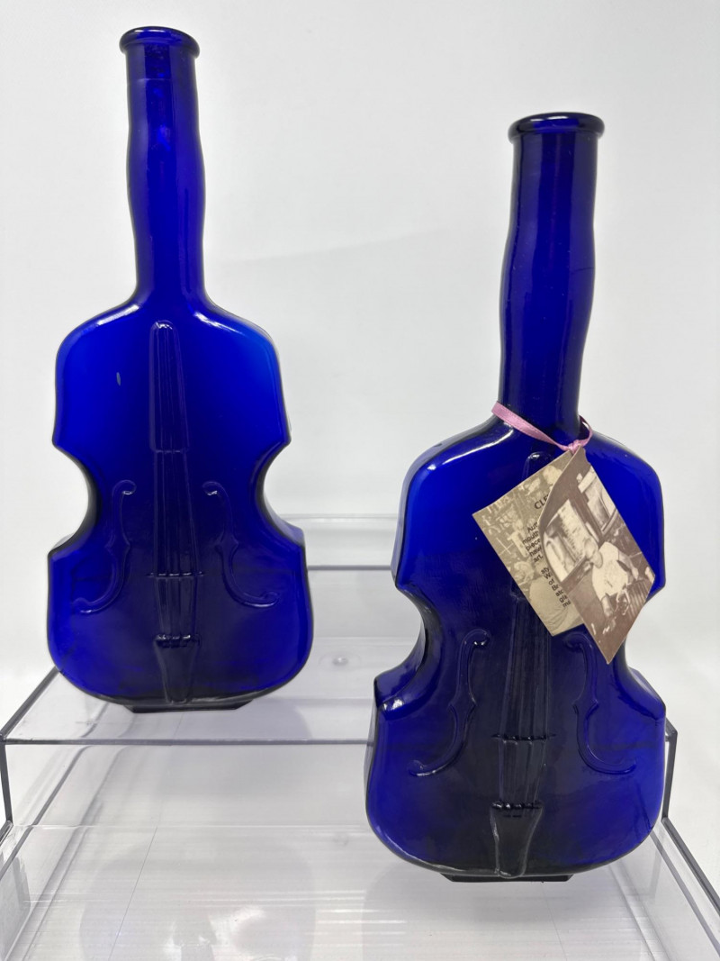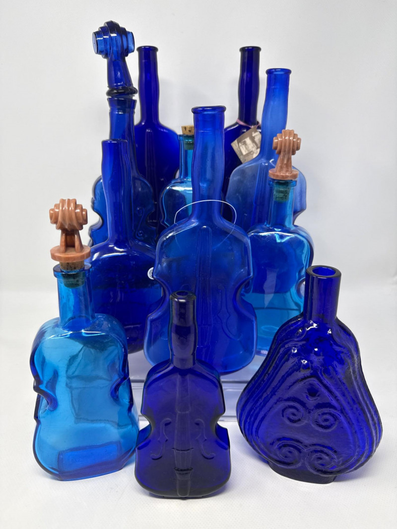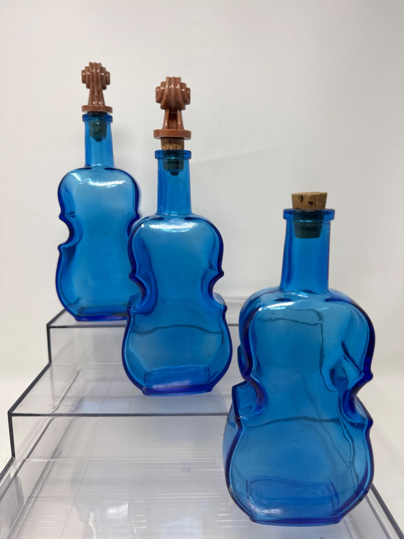 The bottles range in color from pale blue to deep cobalt, and several include intricate details such as embossed or molded strings and scrolls that mimic real instruments. Two bottles are sealed with cork stoppers shaped like violin scrolls.