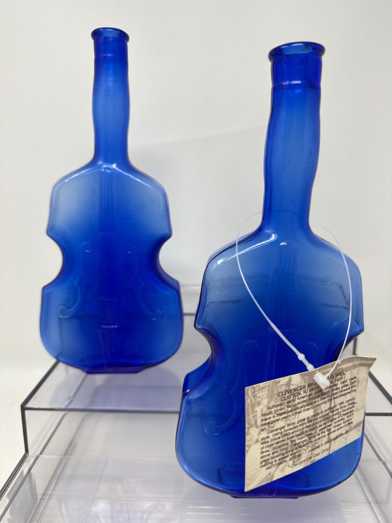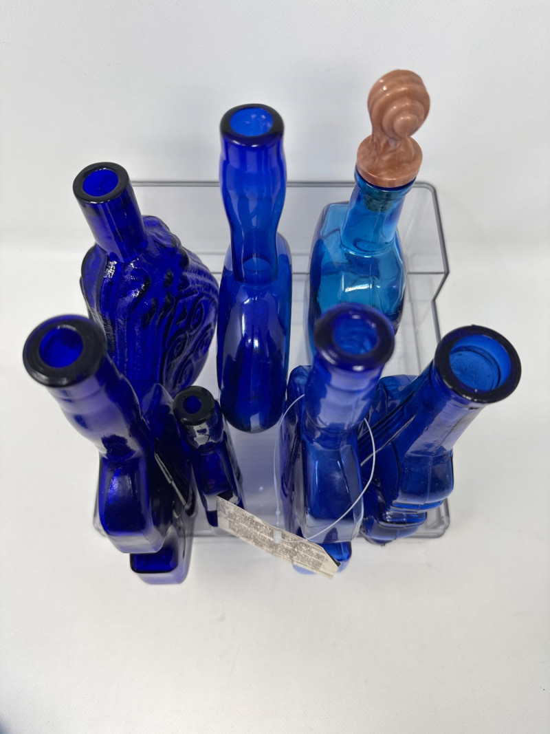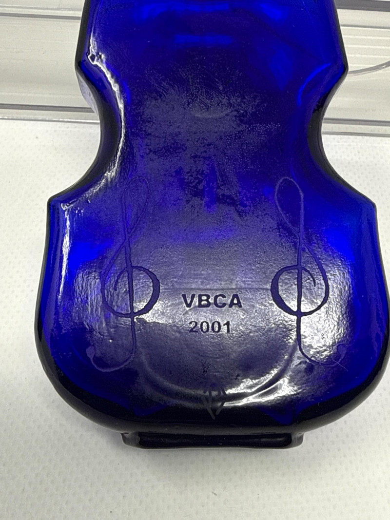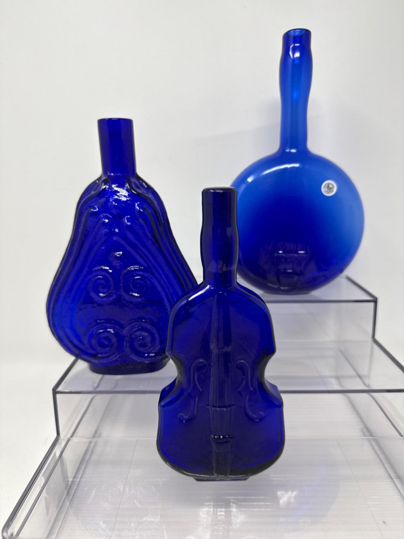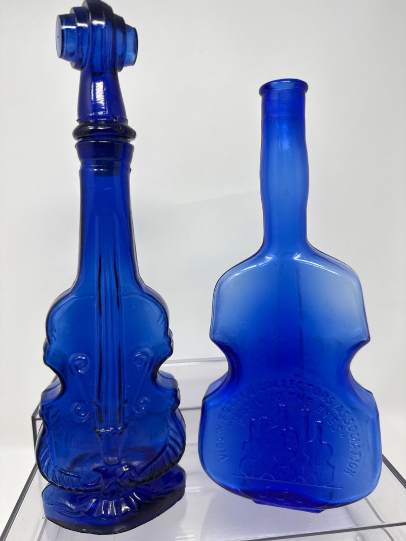Violin Bottle Collectors Association, Wheaton and Pairpoint makers. Three with stoppers. A collection of decorative blue glass bottles crafted to resemble musical instruments, mostly violins.