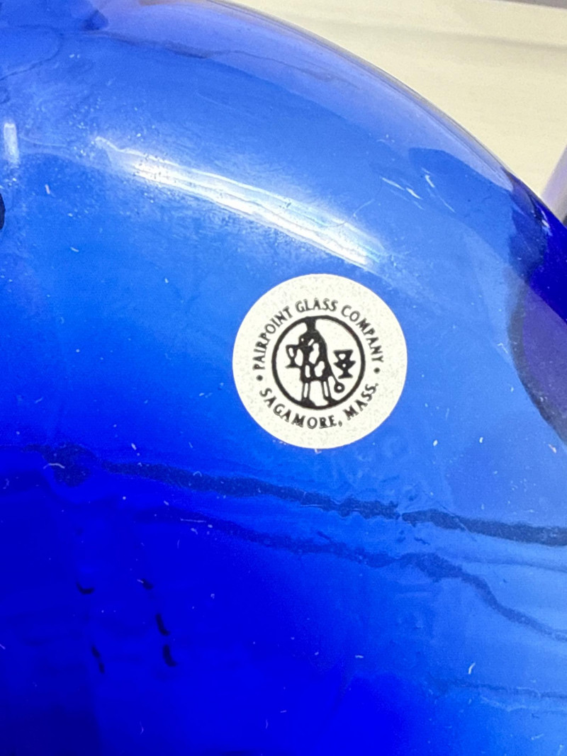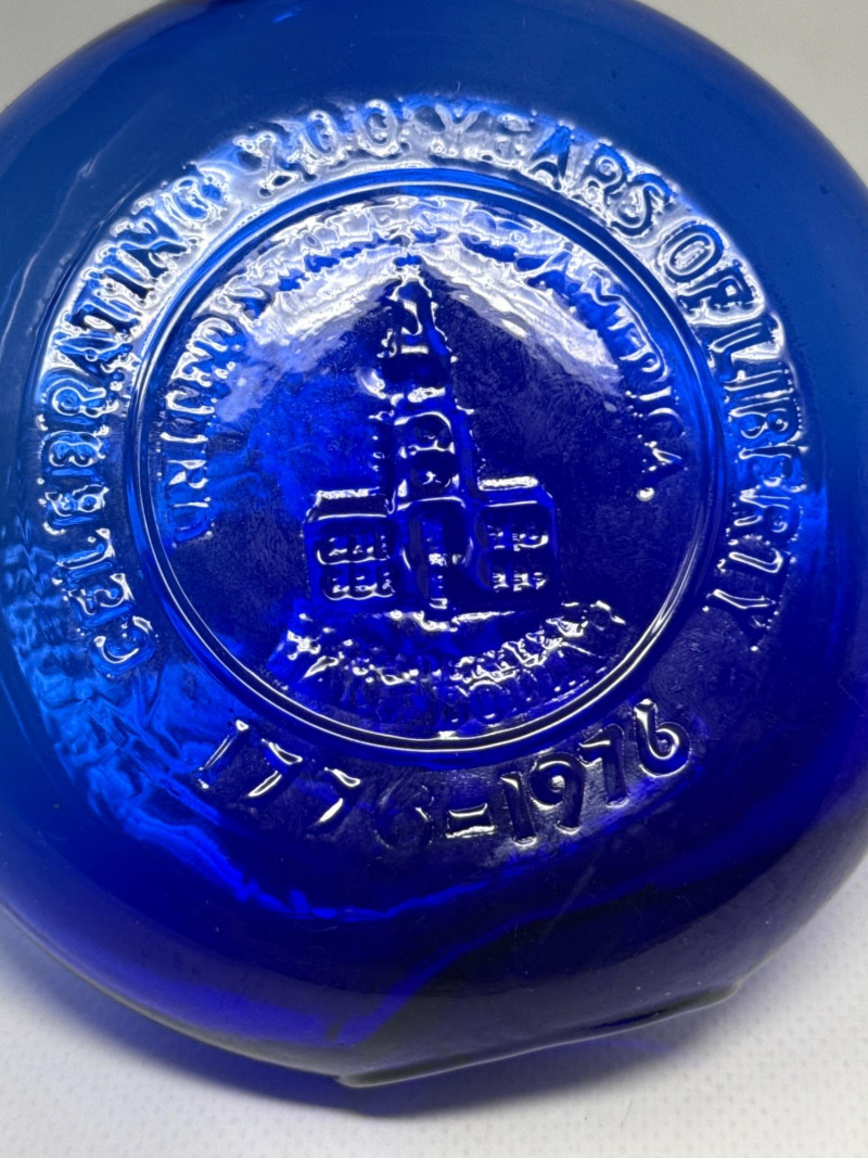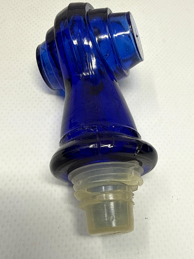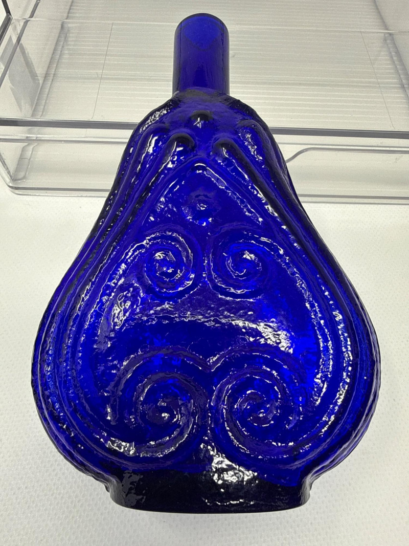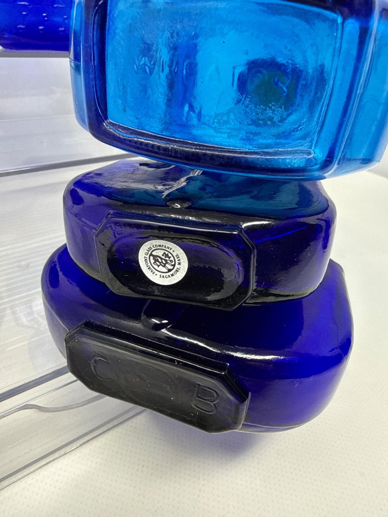 Violin Bottle Collectors Association, Wheaton and Pairpoint makers. Three with stoppers. A collection of decorative blue glass bottles crafted to resemble musical instruments, mostly violins.