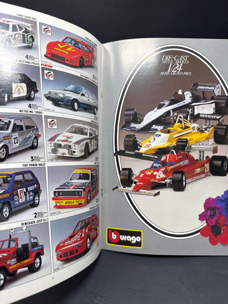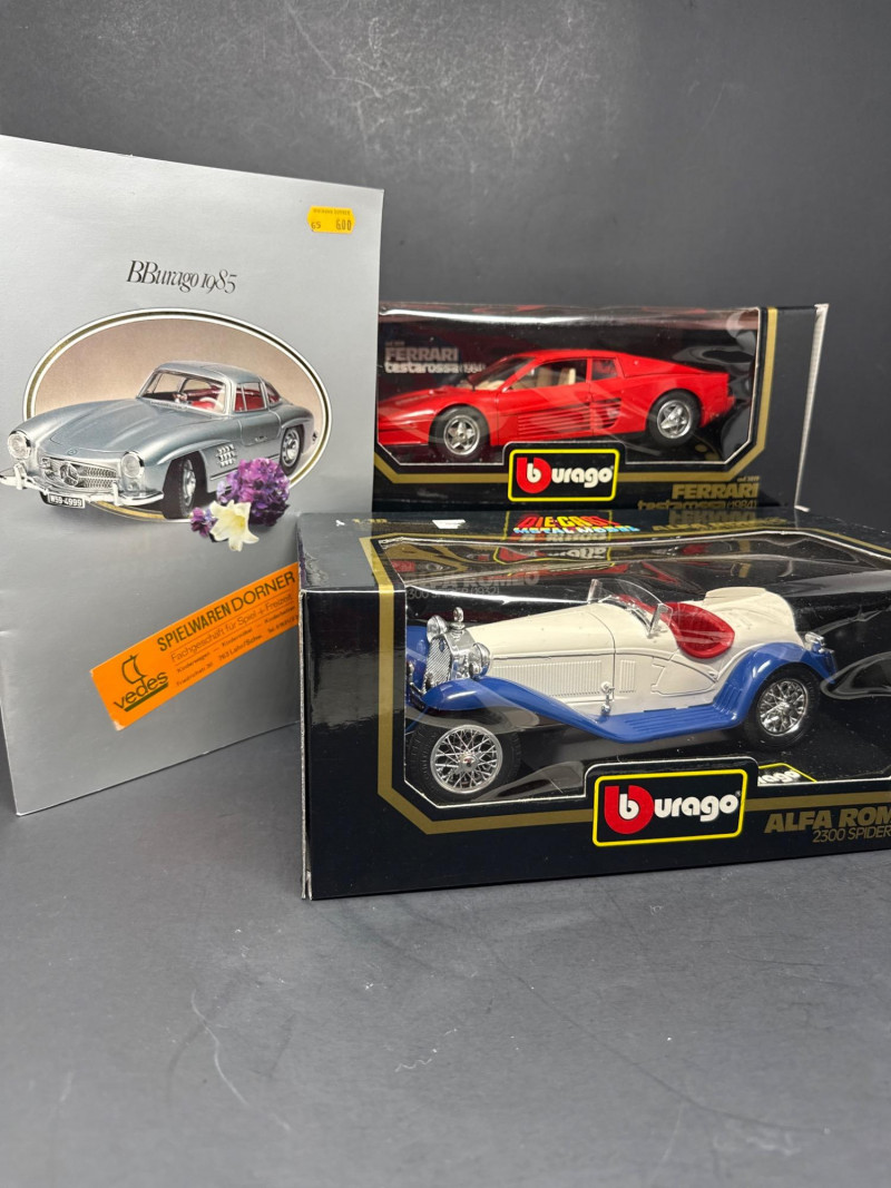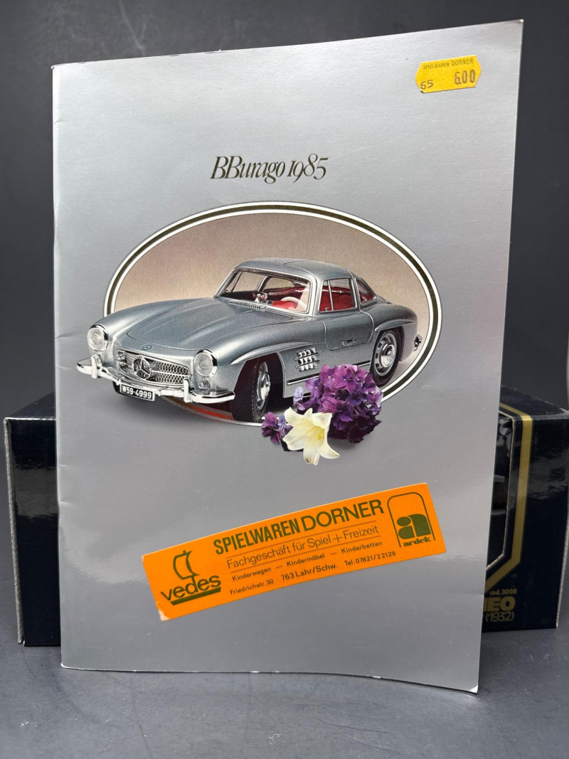Foreground item: A small catalog or booklet titled Burago 1985 showing a silver Mercedes‑Benz 300SL on the cover. Die cast metal 1/18 scale. Has some plastic components.