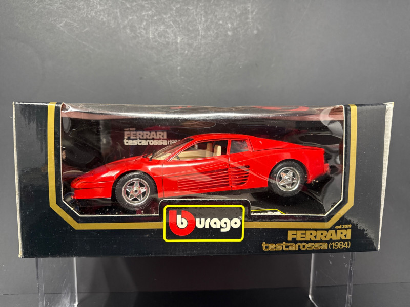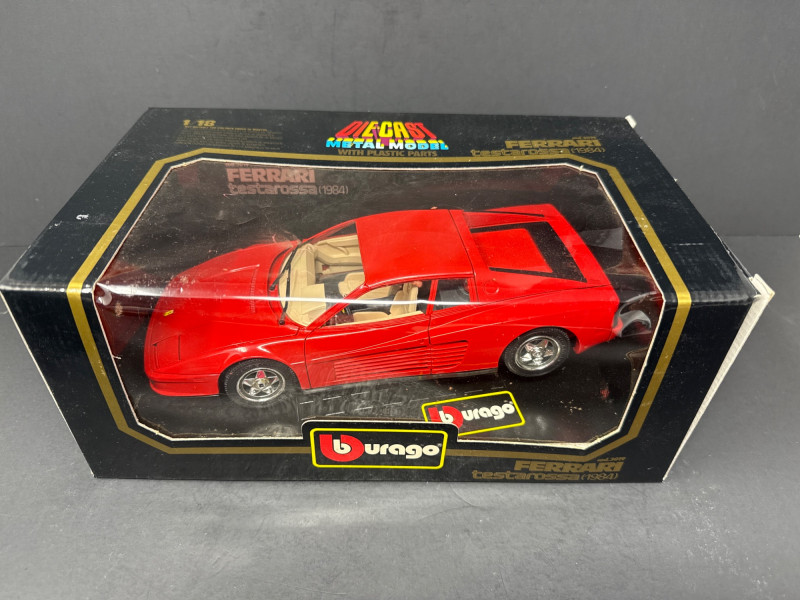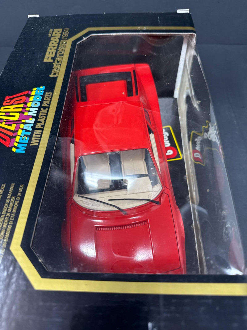 A tabletop display of vintage Burago model-car collectibles Left item: Boxed red Ferrari Testarossa 1984 model in original Burago packaging; the car is visible through a clear plastic window.