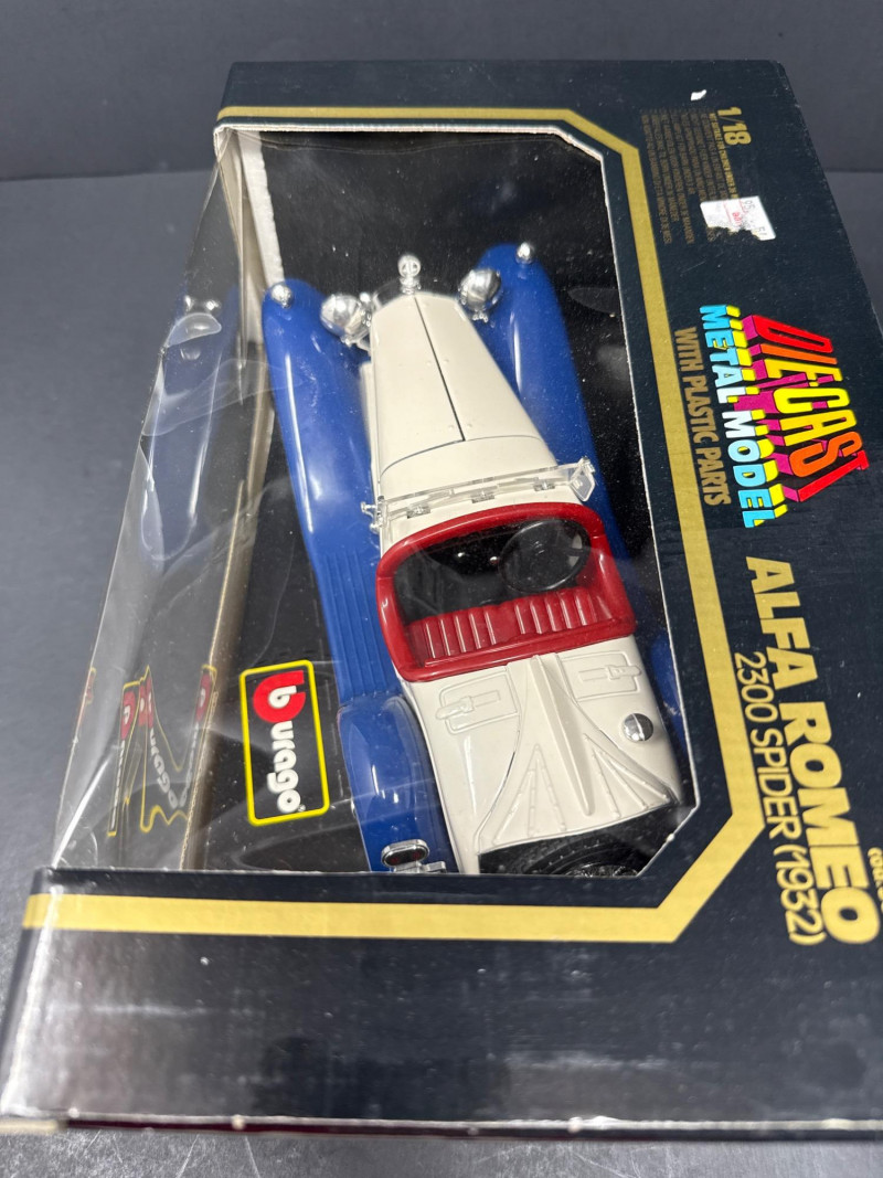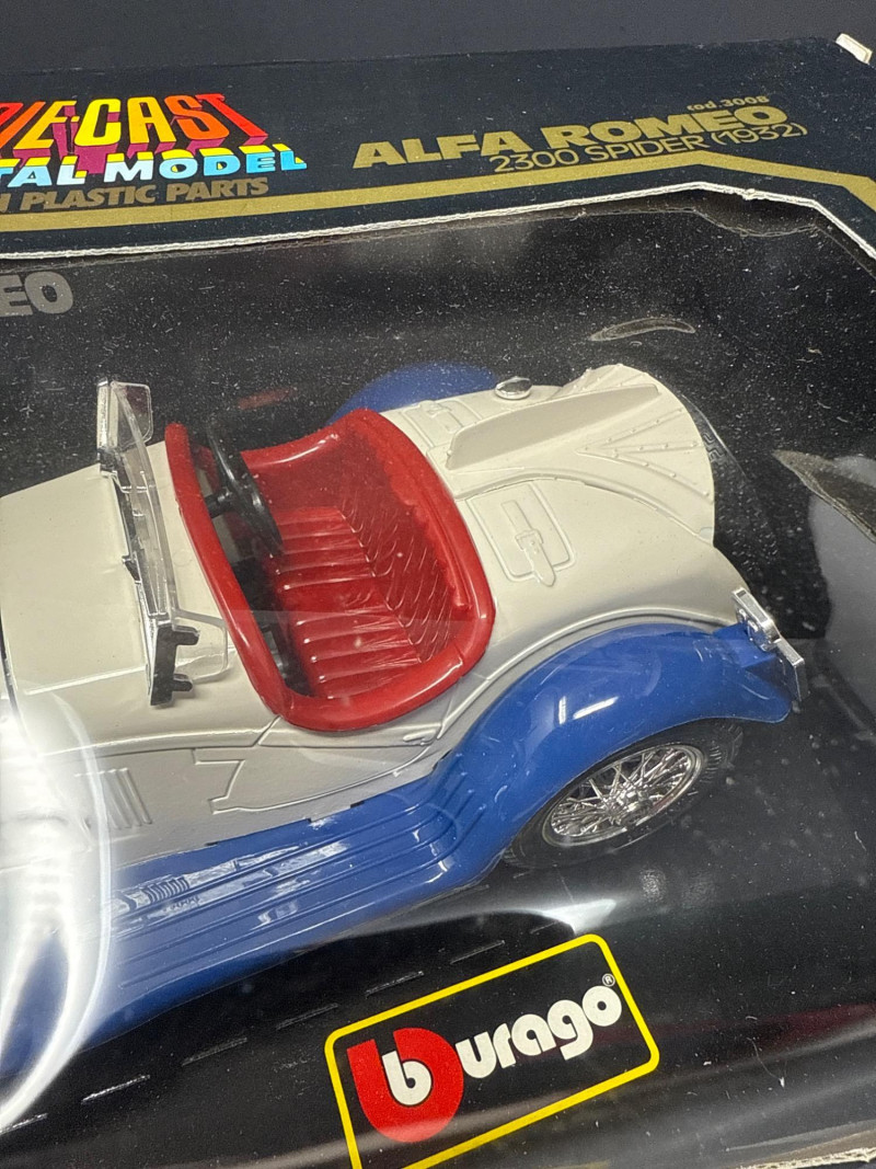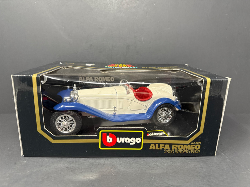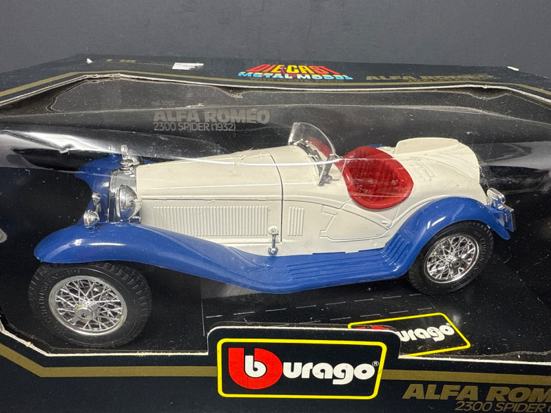 Right item: Boxed white-and-blue Alfa Romeo 2300 Spider Touring model, also in Burago packaging with a clear window.