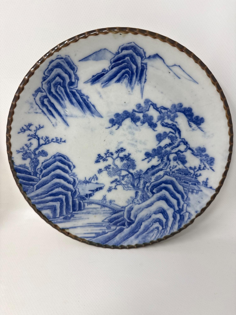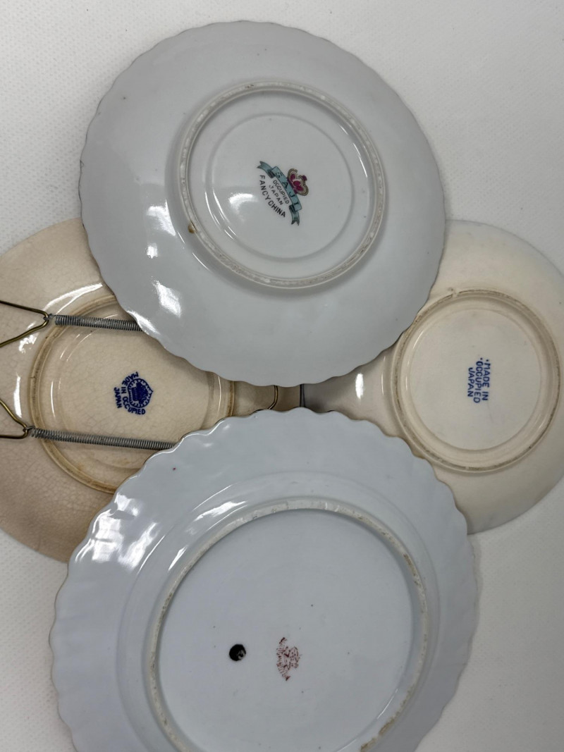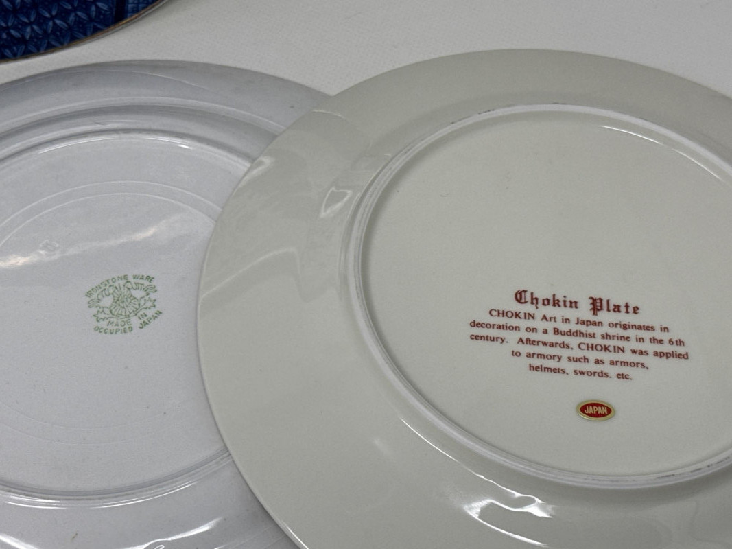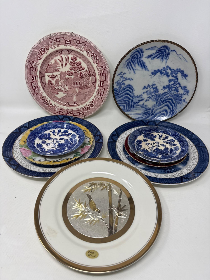 Mixed variety of collector plates. One with 24 karat gold detail. Two large blue and white are made in occupied Japan. One has a small chip on rim. Saji royal plate made in occupied Japan. Iron stoneware matching plates. Dessert plate with floral detail made in Nippon, Japan. Larger Red and white plate made in England by Willow WR midwinter Berslam. Collector plate with ruffled edge very old. Two matching plates are 9.5 inches wide. 24 karat gold embellished plate 9 inches wide.