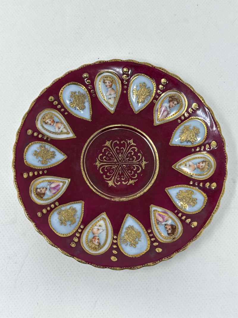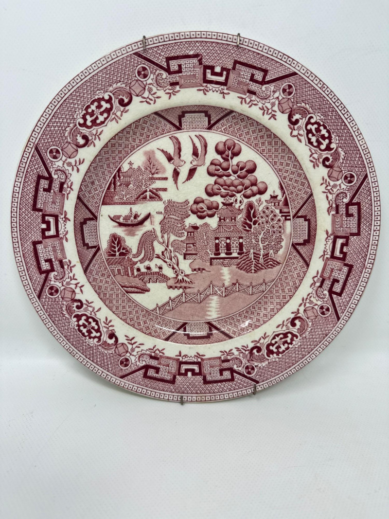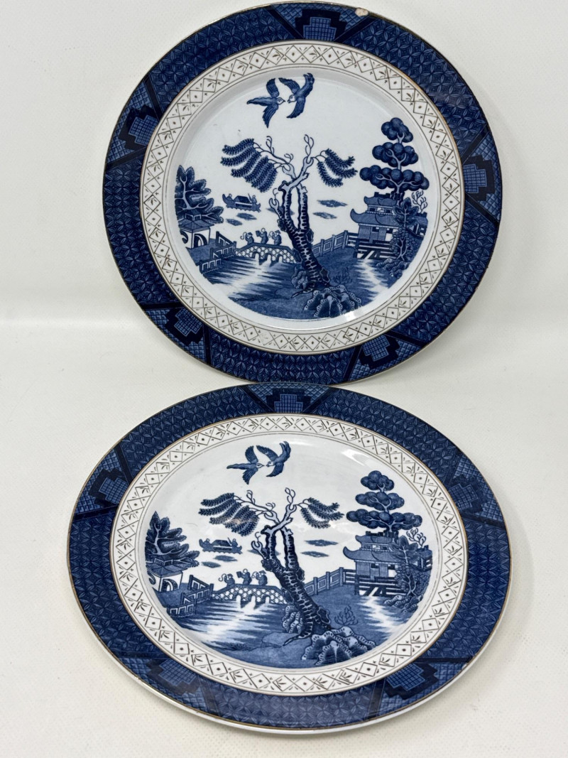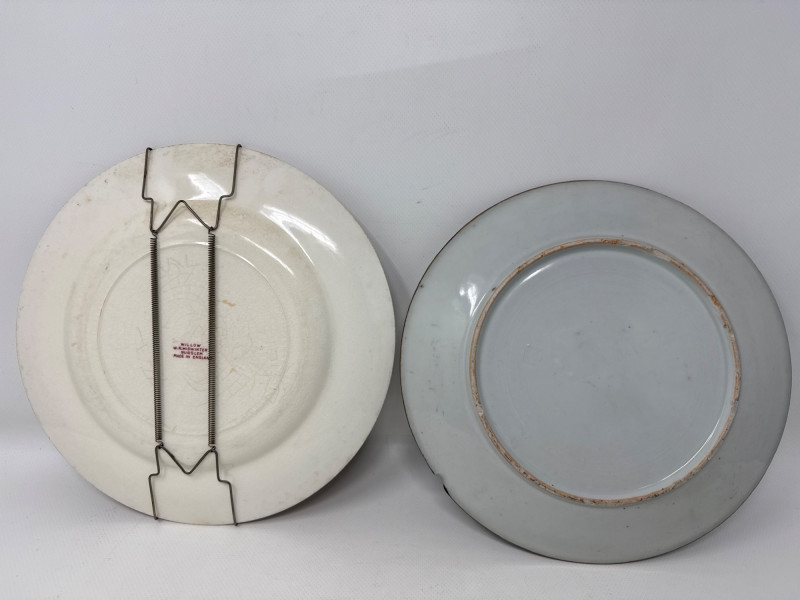 Mixed variety of collector plates. One with 24 karat gold detail. Two large blue and white are made in occupied Japan. One has a small chip on rim. Saji royal plate made in occupied Japan. Iron stoneware matching plates. Dessert plate with floral detail made in Nippon, Japan. Larger Red and white plate made in England by Willow WR midwinter Berslam. Collector plate with ruffled edge very old. Two matching plates are 9.5 inches wide. 24 karat gold embellished plate 9 inches wide.