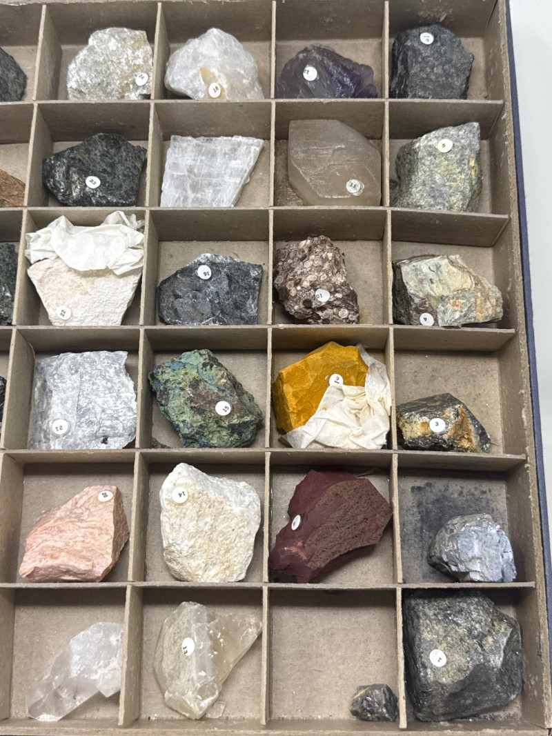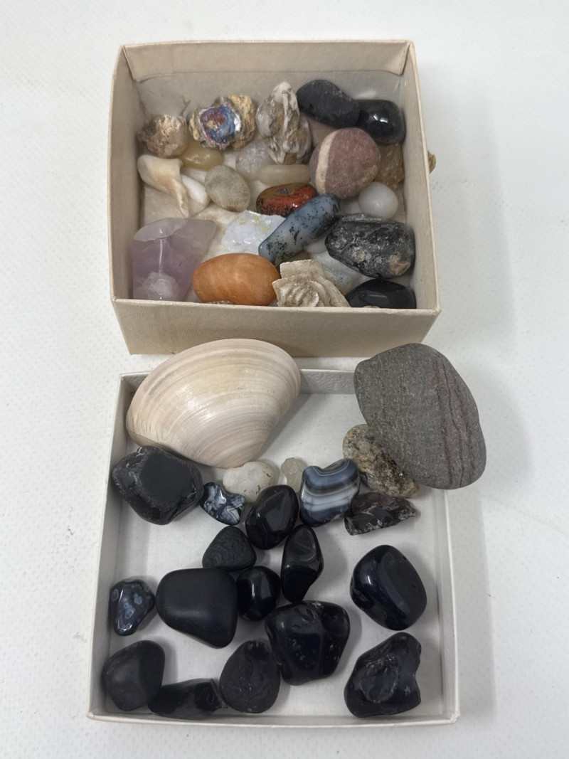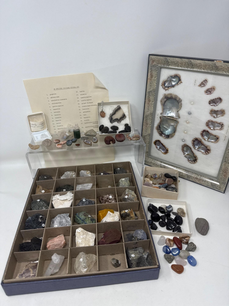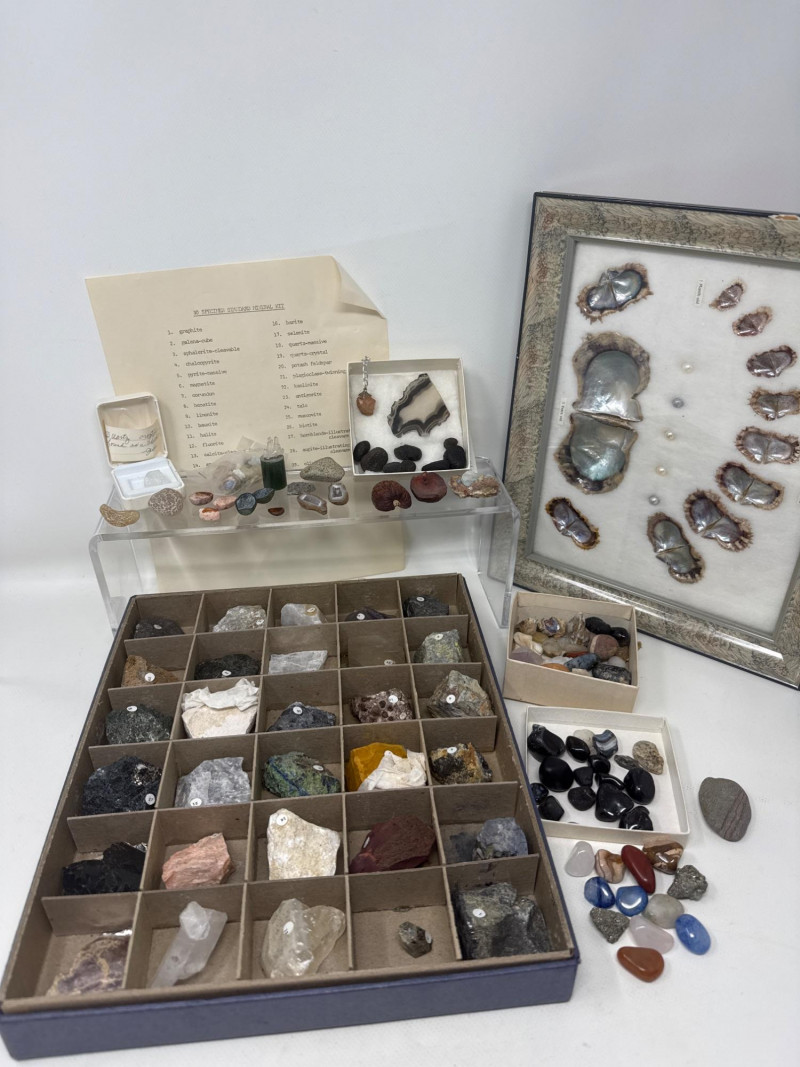 Large collection of polished and raw stones, minerals and organic deposits. Oyster and pearl framed collection. Frame has a blemish. Shows the life cycle of pearl an oyster Large, sorted box has numbered listing for easy identification. Smokey Topaz, geodes, pearls, quartz, limonite, graphite, selenite and more.