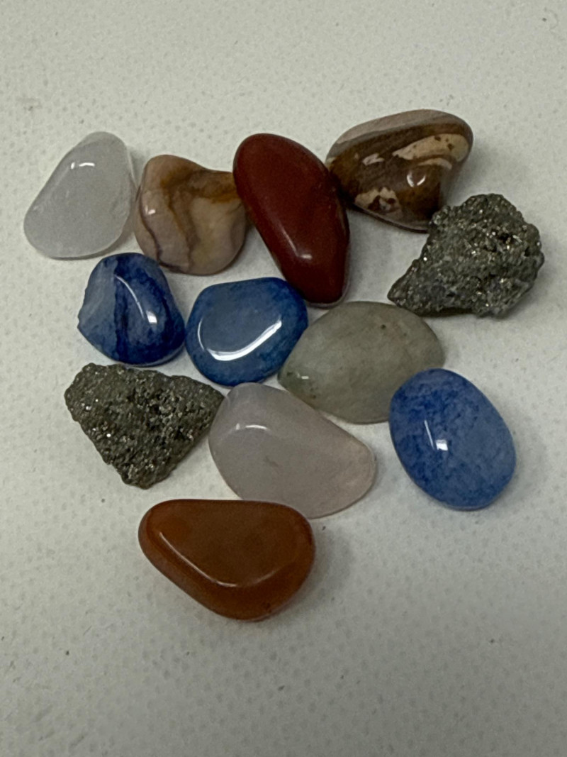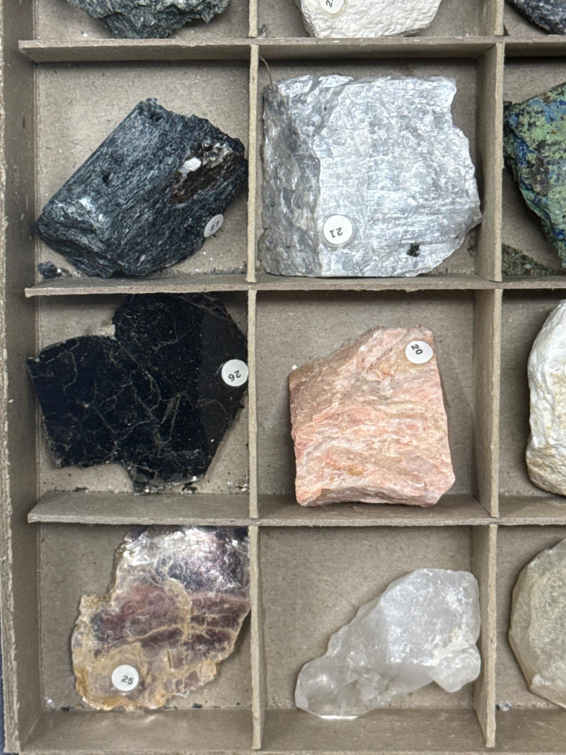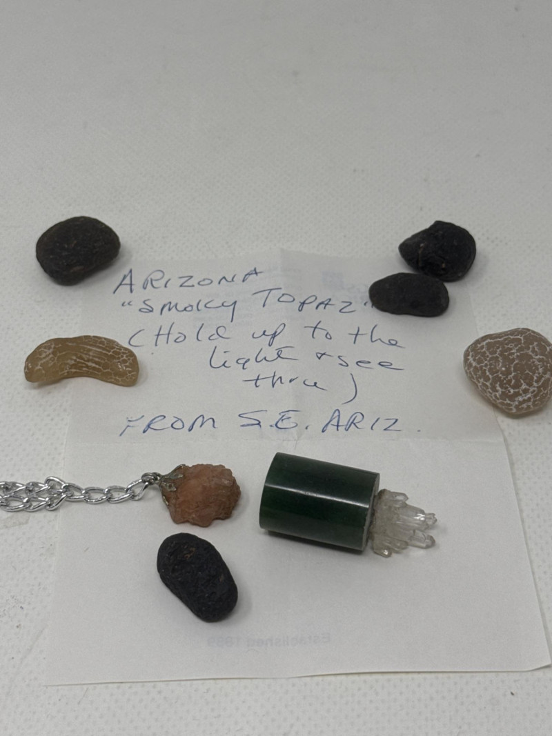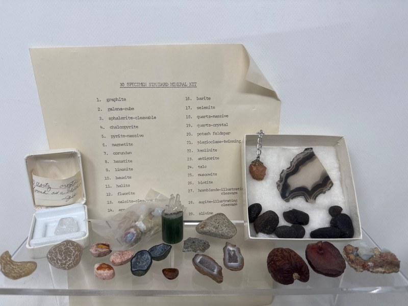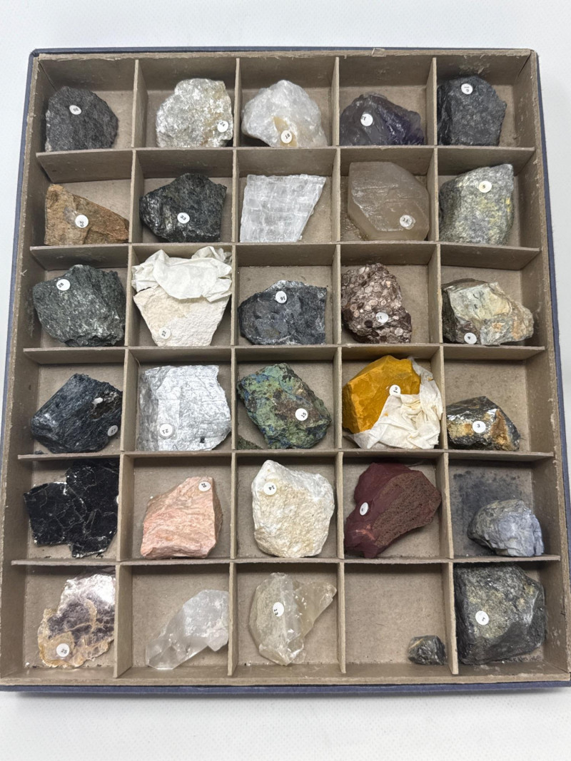 Large collection of polished and raw stones, minerals and organic deposits. Oyster and pearl framed collection. Frame has a blemish. Shows the life cycle of pearl an oyster Large, sorted box has numbered listing for easy identification. Smokey Topaz, geodes, pearls, quartz, limonite, graphite, selenite and more.