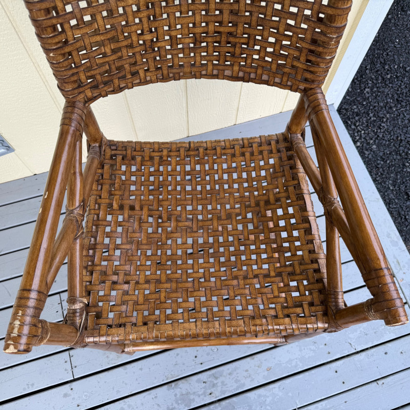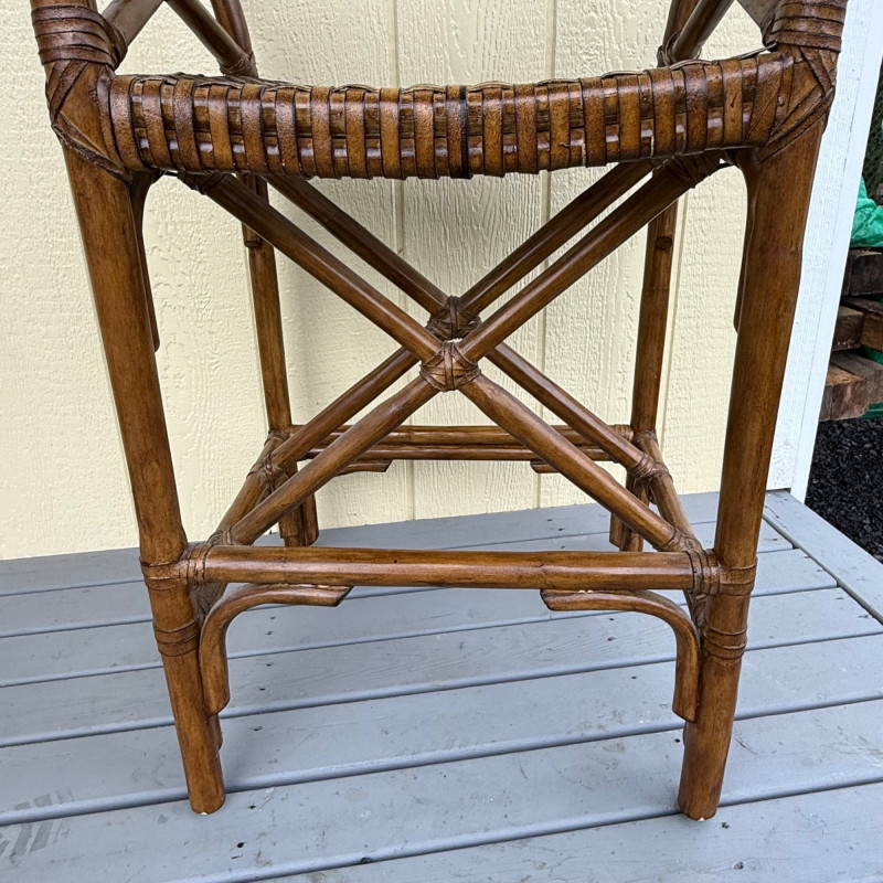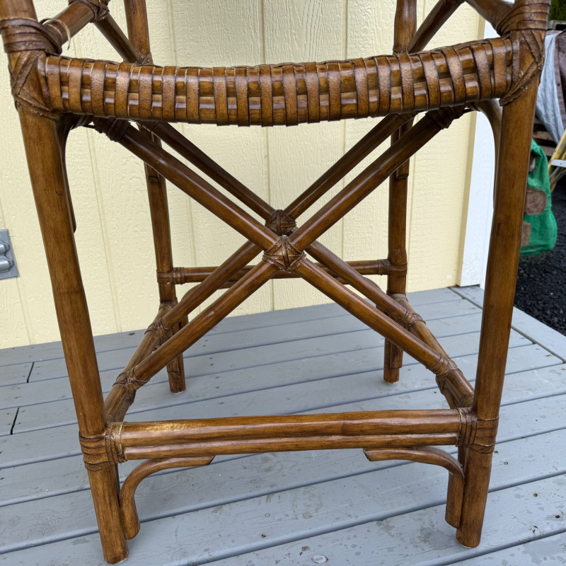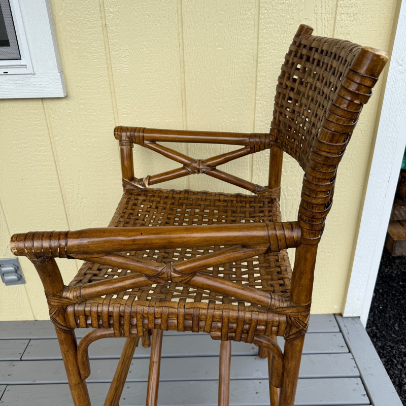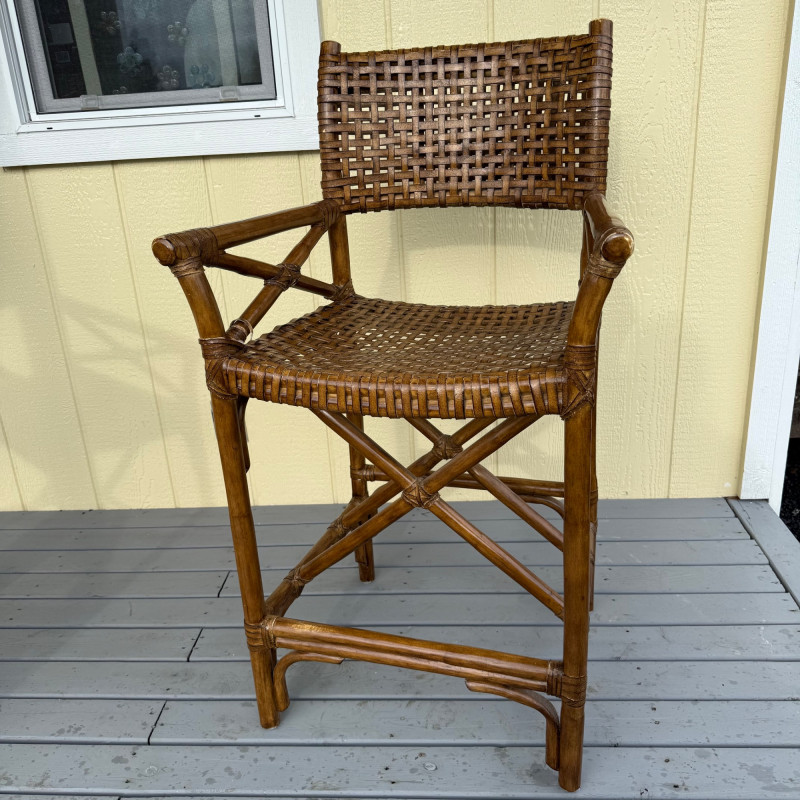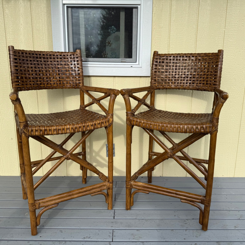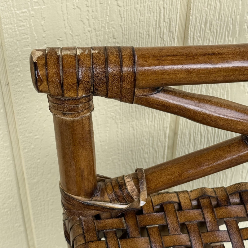 MCM rattan and leather strap bar stools. Some wear common with use. Leather appears in good, strong condition. Chairs are comfortable and sturdy. Bottom of chair has signature and markings.