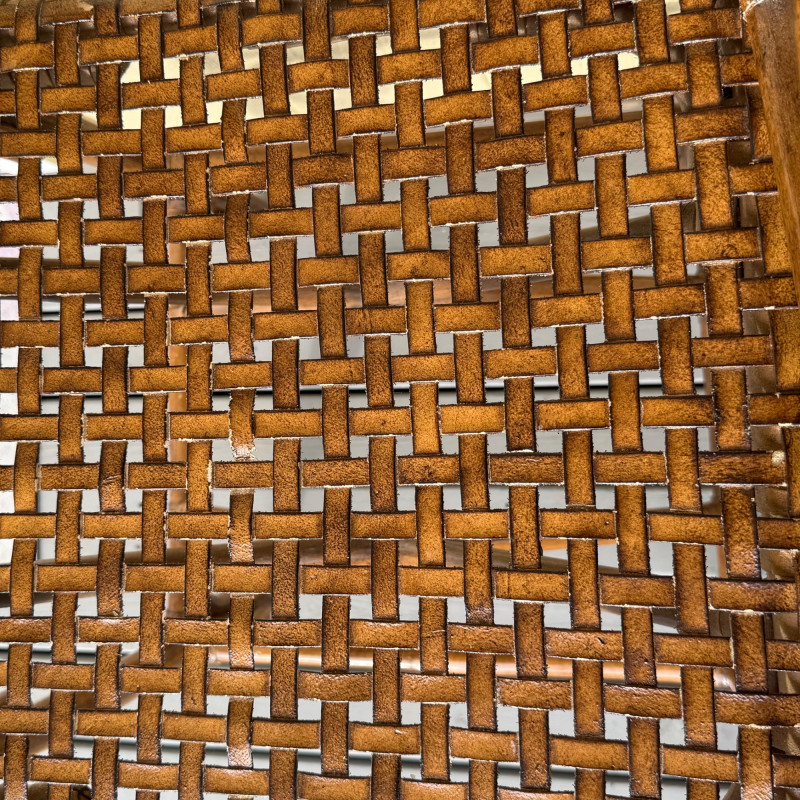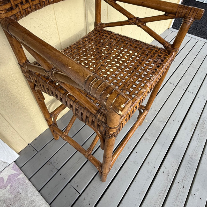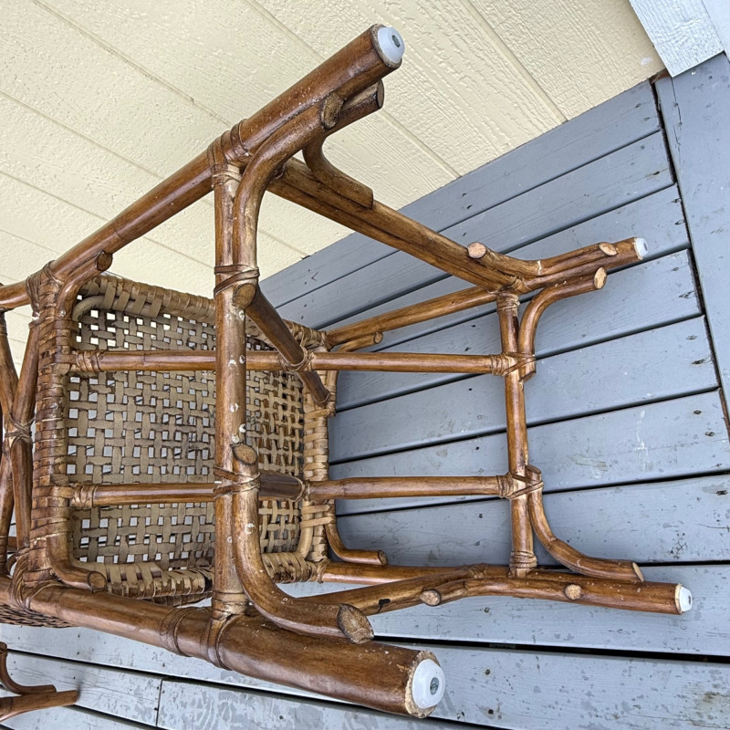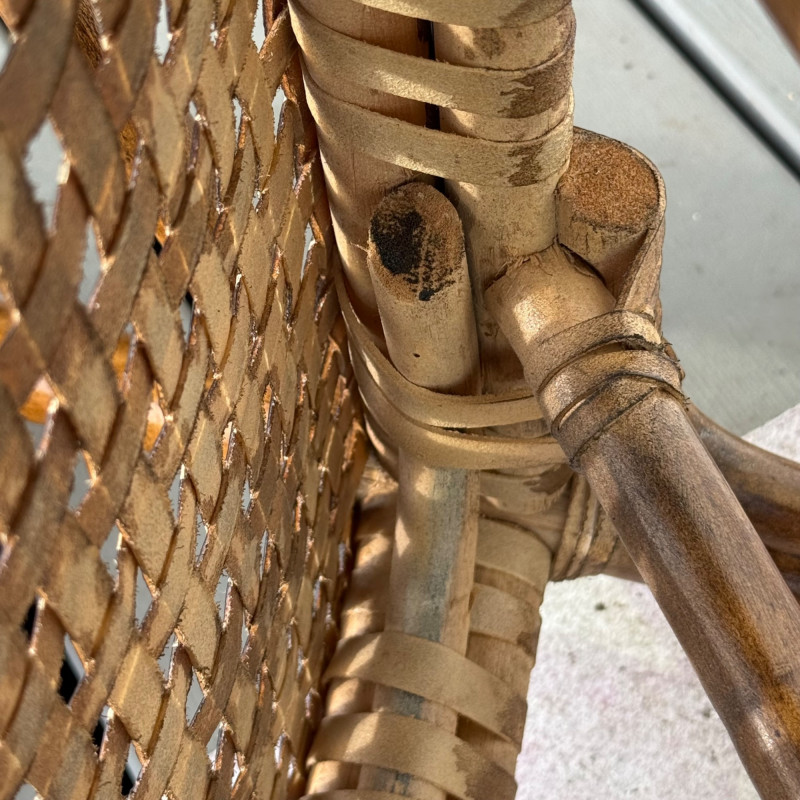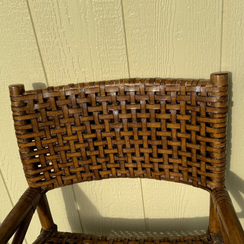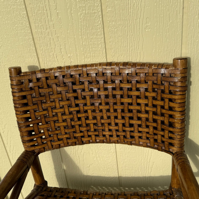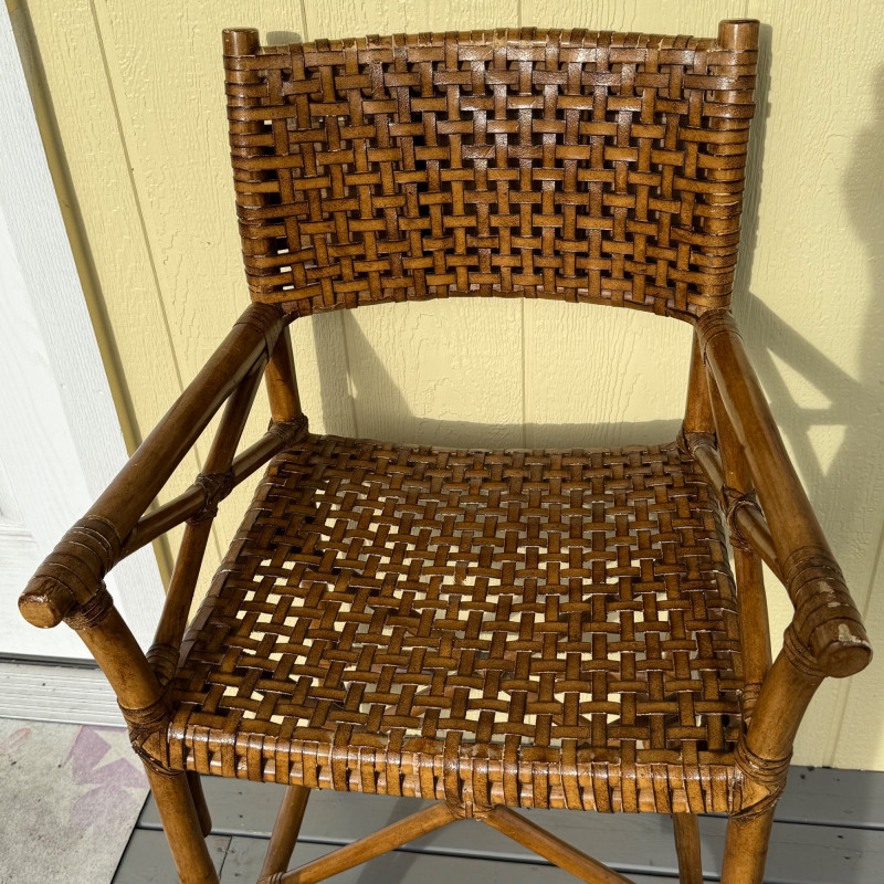 MCM rattan and leather strap bar stools. Some wear common with use. Leather appears in good, strong condition. Chairs are comfortable and sturdy. Bottom of chair has signature and markings.