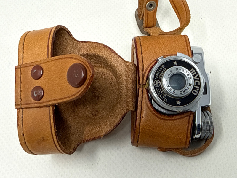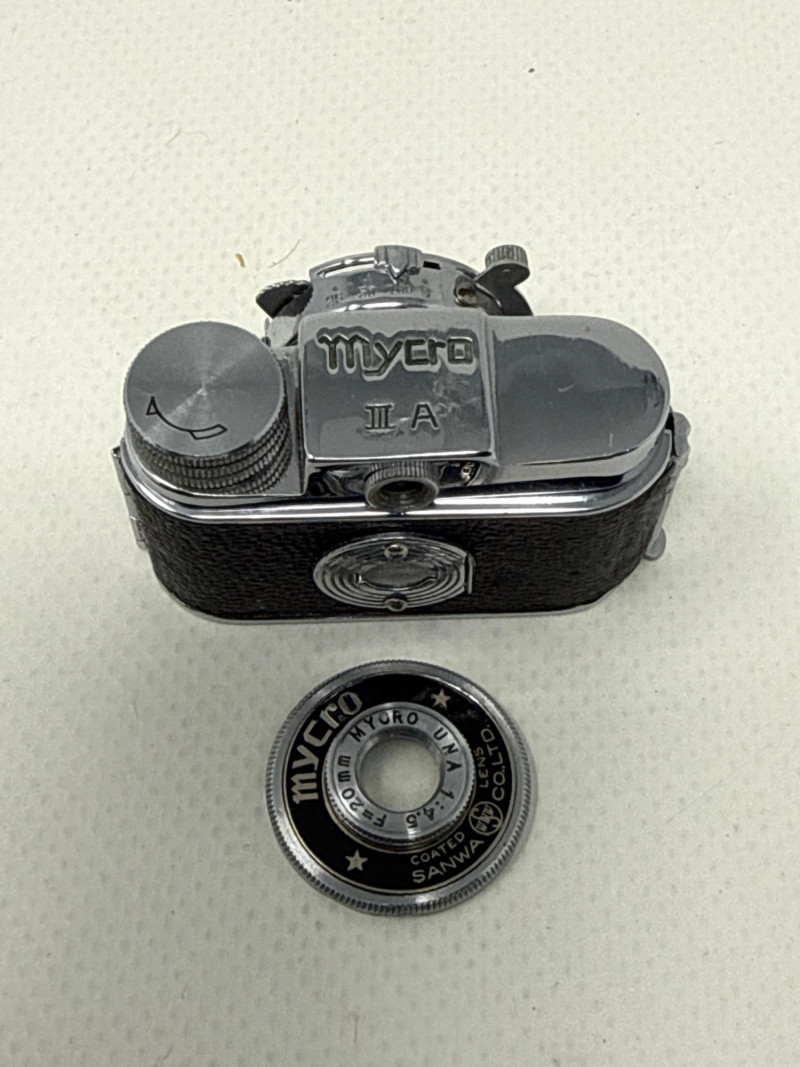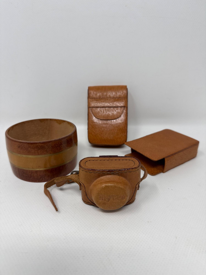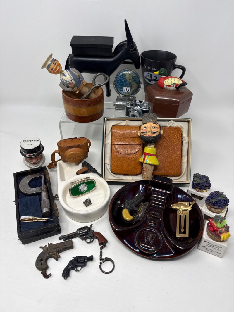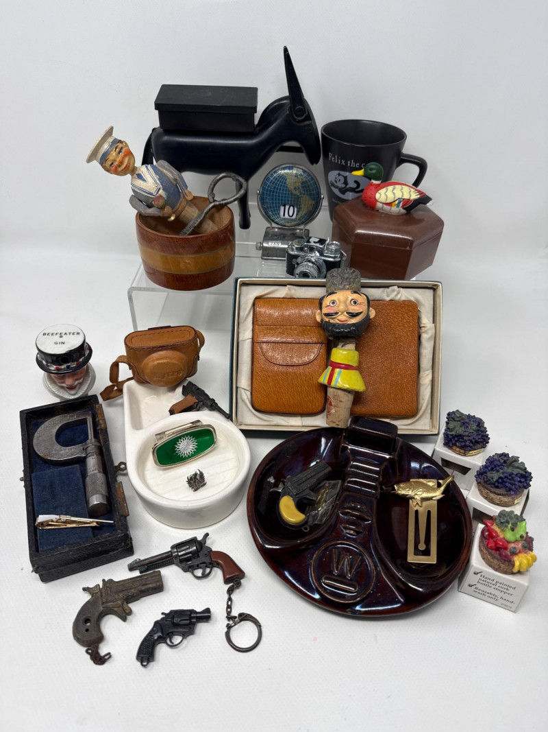 Masculine collectibles for a keen asthetic Vintage ceramic ashtrays, pigskin cigarette holders and case and plastic donkey cigarette dispenser. Vintage mechanical wine stoppers and a few NIB stoppers. Felix the cat Mug. Vintage metal globe desktop calendar. Works dandy. Wood bowl for desktop or dresser. Vintage miniature cameras. One is Kent and other is Sanwa Mycro. Lens cover does not stay attached. Includes pigskin cover. Vintage micrometer with case and assorted miniature pistols.
