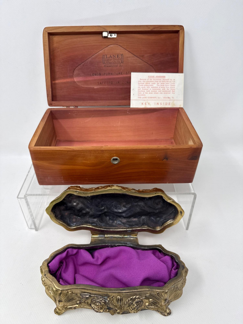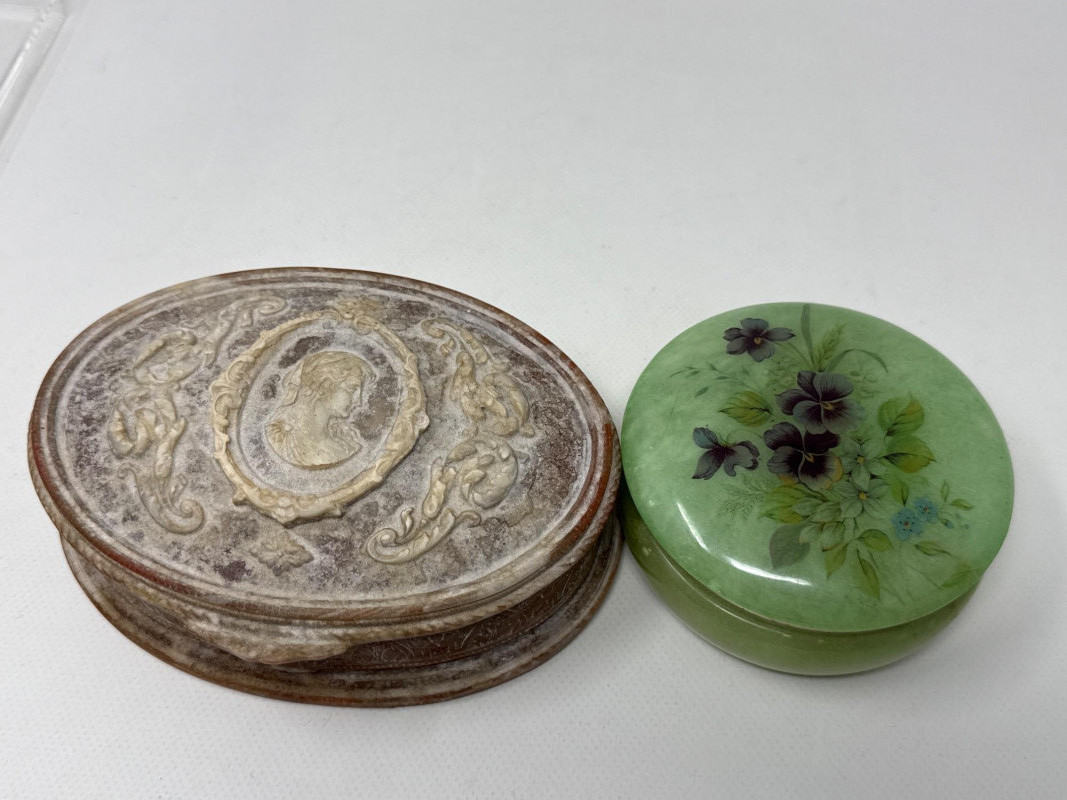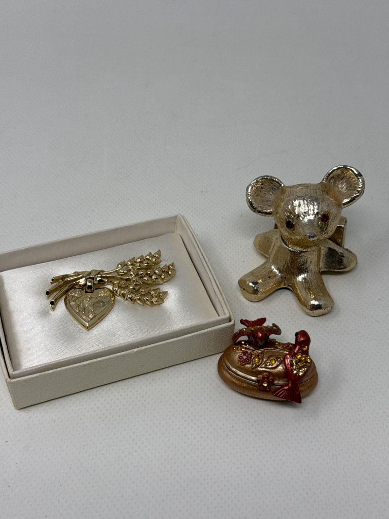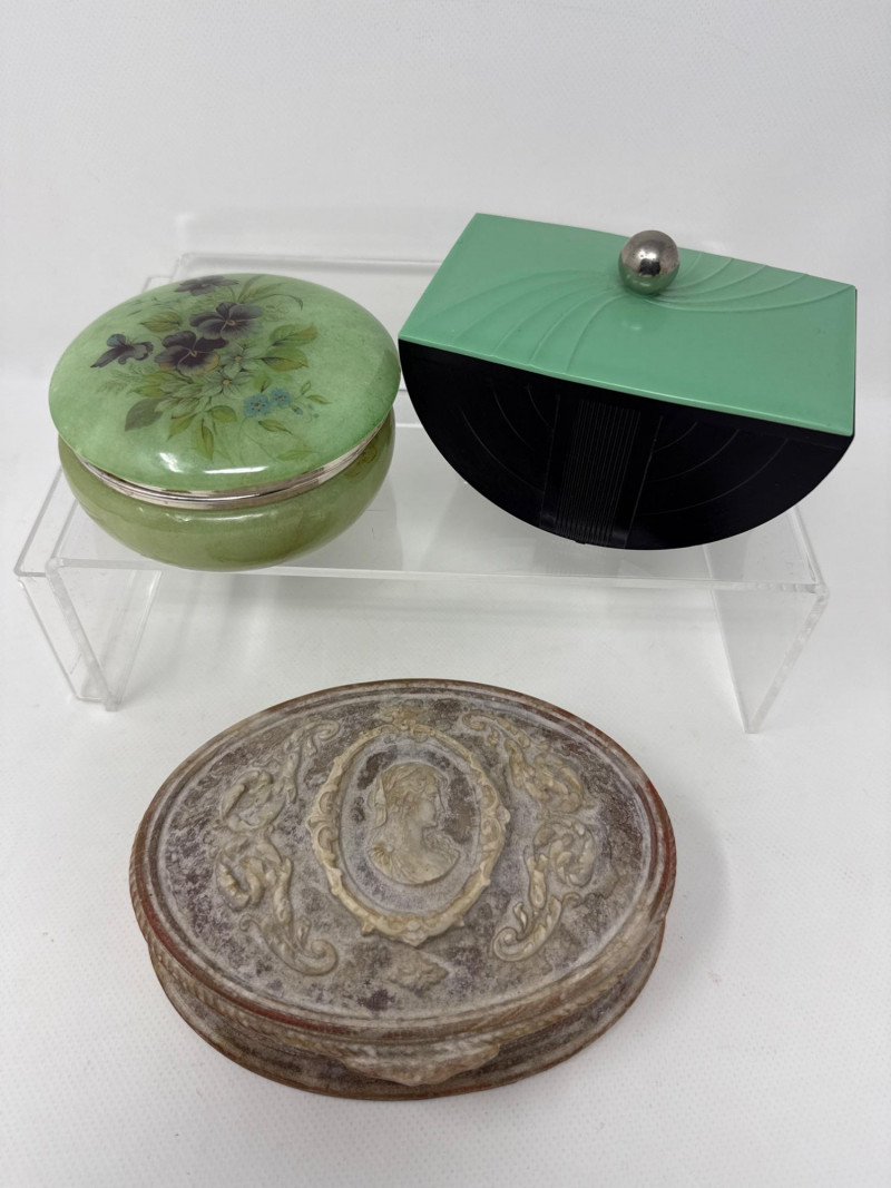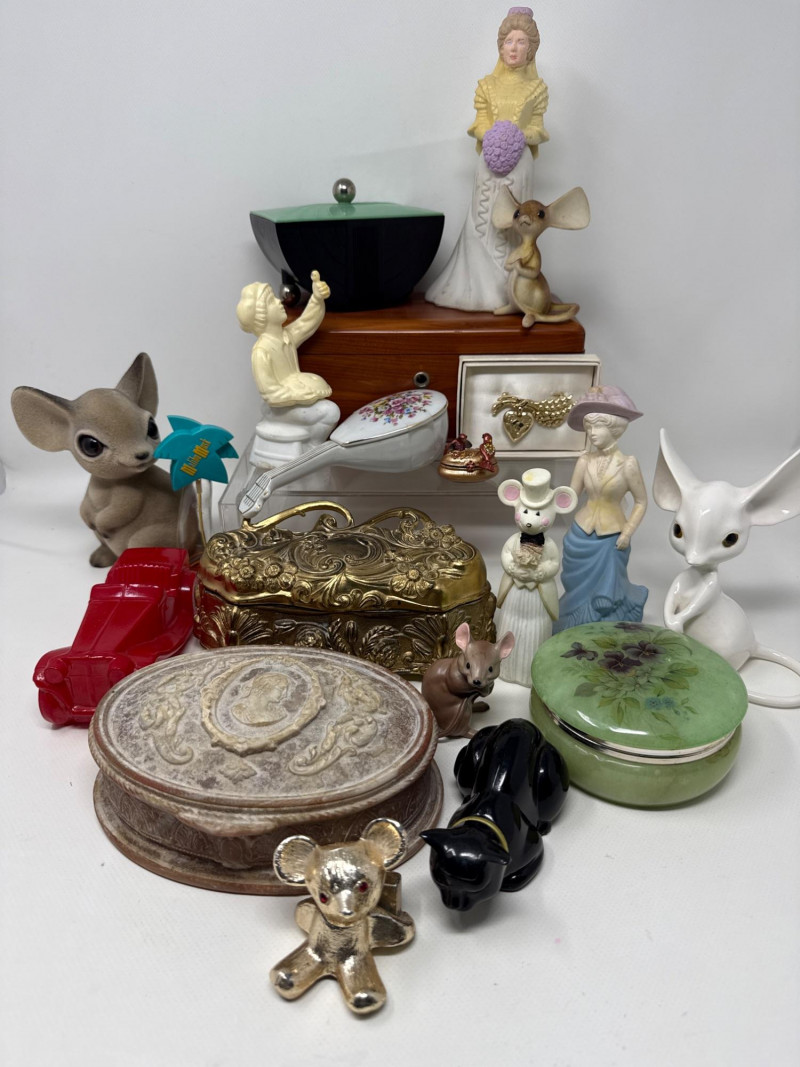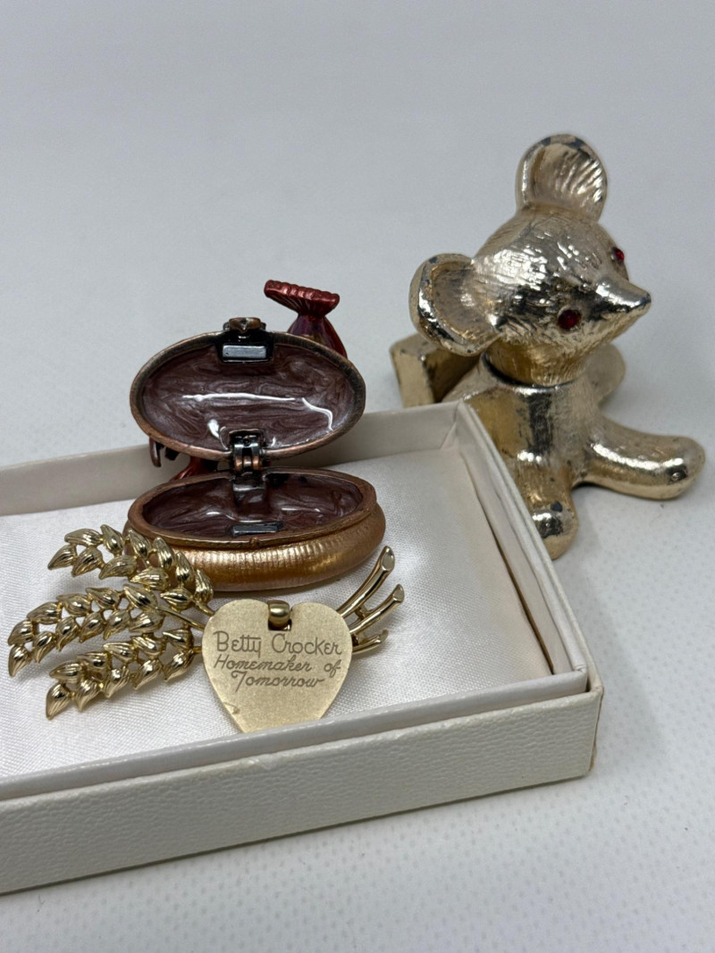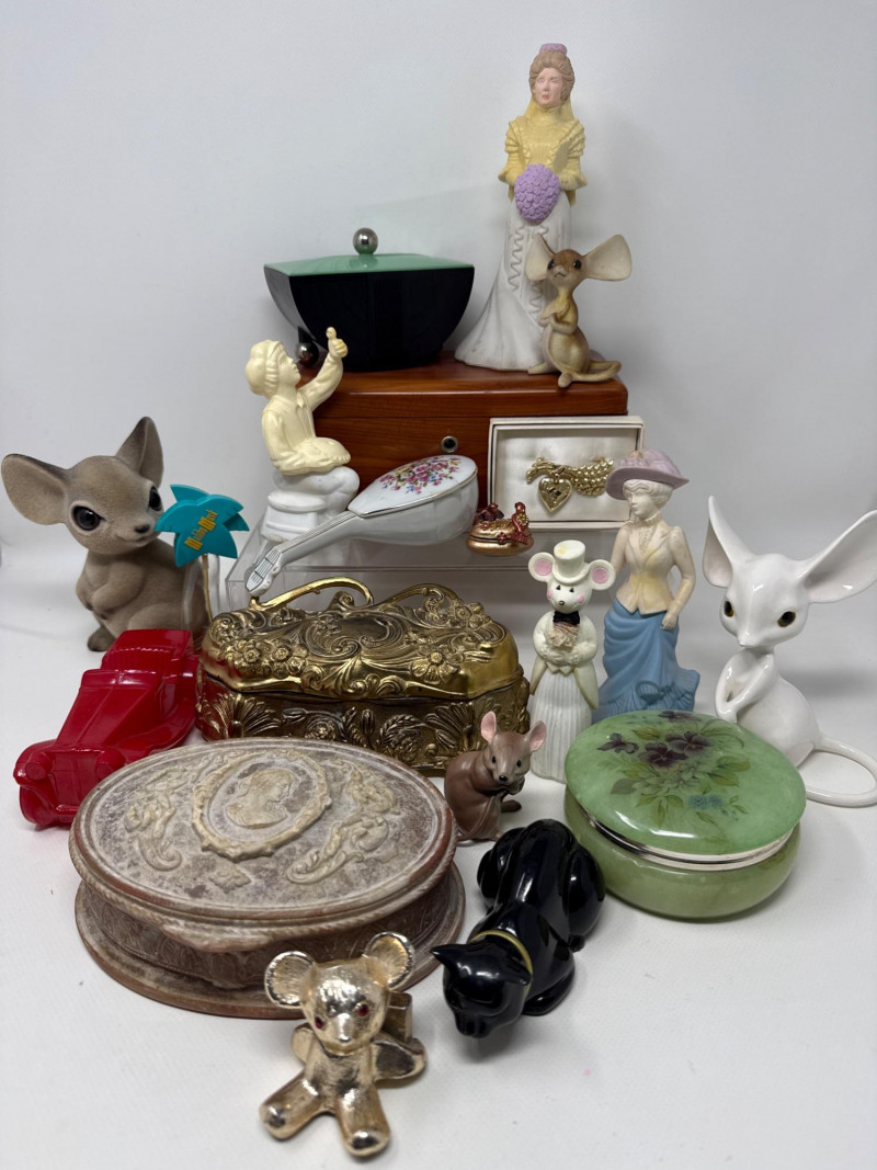 Several vintage Avon bottles. Mostly empty. Several vintage jewelry boxes and Incolay Stone jewelry box. Brass box is very heavy. Green stone powder box has a damaged hinge. Plastic green and black art deco box. Vintage mouse figurines. Two with brushed felt/velvet material. Betty Crocker homemaker brooch. Solid metal gold mouse with jeweled eyes. Jeweled Limoges style box is likely NIB.