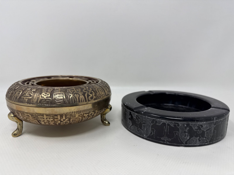 MCM Hand hammered copper candle holder is 10 inch tall, 4.5 inch wide. Stamped. Matching baskets are 9.5 inch diameter. Brass ashtray 5 inch wide, 2.5 inch tall. Marble ashtray has engraved Egyptian theme. Three matching clay mugs, hand painted in browns and blue and glazed.
