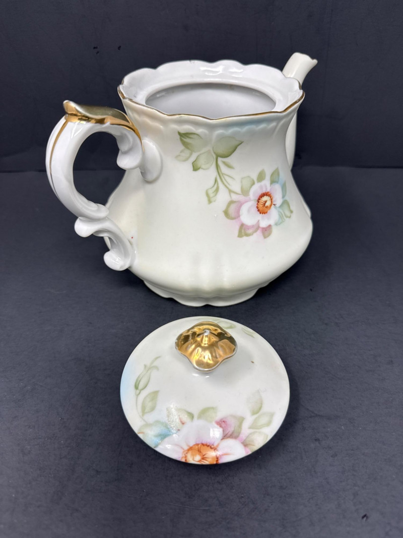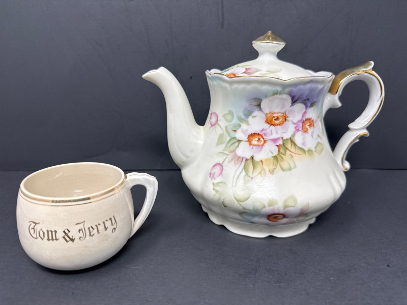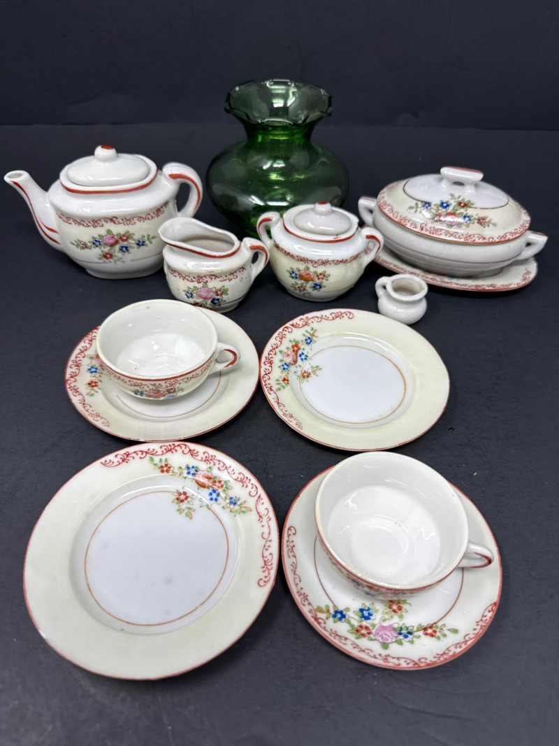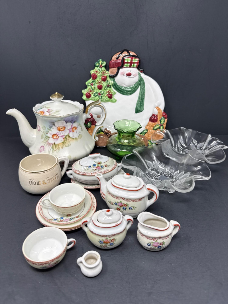 Lefton Magnolia teapot with lid. Dimensions 7 inch tall, 8 inch long, 4 inch wide. Fritz and Floyd snowman plate 10-inch long, 9 inch wide. Mikasa glass double bowl is 11 inch long, 6.75 inch wide, 2.75 inch tall. Childs tea set made in Japan. Mimics a Noritake floral pattern. Vintage Green glass vase adds color. Anchor Hocking flared rim bud vase Tom and Jerry vintage teacup with gold painted detail.