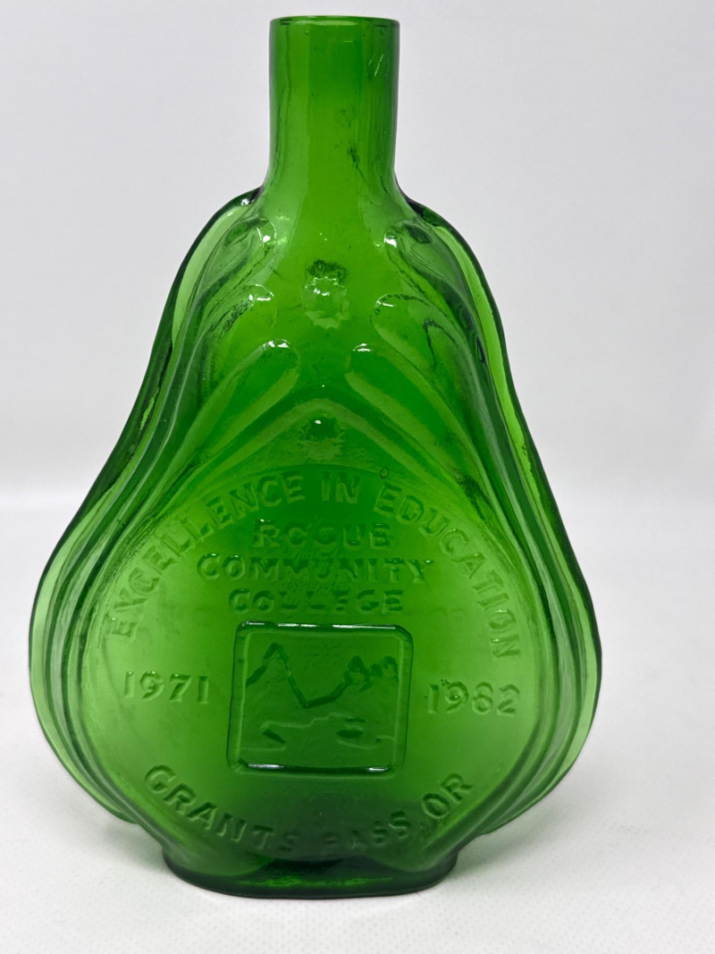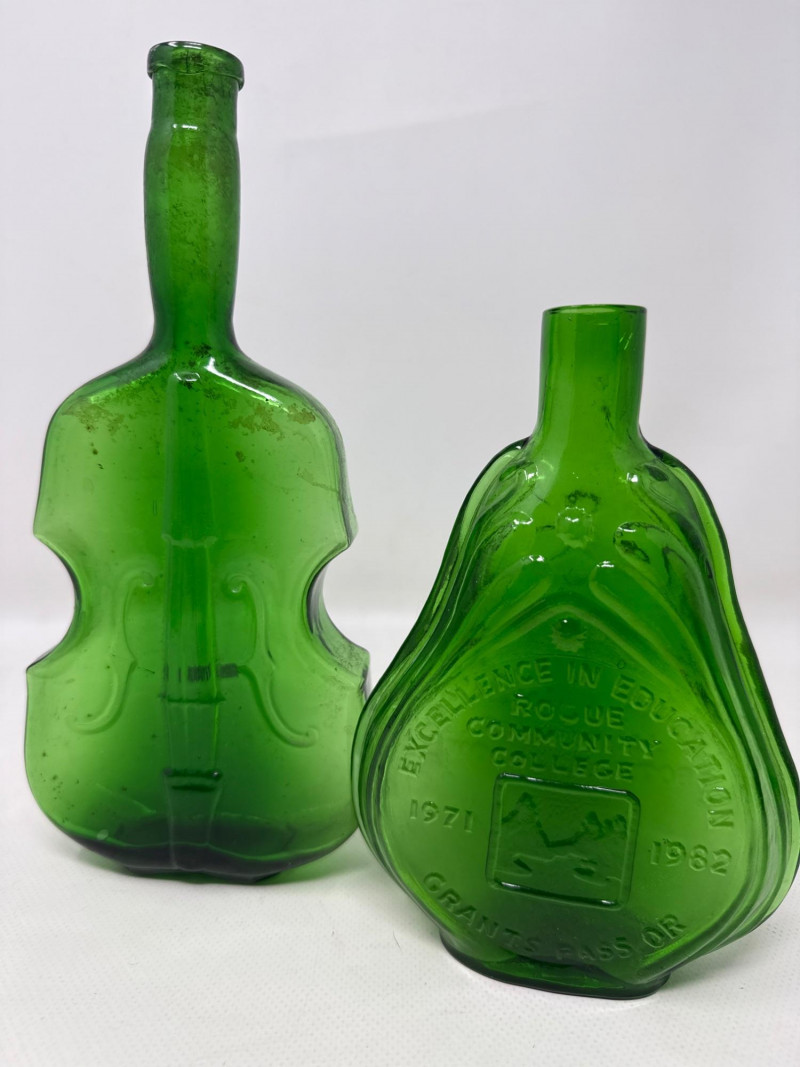 Eight pieces. Vintage embossed bottles and jewelry boxes. Violin boxes are 10 inches long, 4.5 inches wide, 2 inches tall. Large footed bottle is 9 inches tall. 3-D bottle is 7 inches tall, 4.5 inches wide. Ashtray is 8.25 inches long, 3.25 inches wide. Tallest violin bottle is 9.75 inches tall. Extra-large wide bottle is 10 inches tall, 5.5 inches wide. Wheaton bottle is 9.25 inches tall. Wheaton glass blowers. Commemorative bottle for Rogue River Community College. One with plastic stopper.