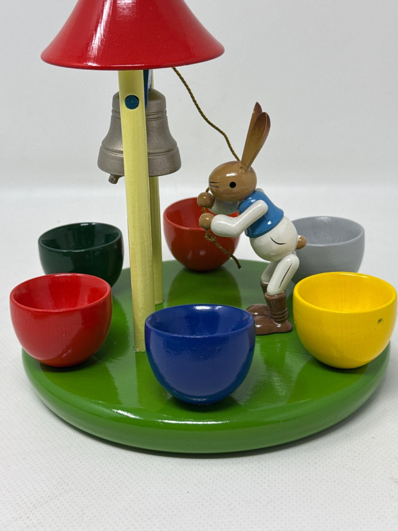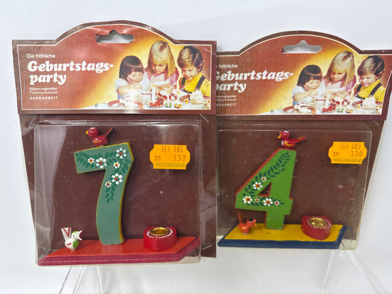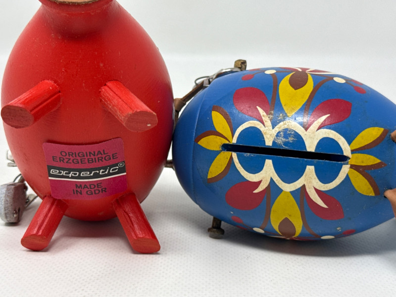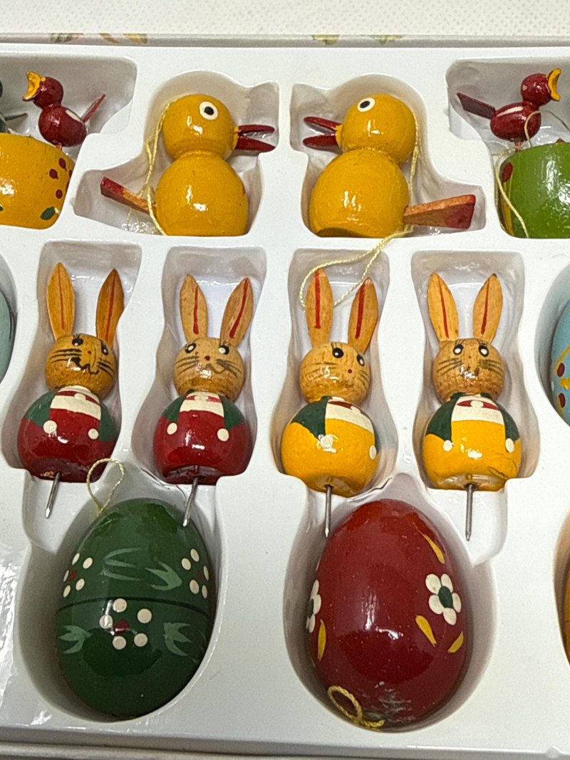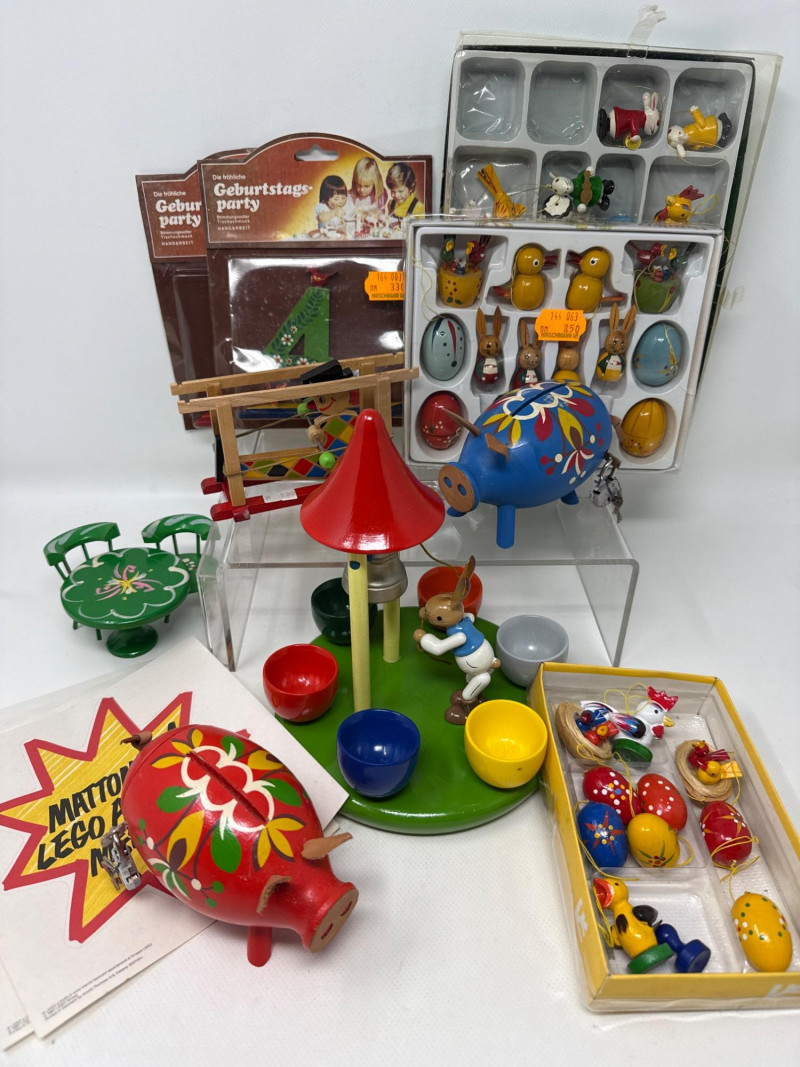 Charming vintage German wood ornaments, Egg holder Merry go round is 8 inches tall, 7 inches wide. NIB wood ornaments, birthday candle holders, large Lego stickers. Rabbits, birds, mushrooms, eggs and chickens. Wood clown with parallel bars. Wood piggy banks are hand painted and include metal locking system.