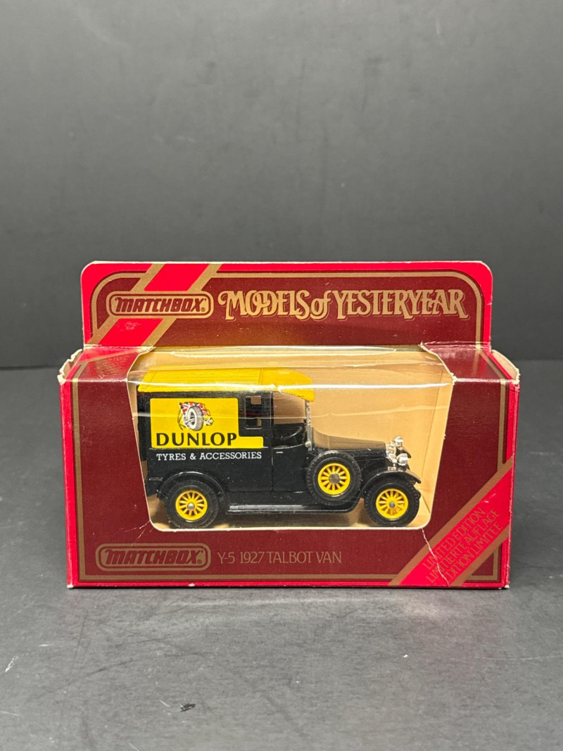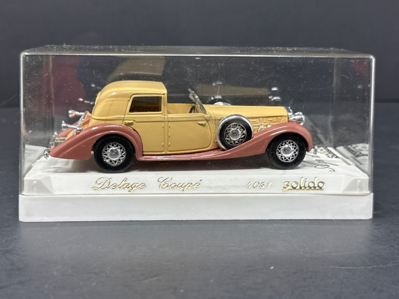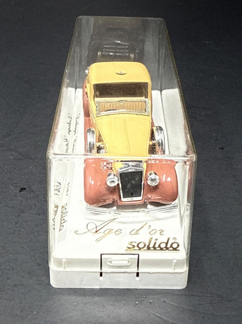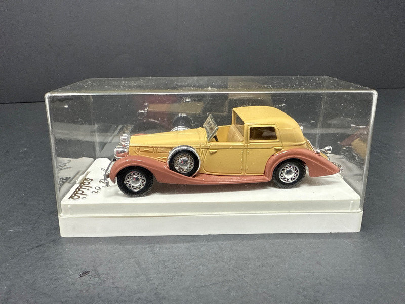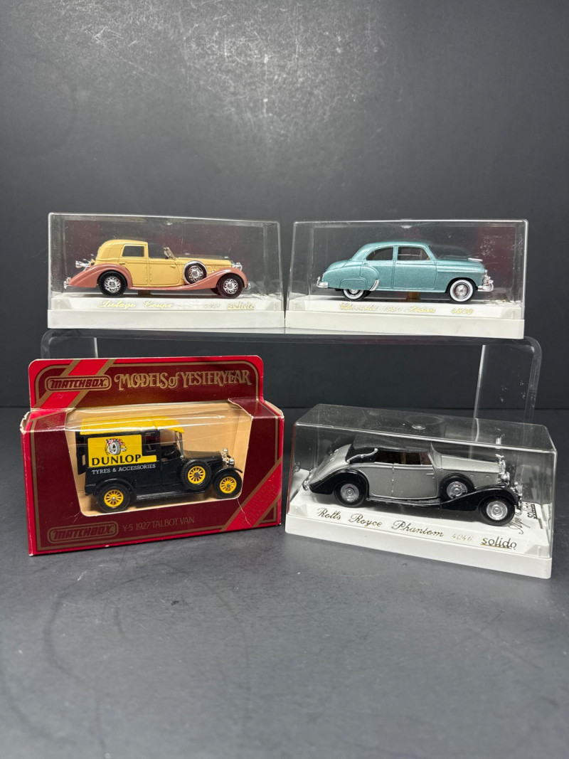 A charming collection of four vintage die-cast model cars, each encased in clear plastic display boxes. These miniature replicas represent classic automobiles from different eras and brands, appealing to collectors and enthusiasts alike: Top Left: A vibrant yellow and red "Vintage Coupe 1939" by Solido, featuring a sleek, rounded design typical of pre-WWII styling. Top Right: A light blue "Chevrolet 1950 Sedan" by Solido, reflecting the post-war American automotive boom with its smooth curves and chrome accents. Bottom Left: A black and yellow "MATCHBOX MODELS OF YESTERYEAR Y-5 1927 Talbot Van" branded with "DUNLOP TYRES & ACCESSORIES," evoking the charm of early commercial vehicles. Bottom Right: A silver and black "Rolls Royce Phantom 4066" by Solido, exuding luxury and elegance with its elongated body and iconic grille.
