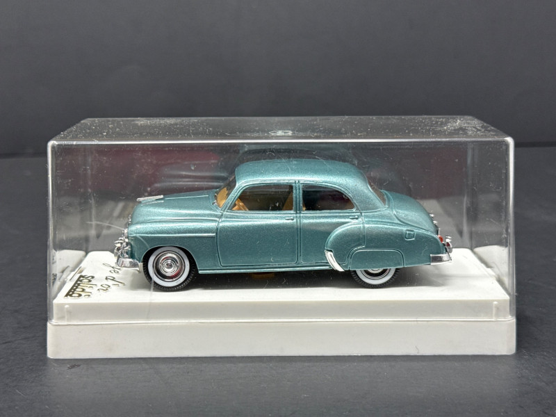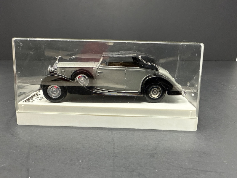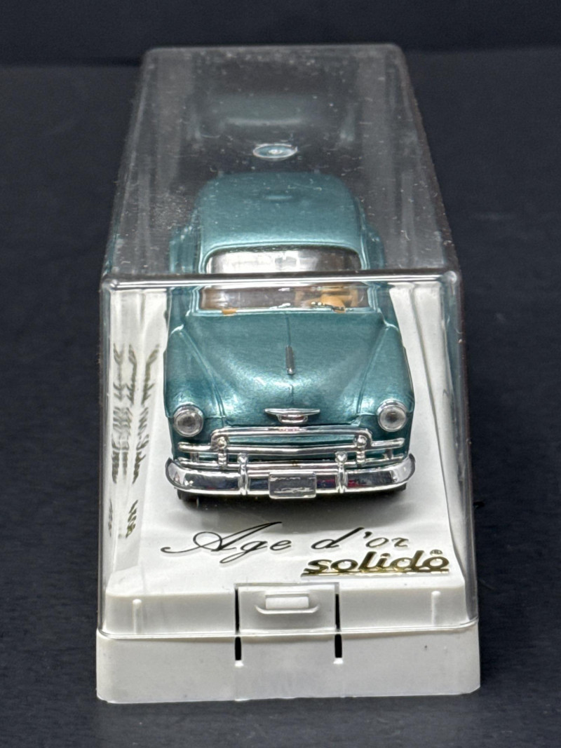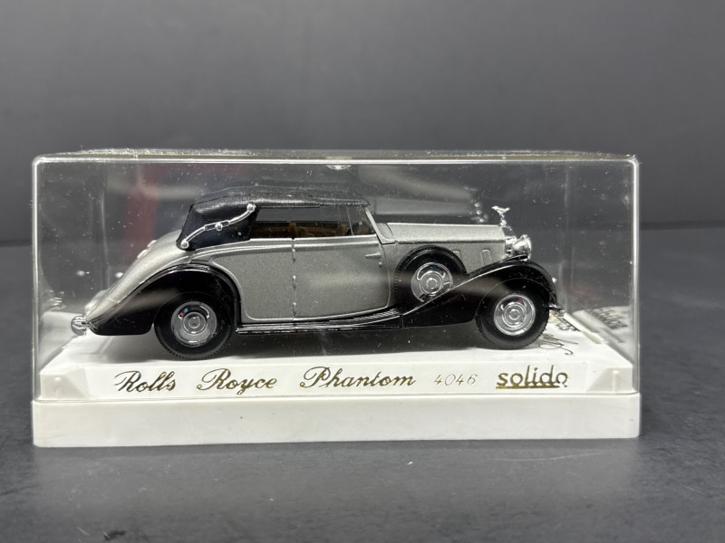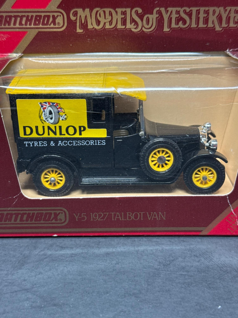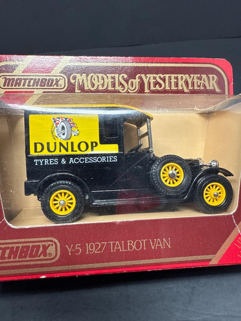 A charming collection of four vintage die-cast model cars, each encased in clear plastic display boxes. These miniature replicas represent classic automobiles from different eras and brands, appealing to collectors and enthusiasts alike: Top Left: A vibrant yellow and red "Vintage Coupe 1939" by Solido, featuring a sleek, rounded design typical of pre-WWII styling. Top Right: A light blue "Chevrolet 1950 Sedan" by Solido, reflecting the post-war American automotive boom with its smooth curves and chrome accents. Bottom Left: A black and yellow "MATCHBOX MODELS OF YESTERYEAR Y-5 1927 Talbot Van" branded with "DUNLOP TYRES & ACCESSORIES," evoking the charm of early commercial vehicles. Bottom Right: A silver and black "Rolls Royce Phantom 4066" by Solido, exuding luxury and elegance with its elongated body and iconic grille.