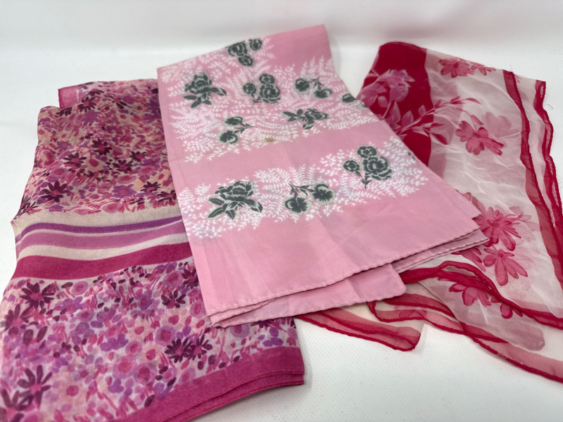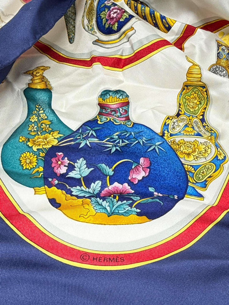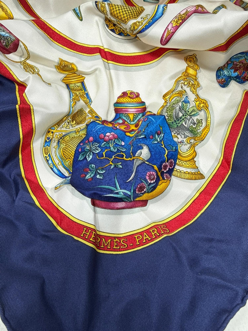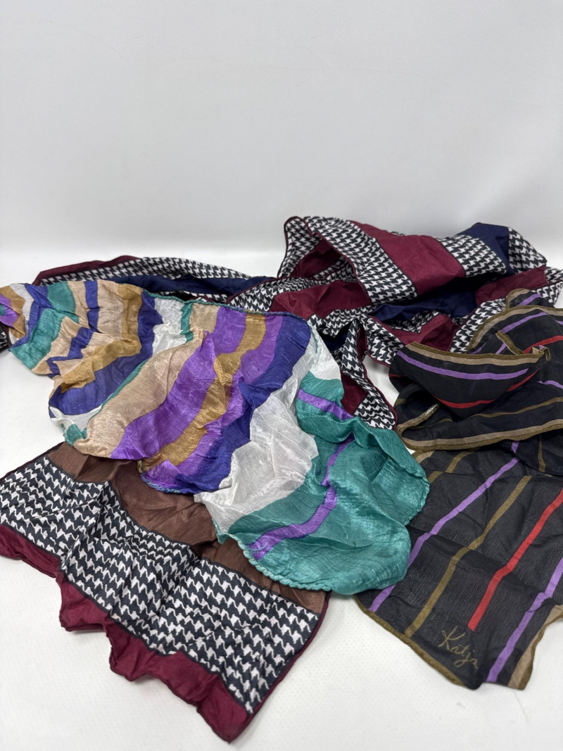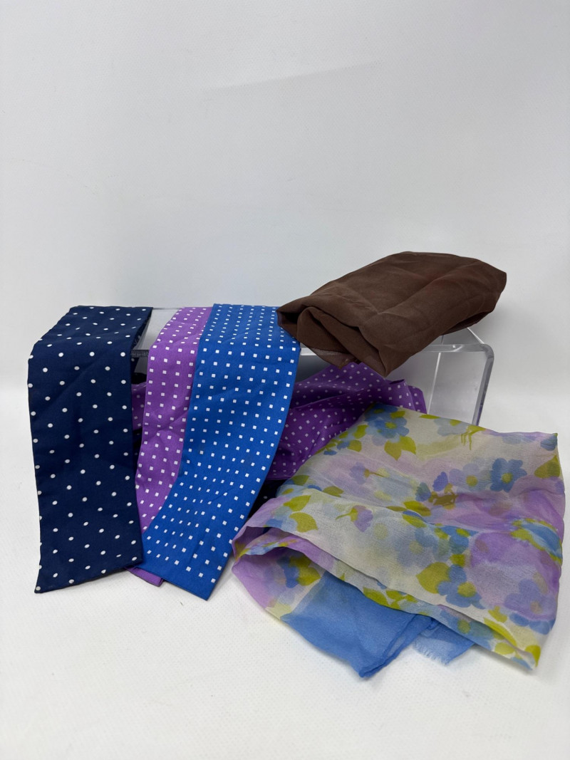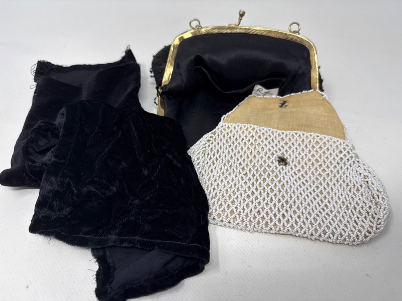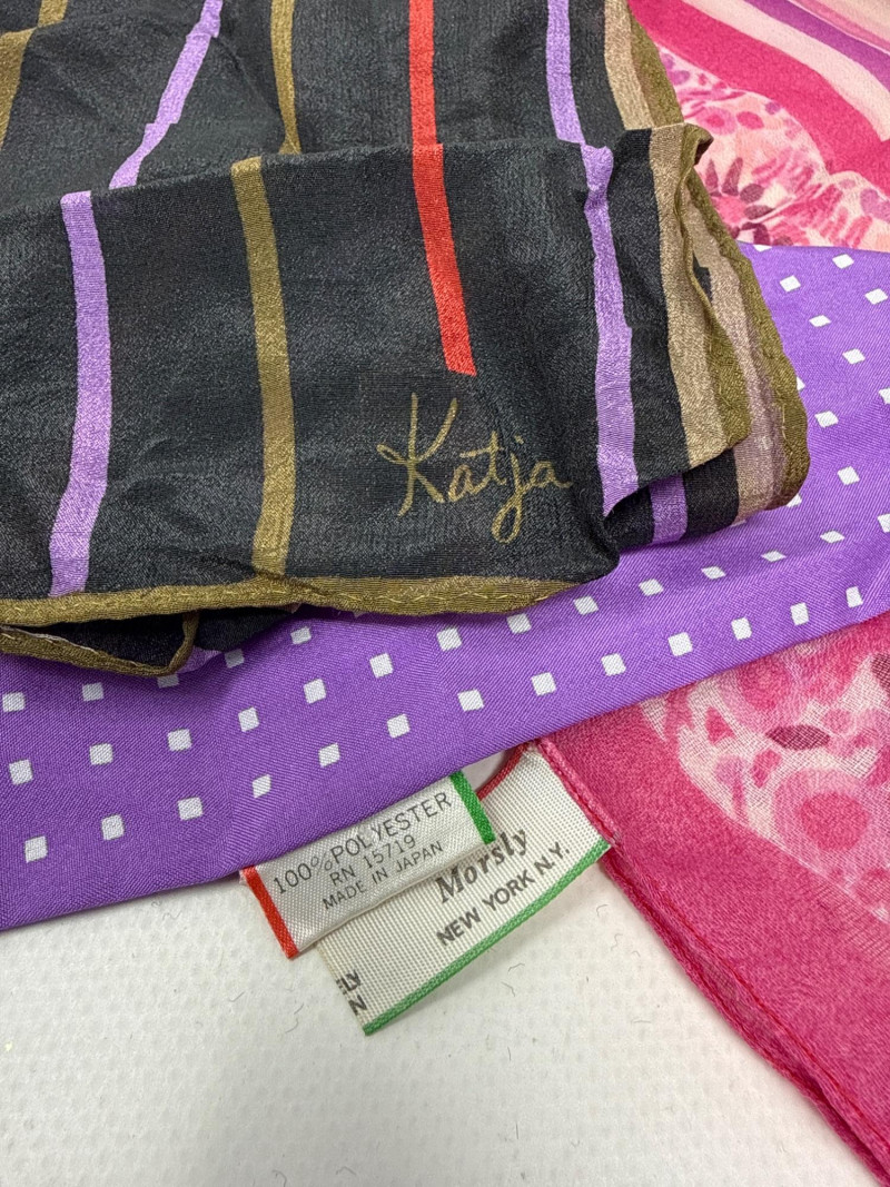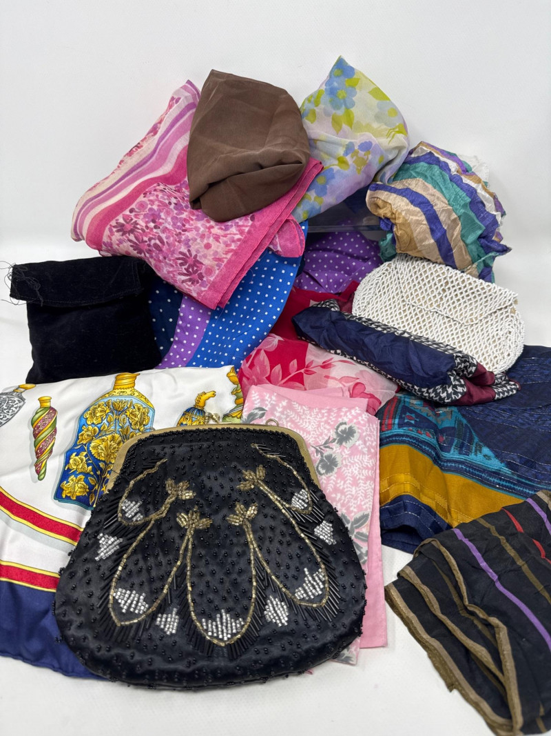 Vintage Hermes scarf. 100% silk. Large size. Two beaded vintage purses. With small velvet bag Large variety of styles, sizes and materials. Several silk, cotton and polyester blends. Scarves and neckties