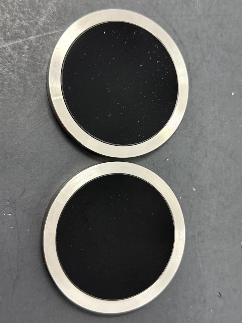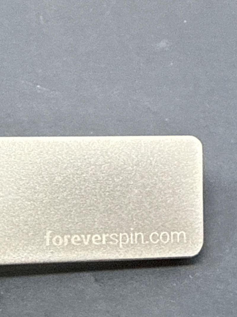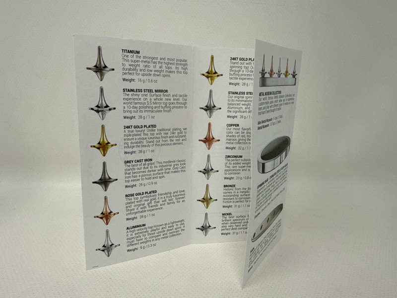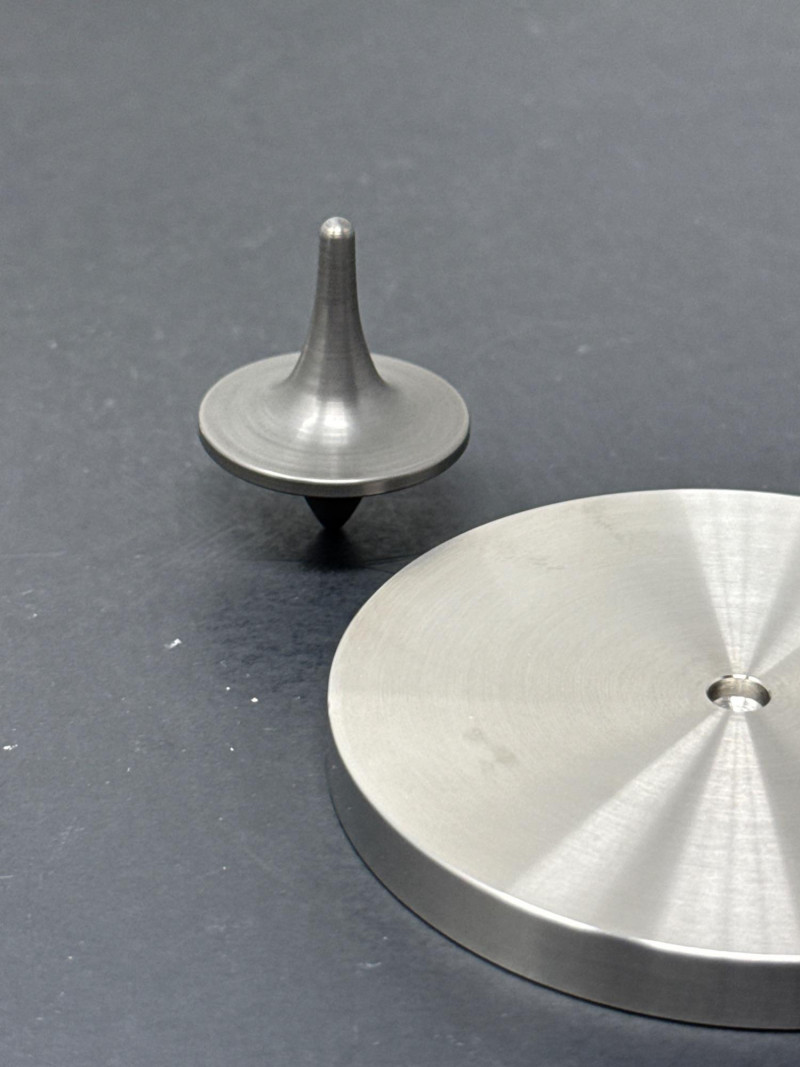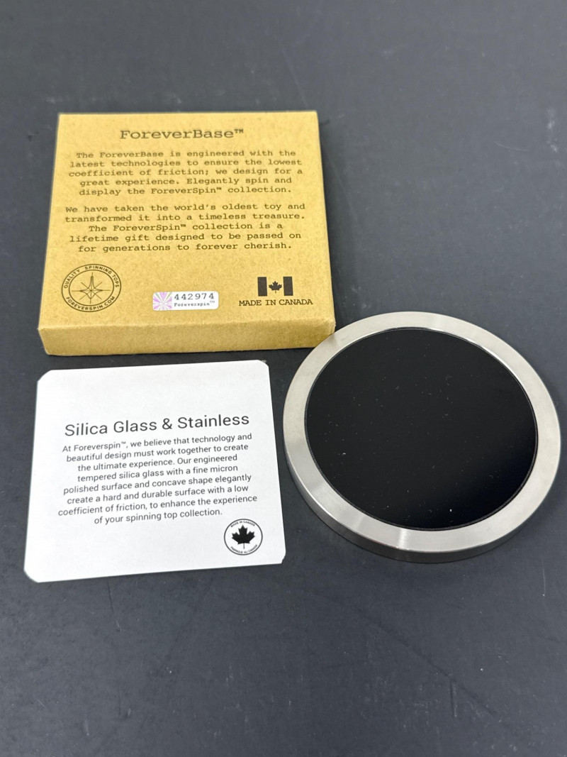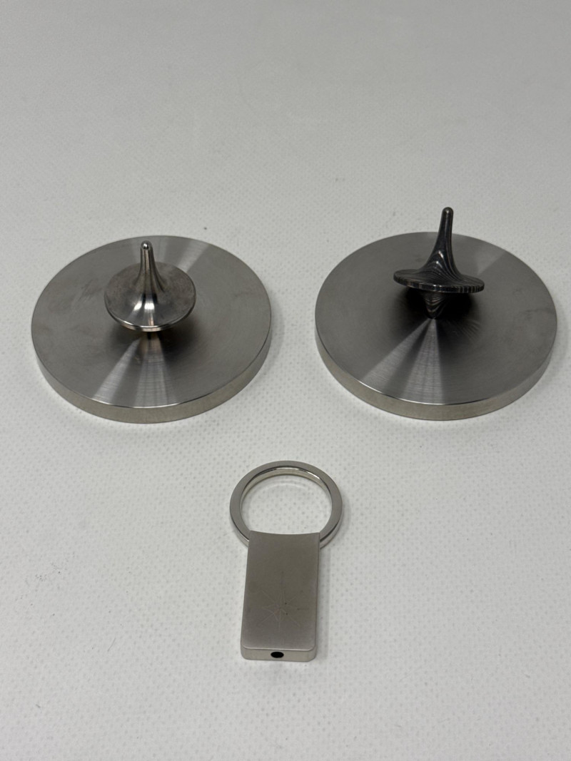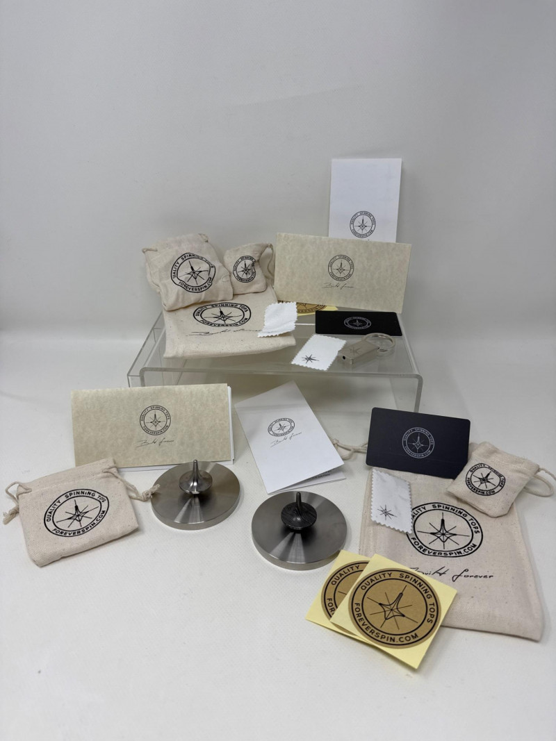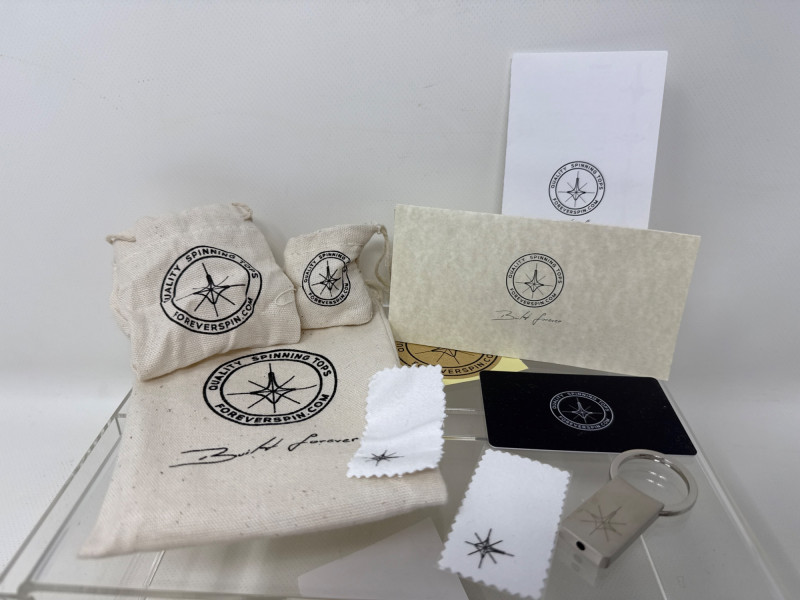 Damascus steel and Tungsten metal spinners. One metal key chain They include specialty kits complete with canvas bags for each component, cleaning cloths, original boxes, stickers and documents. Spin plate is heavy duty stainless steel and silica glass. They both operate smoothly on and off the base. Tungsten spinner has unique swirl detail