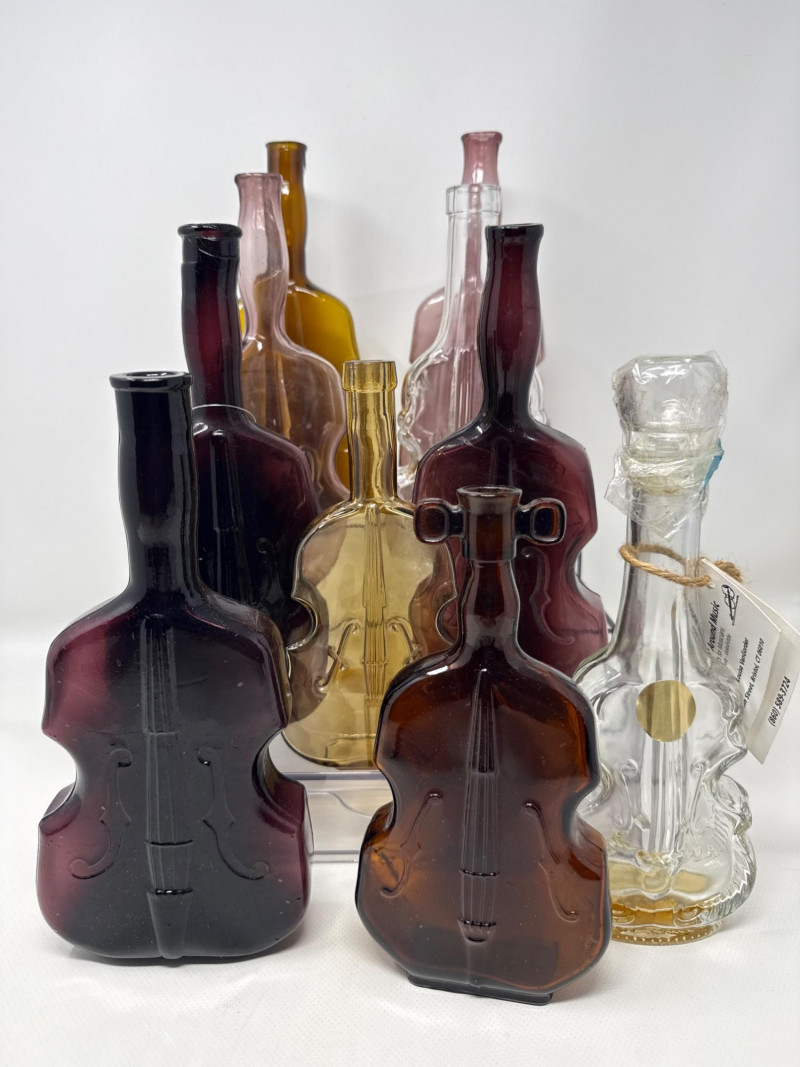 10 pieces. Most are part of the Violin Bottle Collectors Association Catalog Cranberry bottles are 9.5 inches tall. Small amber bottle is 8 inches tall. Large amber bottle is 10 inches tall. Clear bottle with topper his 10 inches tall. Footed clear bottle is 10 inches tall. Made in Italy Violet bottles are 10 inches tall.