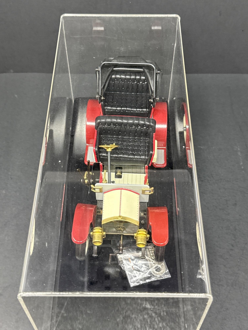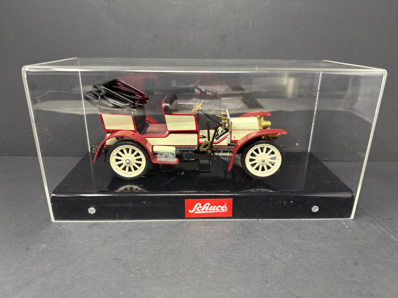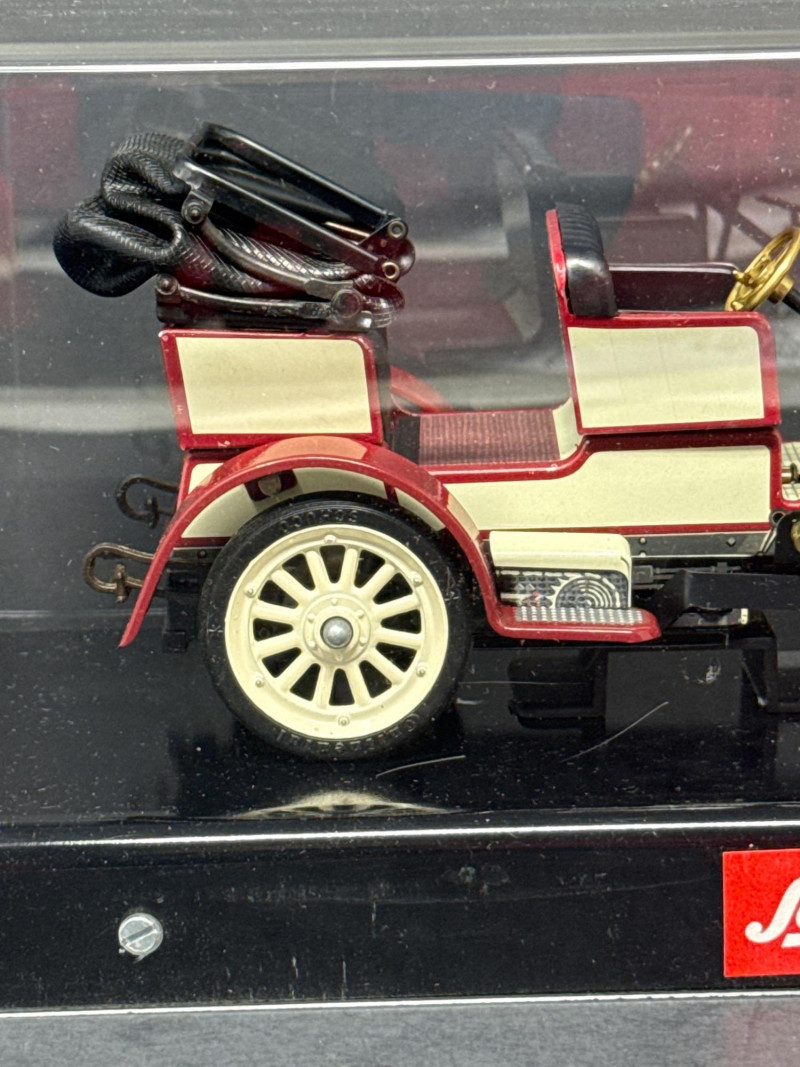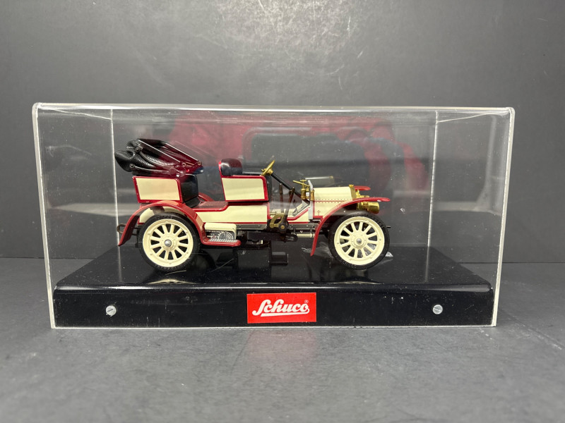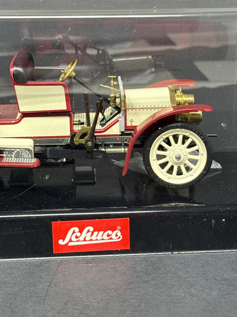 A meticulously crafted scale model of a vintage automobile, encased in a clear plastic display box. The car features a striking cream and red color scheme with elegant gold and black detailing. Notable elements include: 🛞 Cream-colored spoked wheels 🪑 Black leather-look seats 🛠️ Brass steering wheel and trim 🧢 Folded black convertible top at the rear The model is mounted on a base labeled “Schuco,” a brand known for high-quality die-cast collectibles. The overall presentation highlights both historical automotive design and fine craftsmanship, making it a standout piece for collectors and enthusiasts alike. Contents include a mix of materials. Plastic, metal, fabric etc... Did not open display to confirm. Includes a collector pamphlet