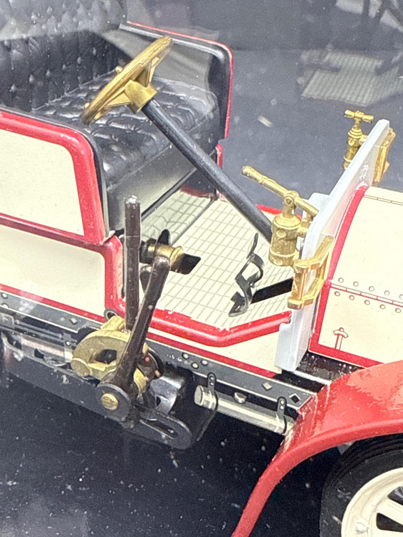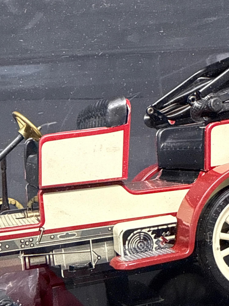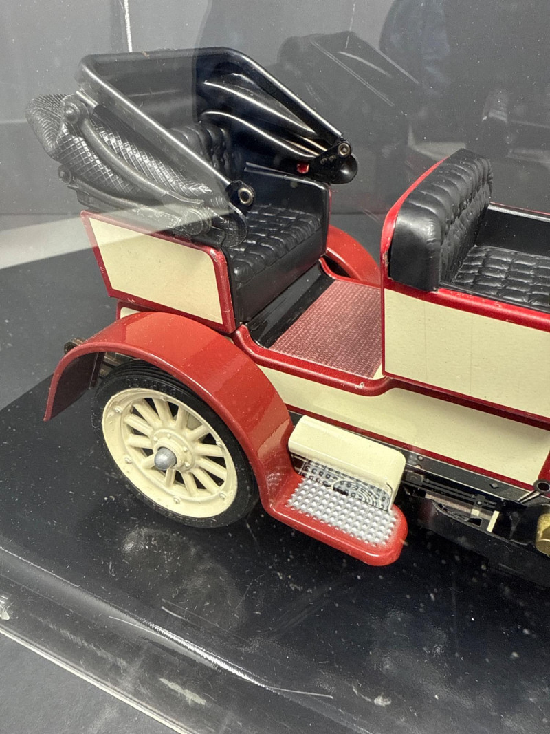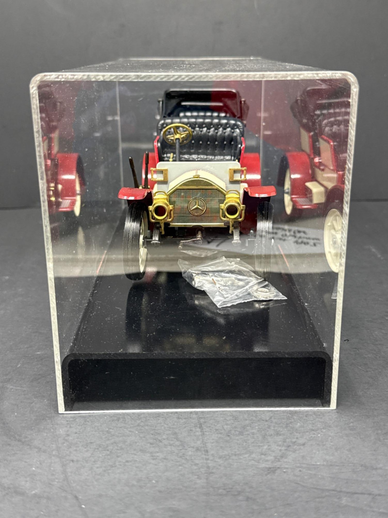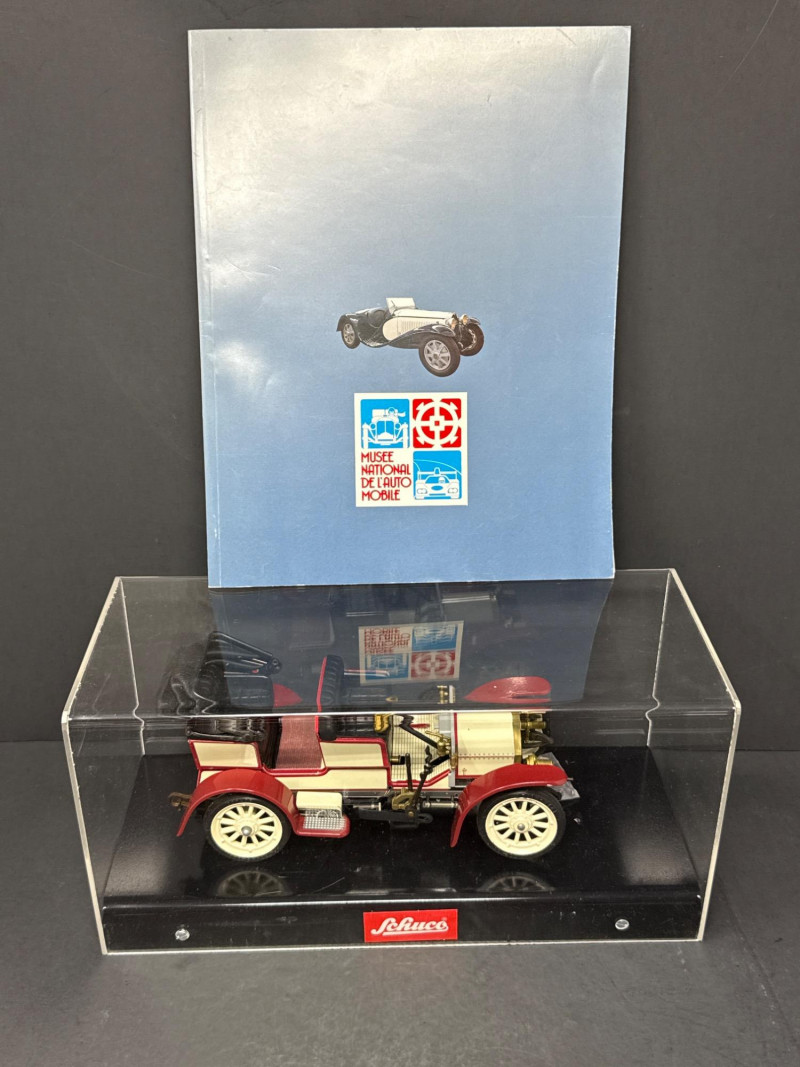 A meticulously crafted scale model of a vintage automobile, encased in a clear plastic display box. The car features a striking cream and red color scheme with elegant gold and black detailing. Notable elements include: 🛞 Cream-colored spoked wheels 🪑 Black leather-look seats 🛠️ Brass steering wheel and trim 🧢 Folded black convertible top at the rear The model is mounted on a base labeled “Schuco,” a brand known for high-quality die-cast collectibles. The overall presentation highlights both historical automotive design and fine craftsmanship, making it a standout piece for collectors and enthusiasts alike. Contents include a mix of materials. Plastic, metal, fabric etc... Did not open display to confirm. Includes a collector pamphlet