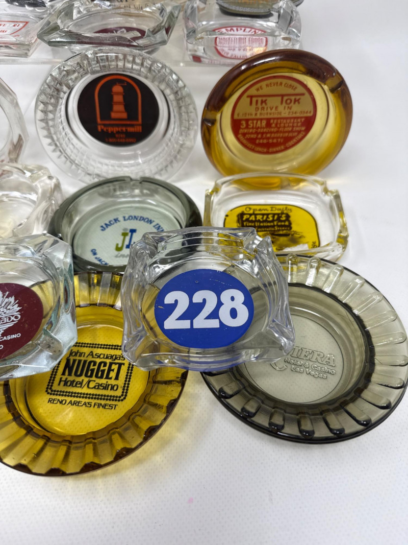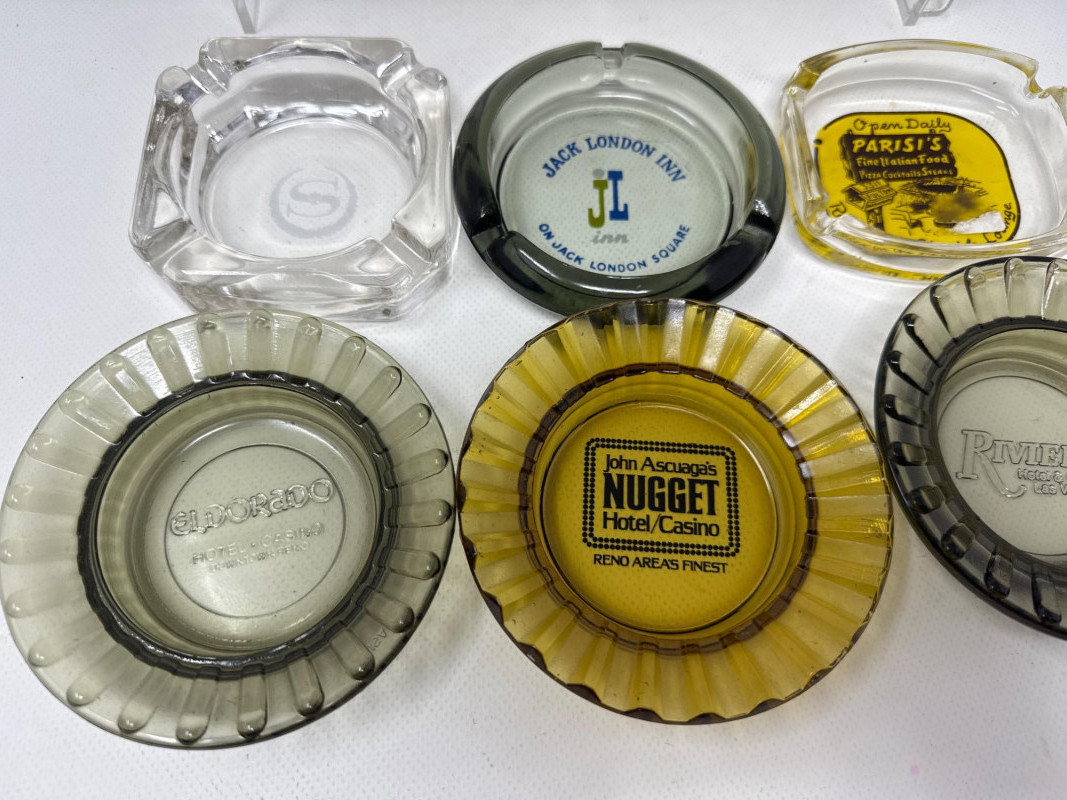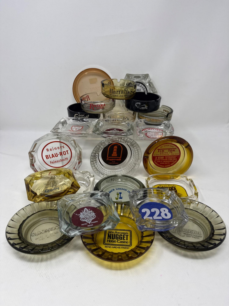 23 separate ashtrays. Arrangement of vintage glass ashtrays. Each ashtray features branding from iconic hotels, casinos, and restaurants, primarily from mid-20th century America. The collection includes clear, amber, and black glass pieces, each with distinct typography and logos that reflect the design aesthetics of their respective eras. Notable establishments represented include: Harrah's Lake Tahoe Riviera Hotel & Casino, Las Vegas Peppermill Hotel Eldorado Hotel Nevada John Ascuaga's Nugget Hotel/Casino Jack London Inn Tik Tok Drive In – 3 Star Restaurant Reiners Blau-Rot Feinschnitt
