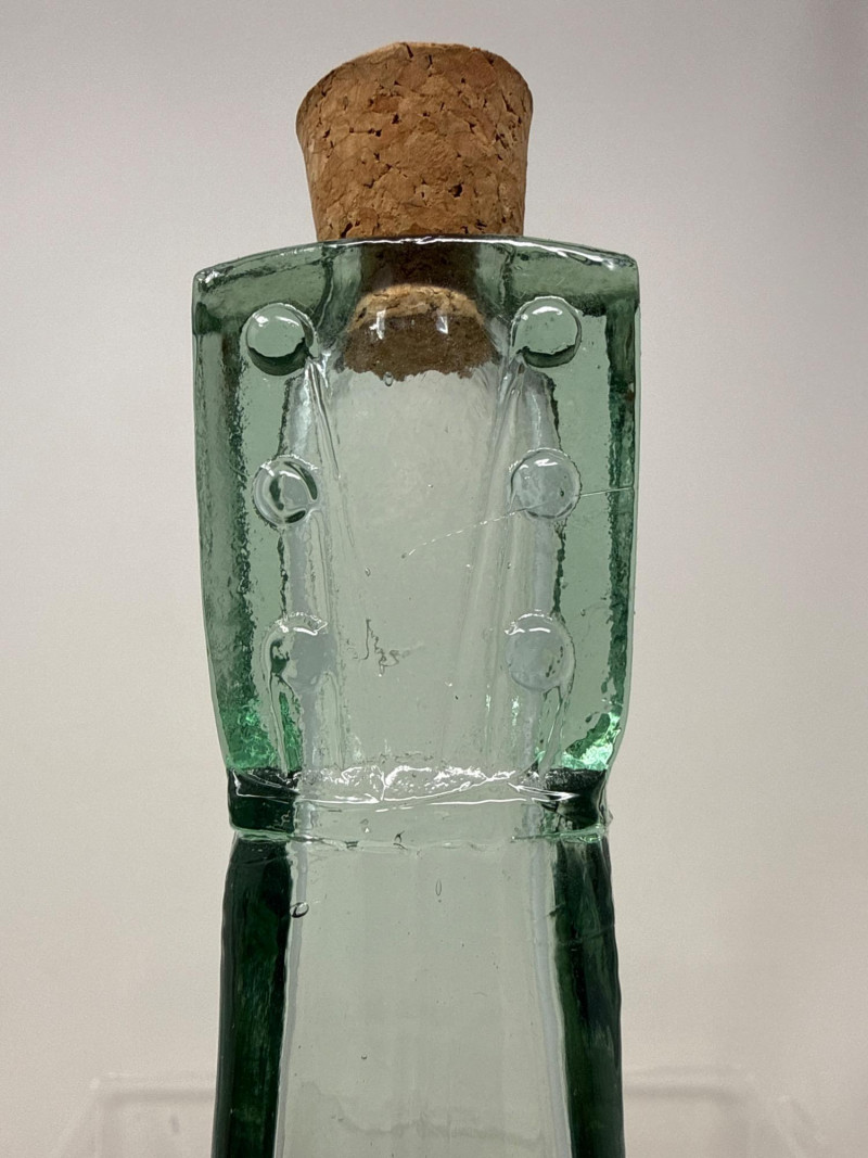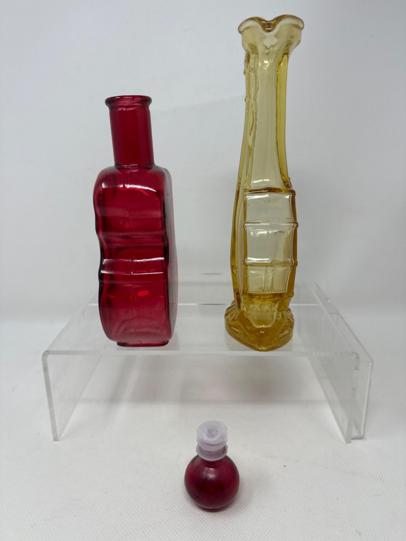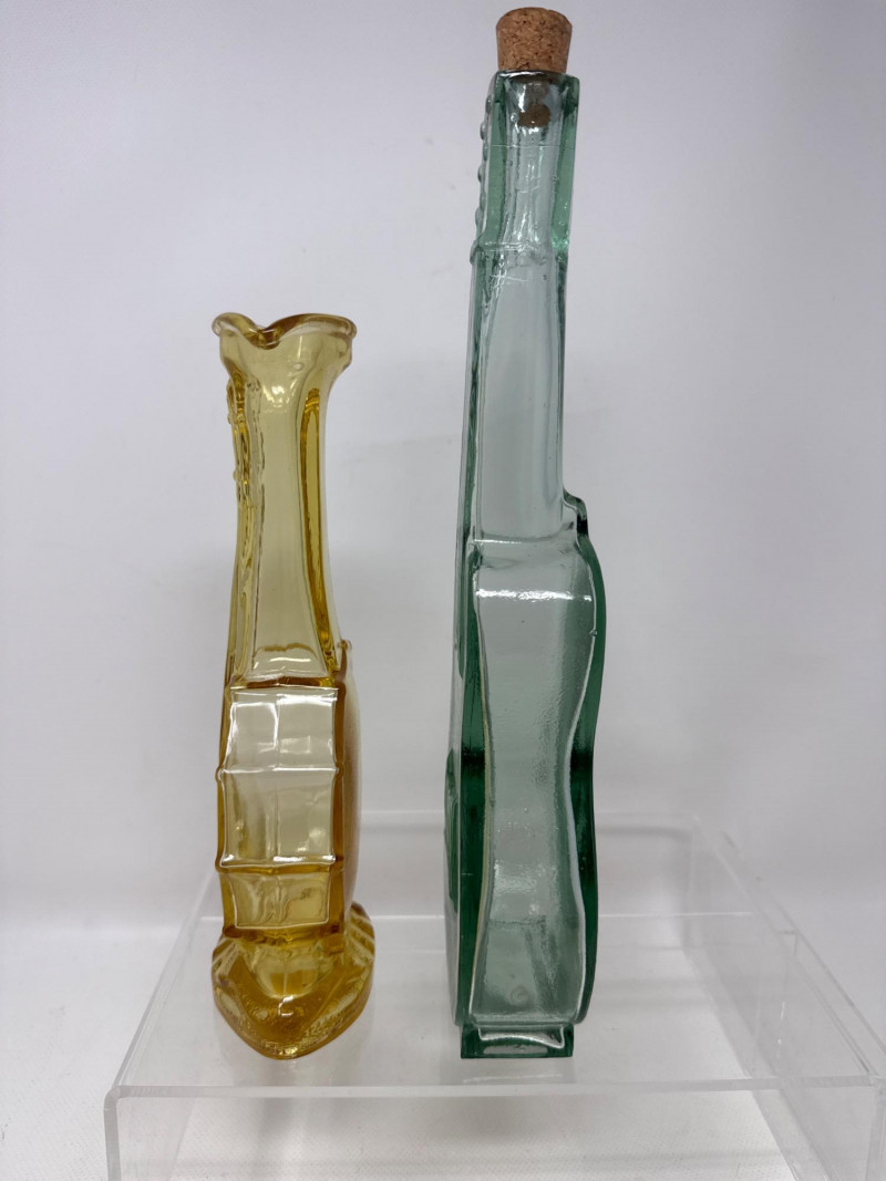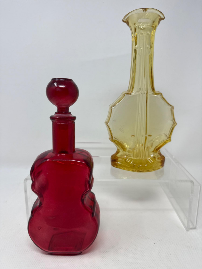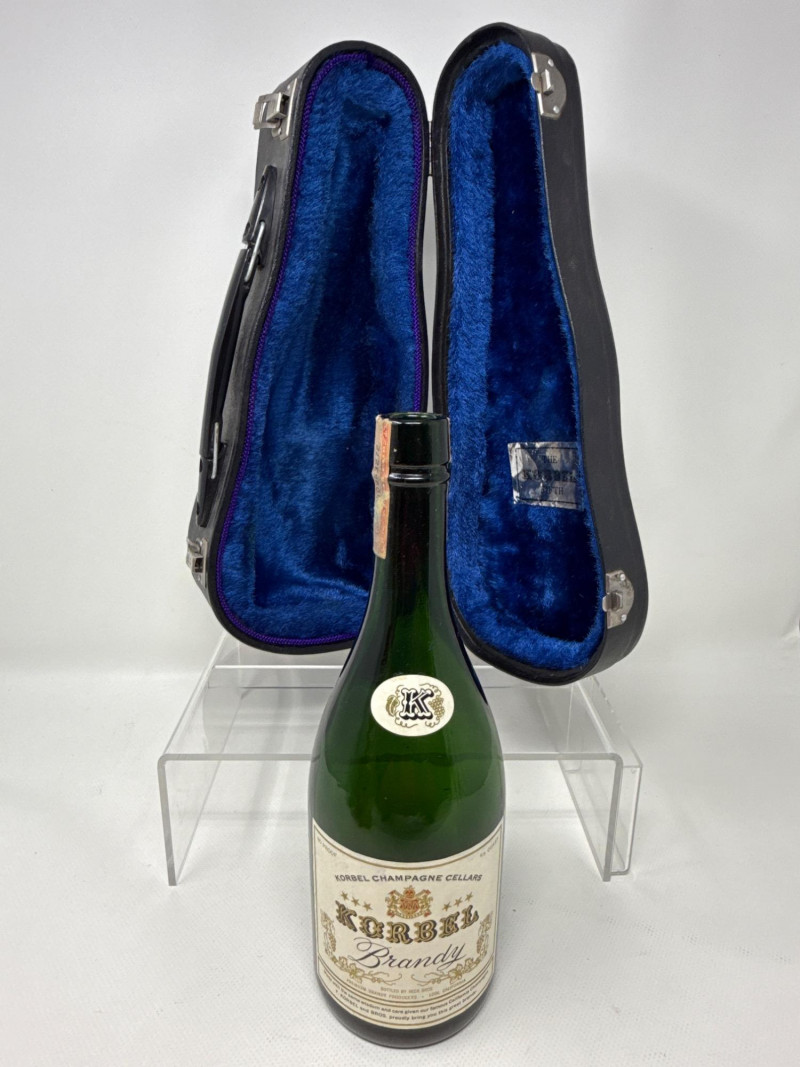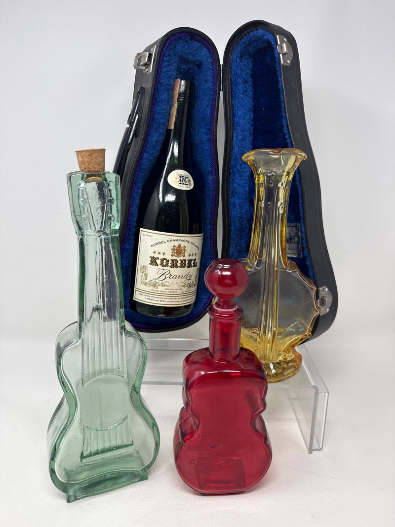 Four piece. Korbell Brandy bottle is empty. Includes leather carrying case. Three glass instrument bottles. Dimensions are red bottle 9.25 inches tall, 3.5 inches wide, 2 inches long. Green guitar bottle 13 inches tall, 4 inches wide, 1.5 inches one. Amber Imperial banjo bottle 9.5 inches tall, 4 inches wide, 2 inches long. Korbell leather carrying case 14.5 inches long, 4 inches tall, 6 inches wide.