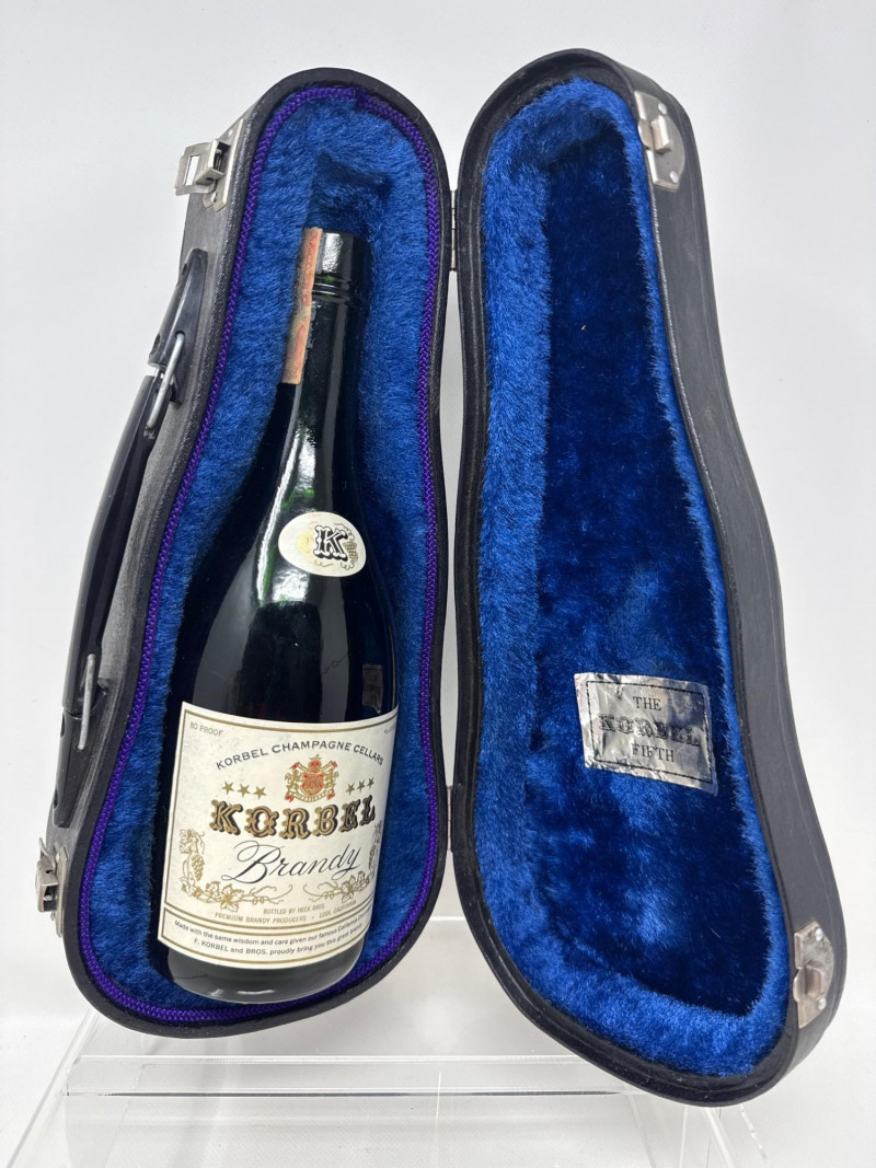 Lot # 97 - Vintage Korbel Brandy Bottle in Case and Glass Instrument Bottles