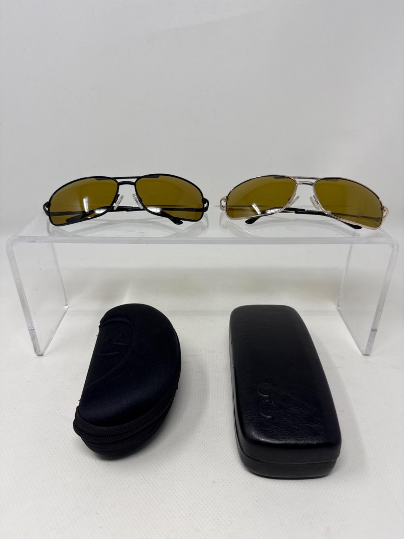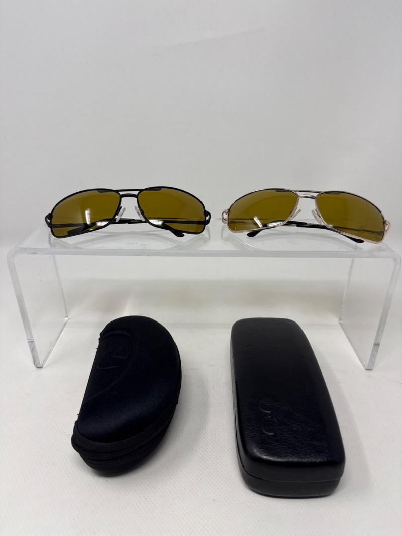 Matching Eagle Eyes Navigator glasses. Certified TriLenium lenses One with black frames and the other with gold. Includes storage case. One case is not original to the pair. Minimal wear. See pics for detail.