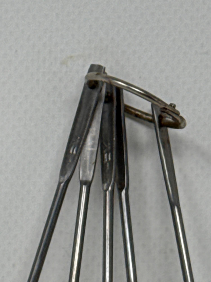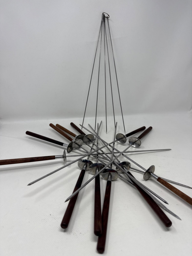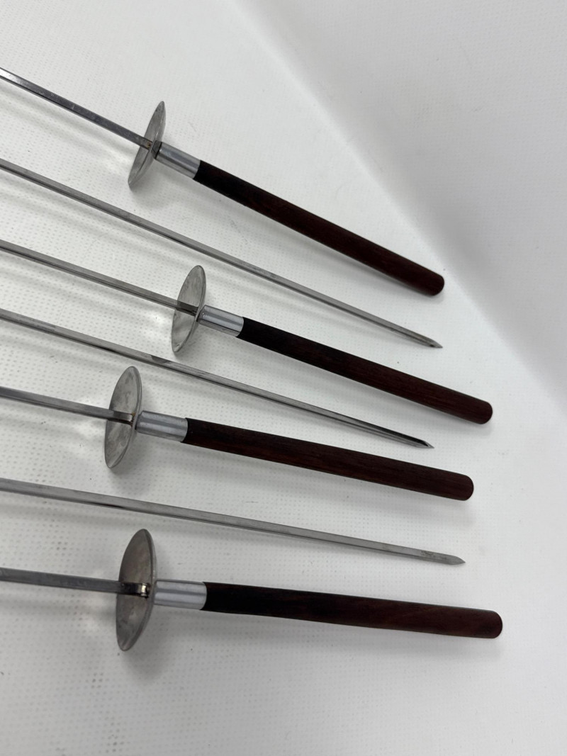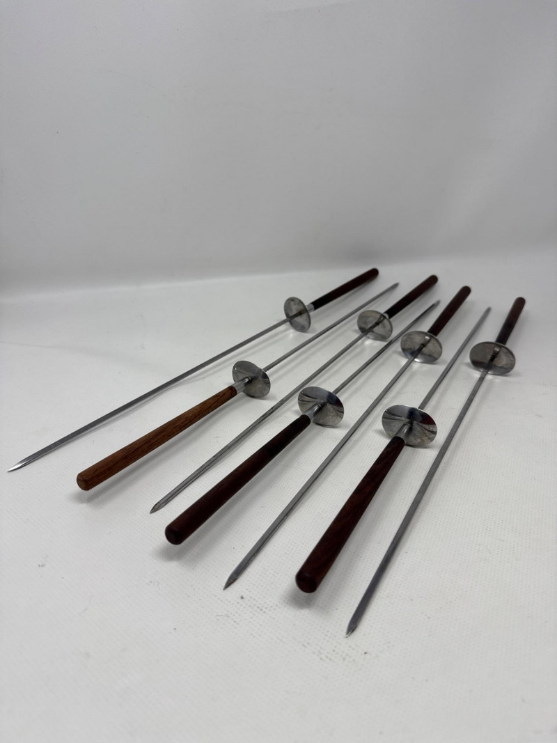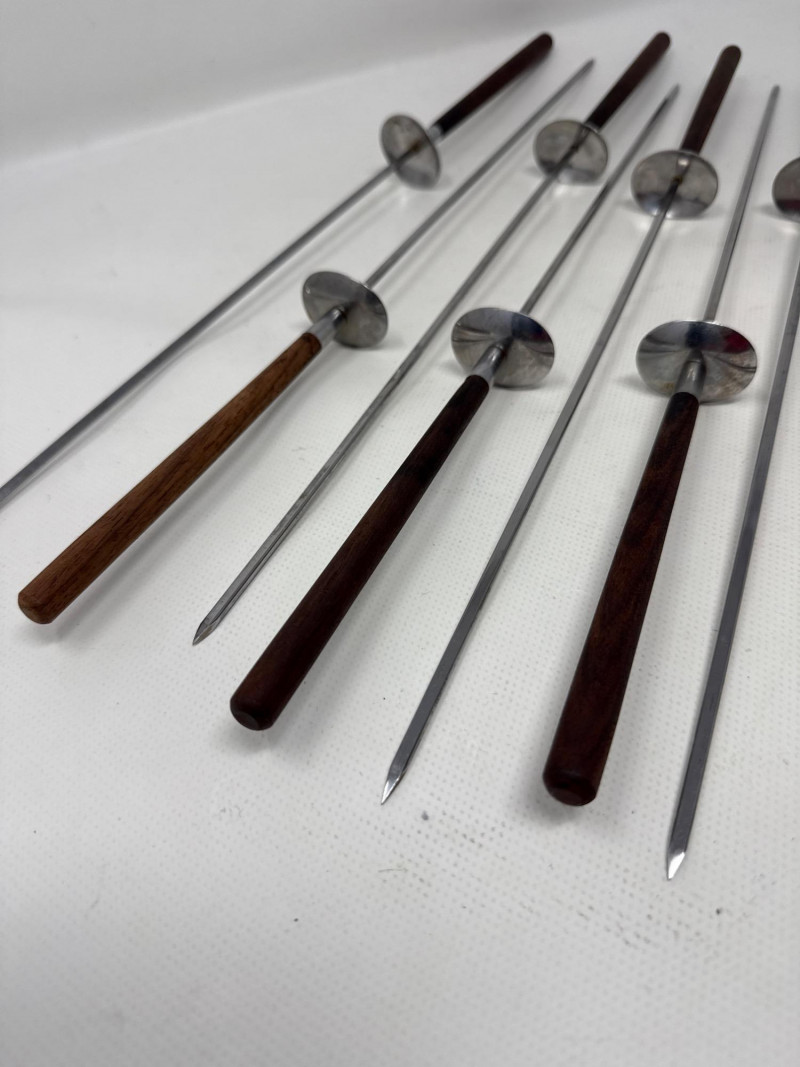 Vintage MCM metal skewers. Walnut handles with stainless steel rods. Clean and in good condition Set of 5 additional skewers on a loop.