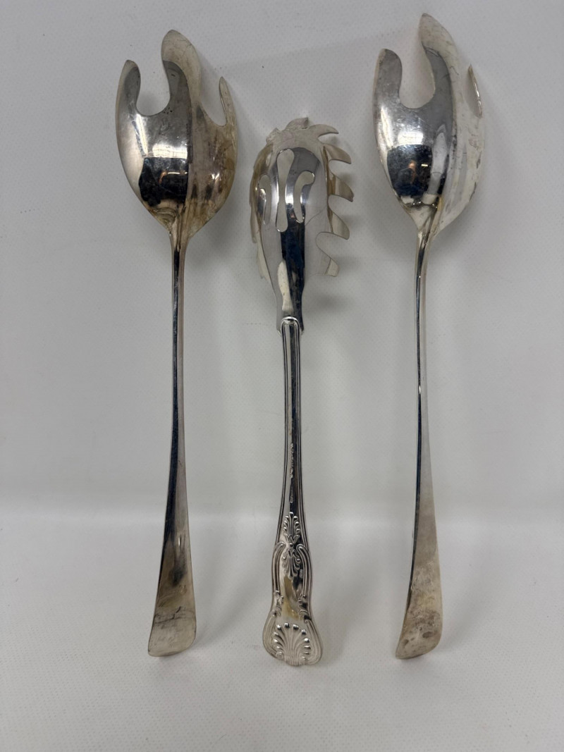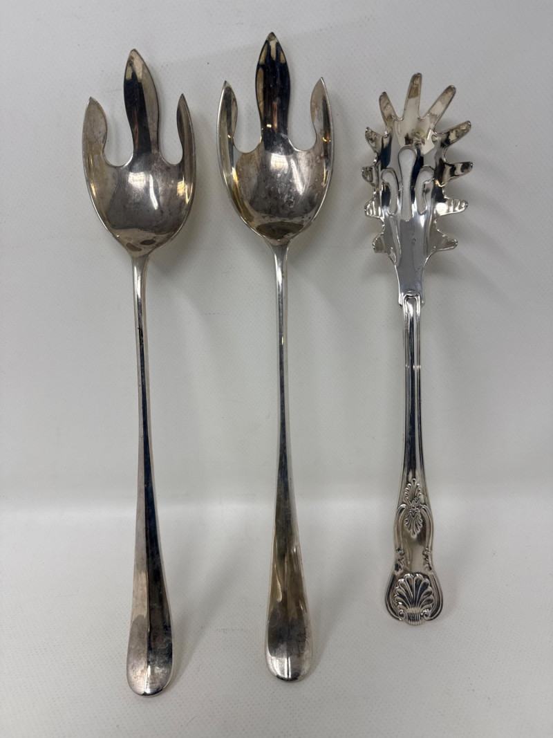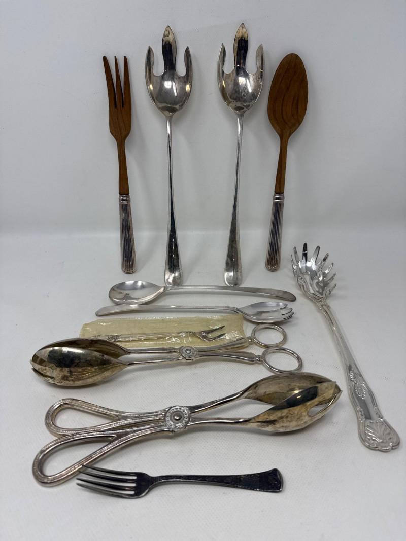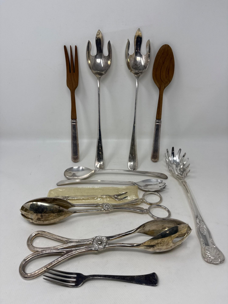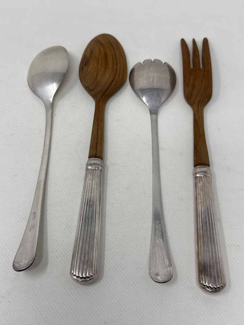 Vintage and MCM style serving utensils. 11 pieces. Two wooden utensils possibly with sterling handles. Not marked. Additional fork is Marked L. Russell company. Dated 1824. Dress up your next event with classic utensils.