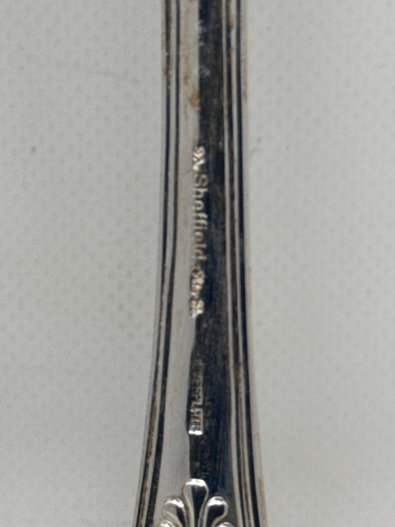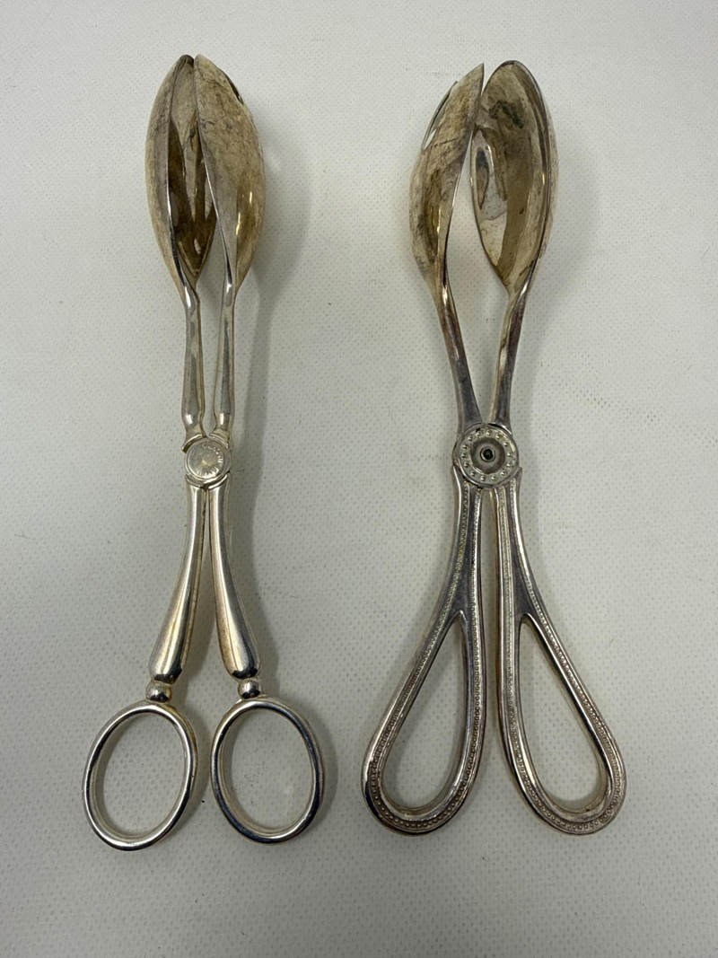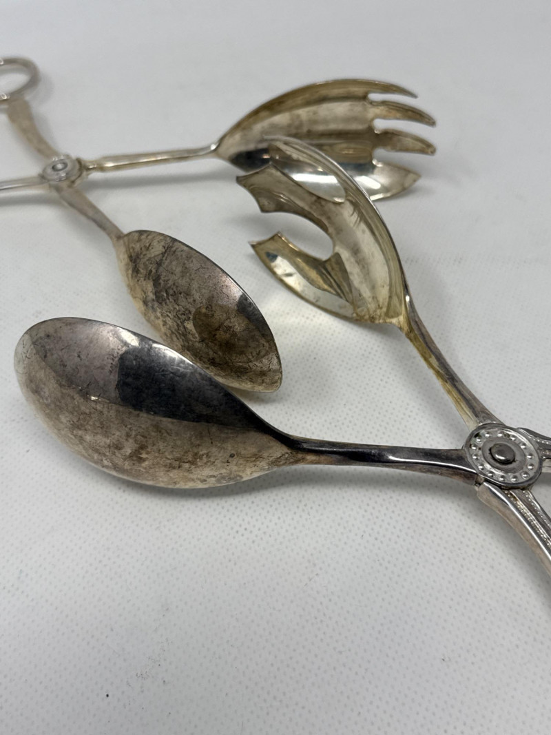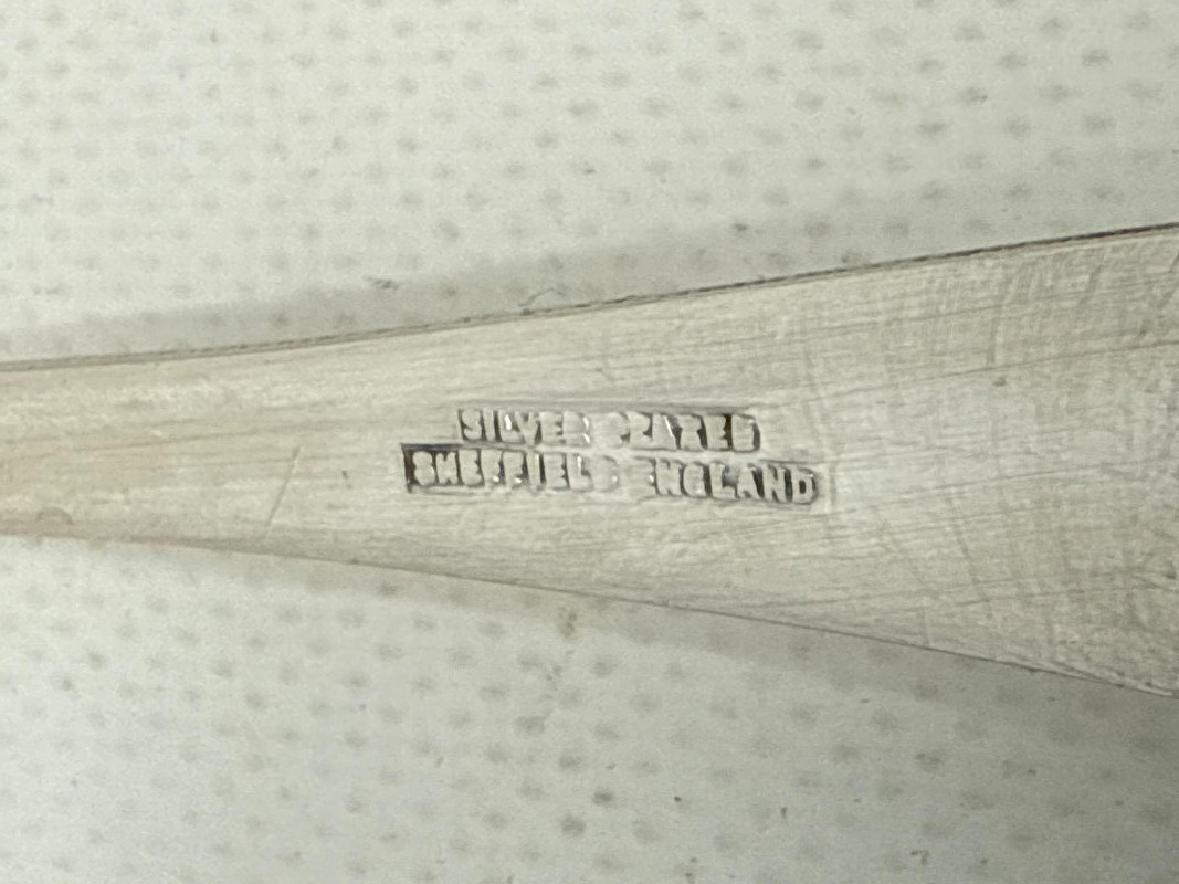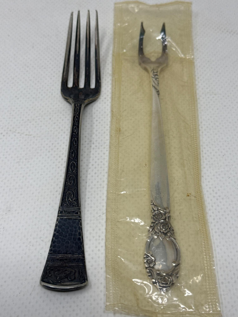 Vintage and MCM style serving utensils. 11 pieces. Two wooden utensils possibly with sterling handles. Not marked. Additional fork is Marked L. Russell company. Dated 1824. Dress up your next event with classic utensils.