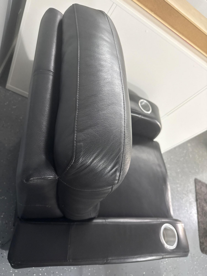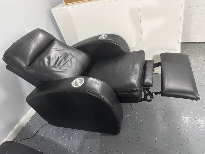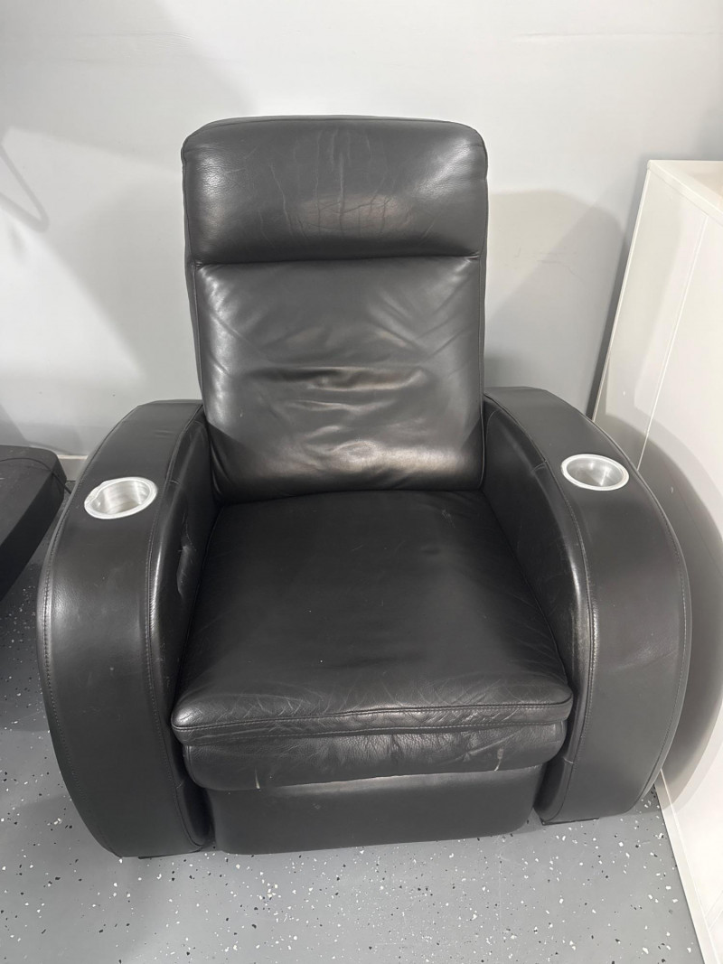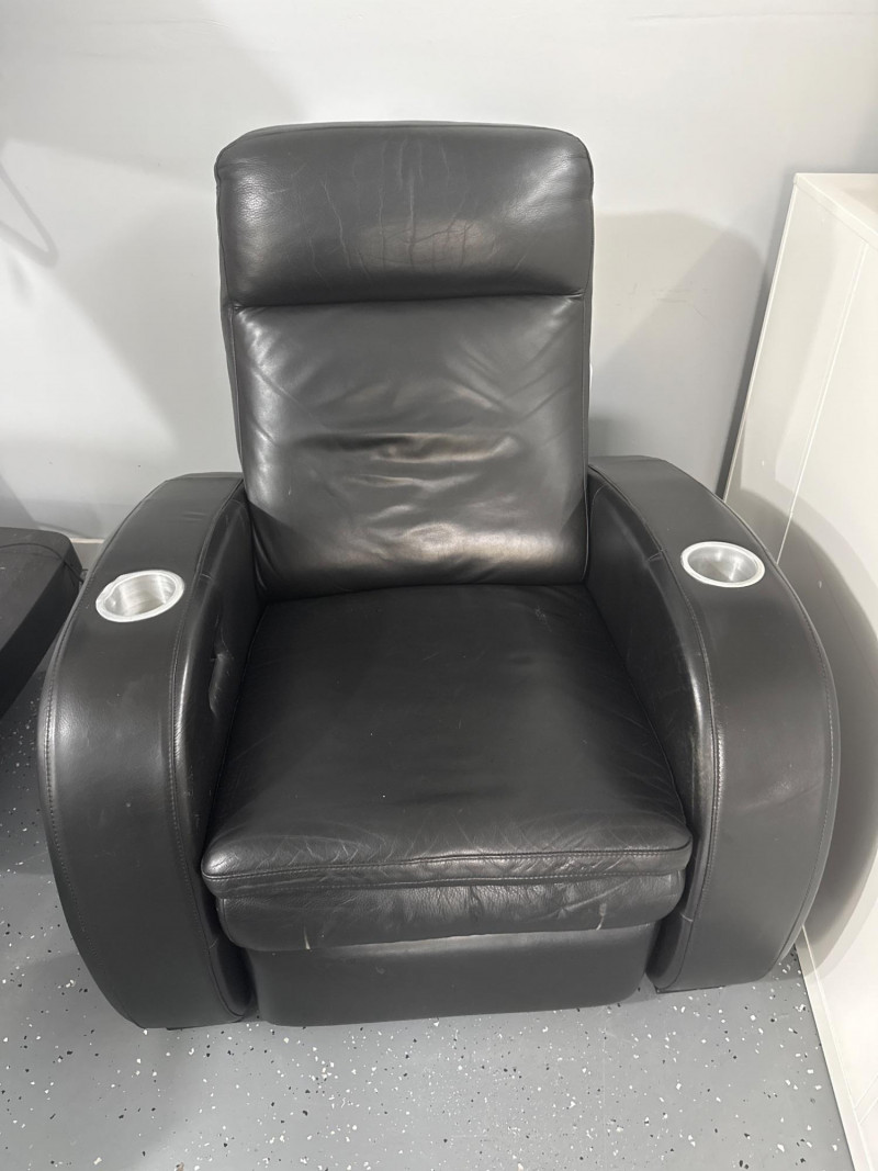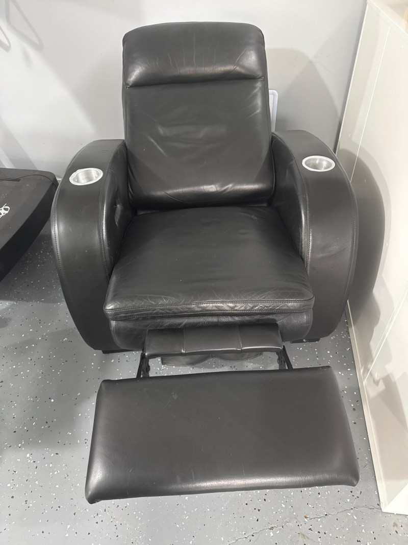 Black leatherlike recliner. Works well and is quiet. Extended length is 66 inches. Slim and modern design great for a dorm, apartment, additional seating. Not too large and bloated in size. Easy to get in and out and still firm support. Easy load location. Two cup holders. One with some dents on rim. Light normal wear and use. No tears, stains or smells.