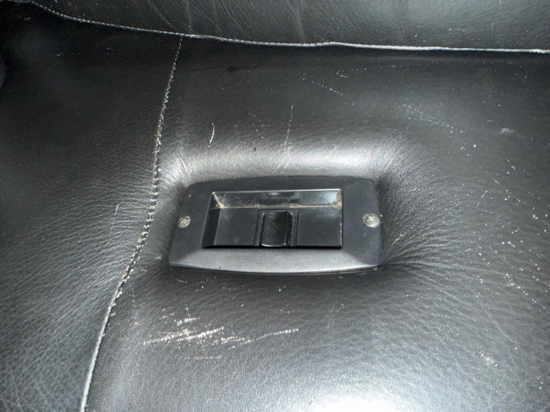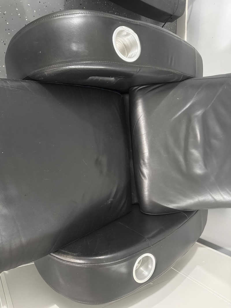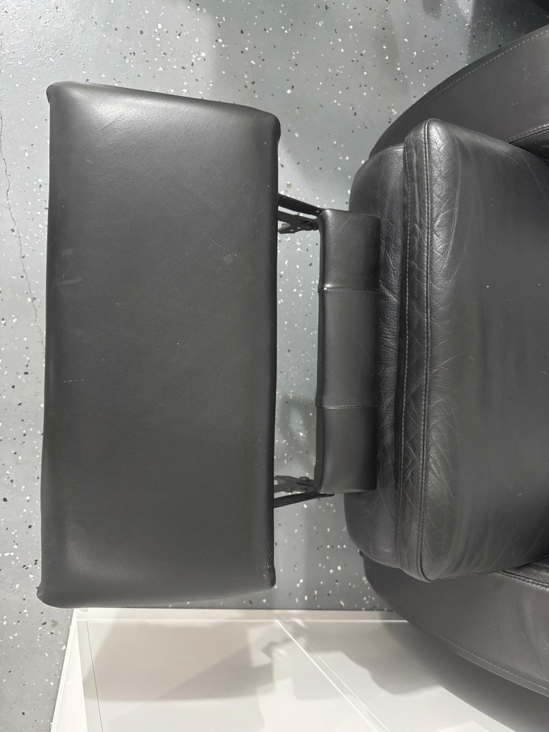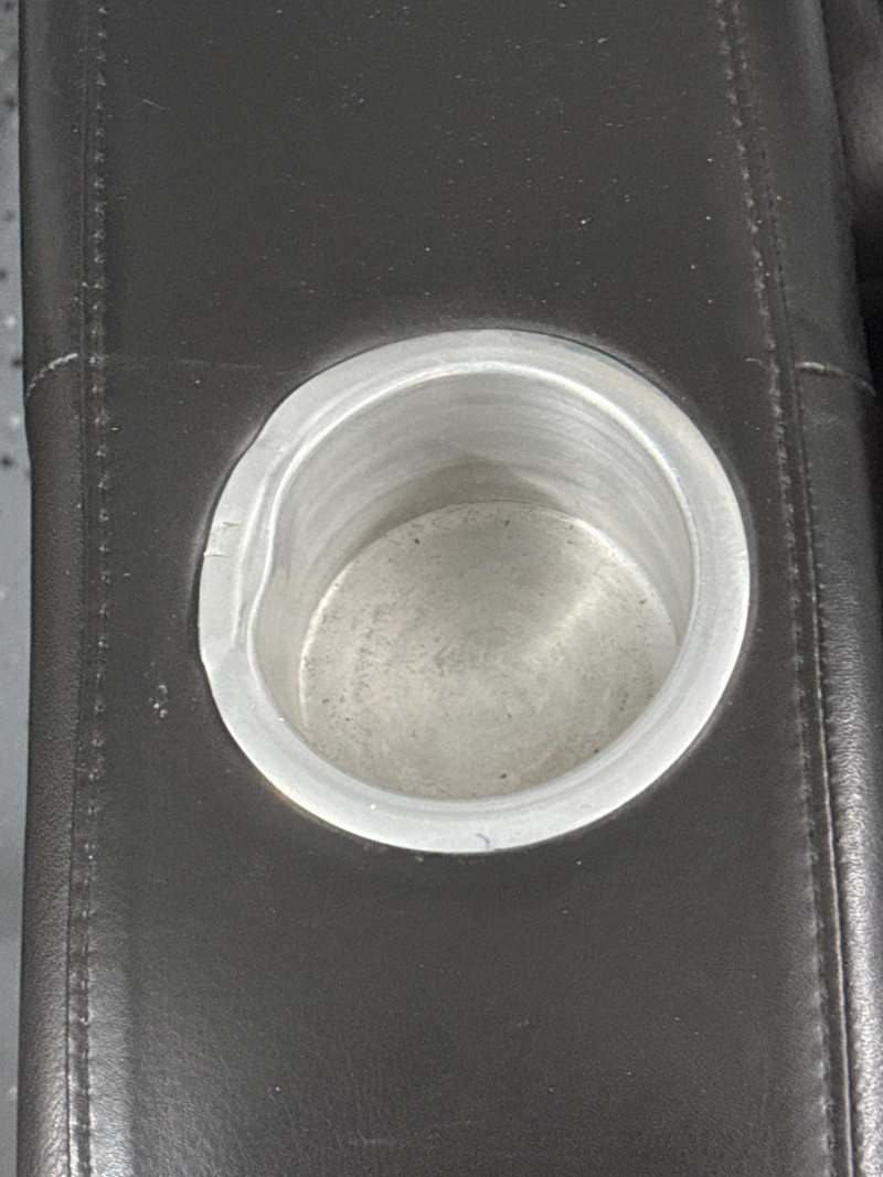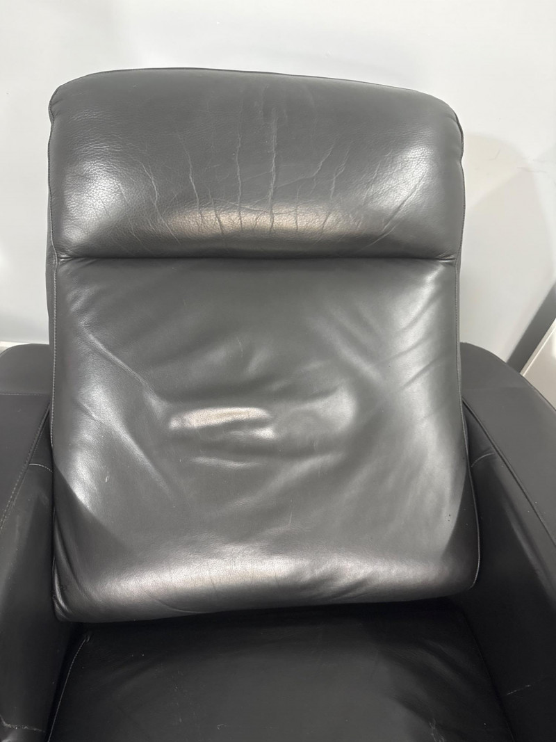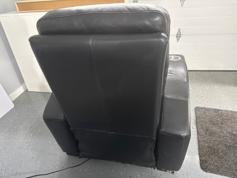 Black leatherlike recliner. Works well and is quiet. Extended length is 66 inches. Slim and modern design great for a dorm, apartment, additional seating. Not too large and bloated in size. Easy to get in and out and still firm support. Easy load location. Two cup holders. One with some dents on rim. Light normal wear and use. No tears, stains or smells.