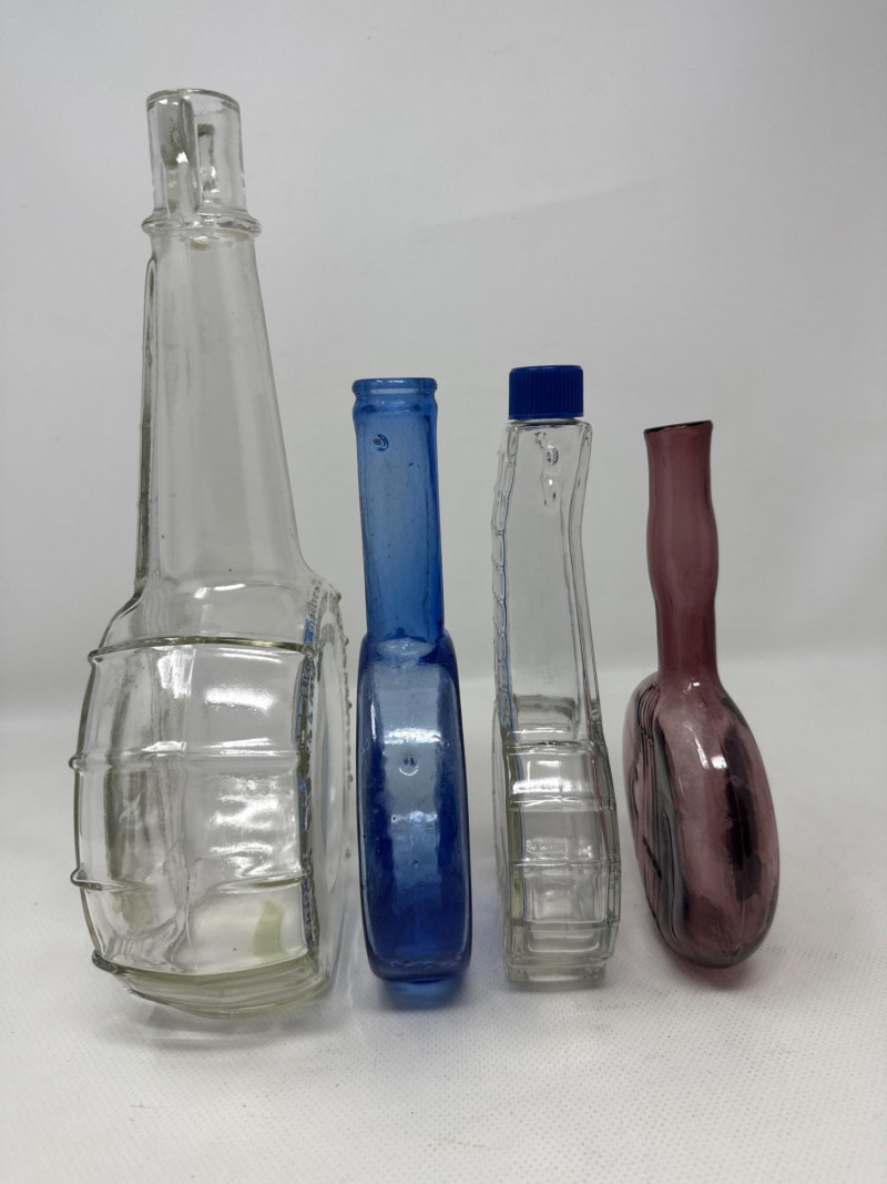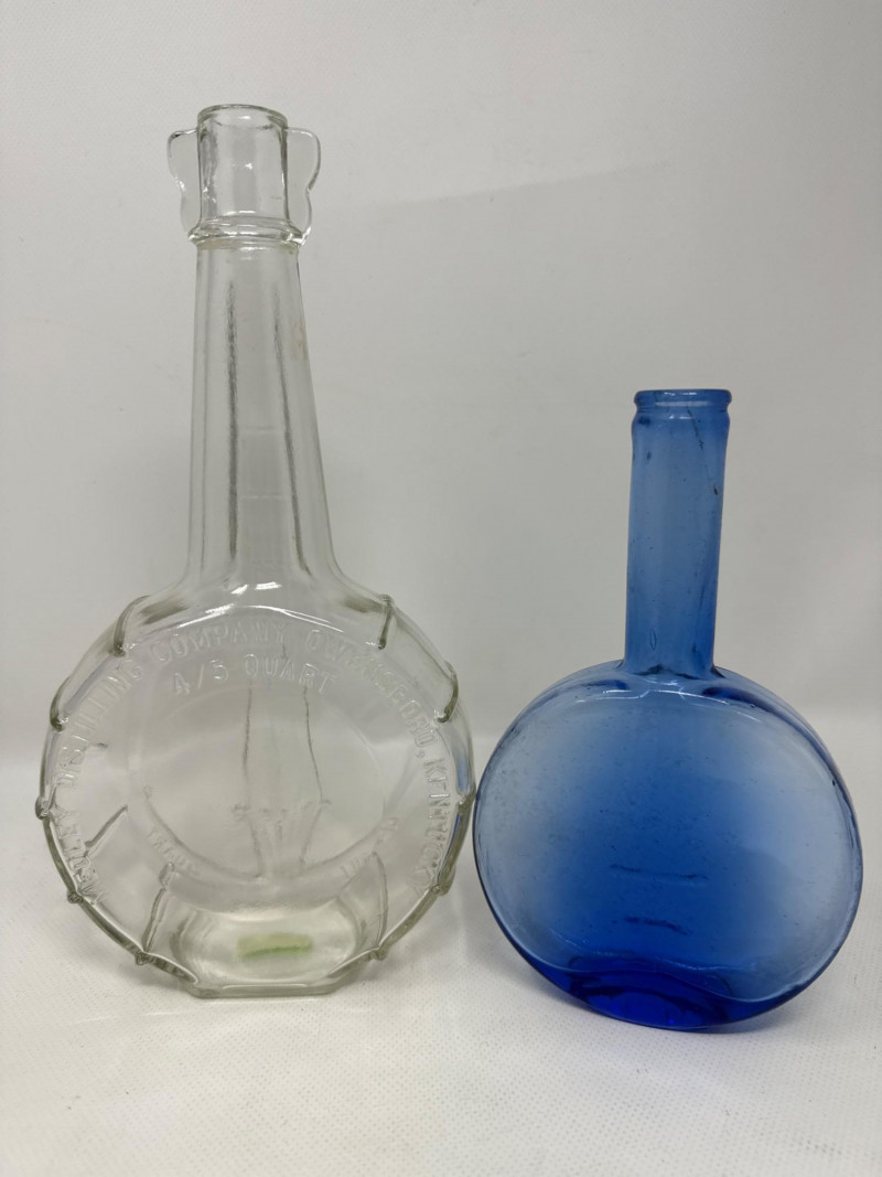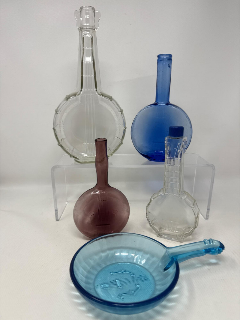 Five pieces total Blue banjo bowl/ashtray is 8.75 inches long, 5.5 inches wide. Raspberry color appears to be very old. All in good condition. One with cap. Largest is from Medley distilling company, Owensboro, Kentucky. Largest is 11 inches tall, 5.25 inches wide.