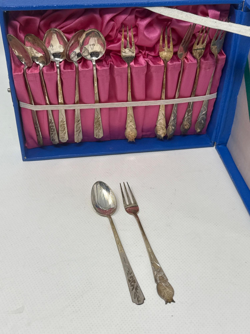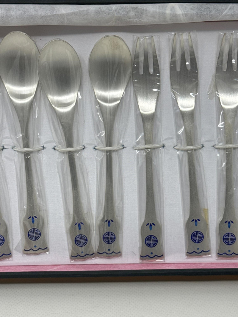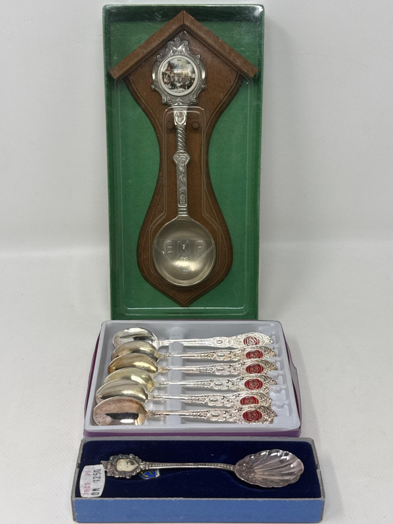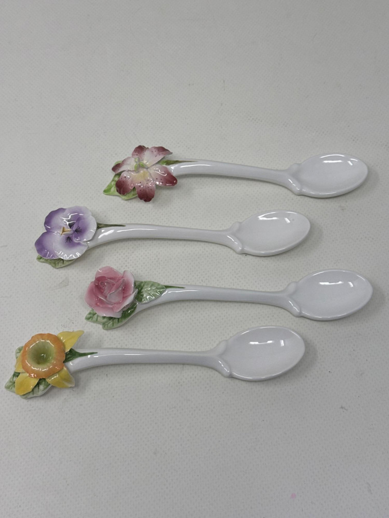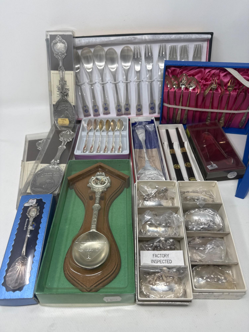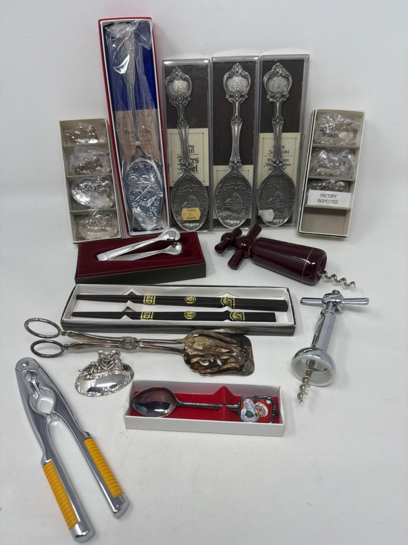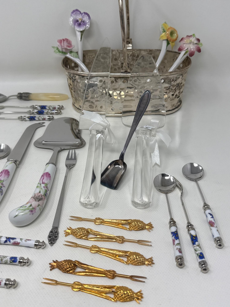 See pics for details. Huge lot of assorted flatware from a variety of makers. Silverplate basket, porcelain spoons, pearlescent handled spoon from DEPT 56. Ceramic condiment utensils, silver seating card or menu card holders. This is a large and useful collection. Many items new in box. Several collectors pieces.