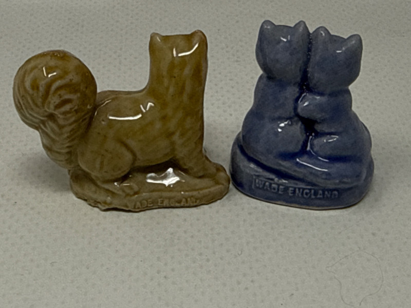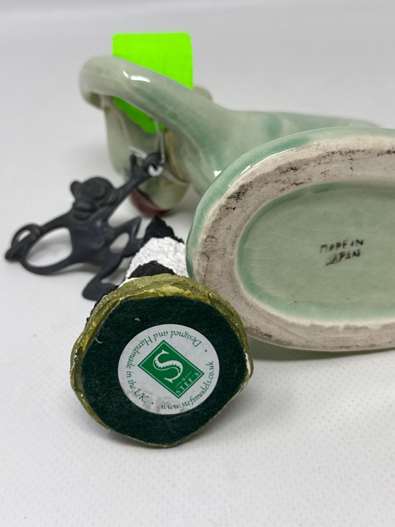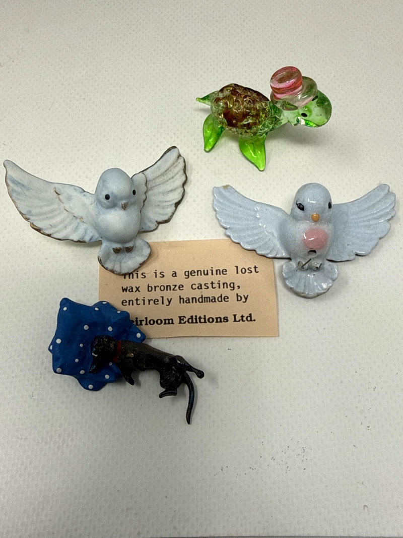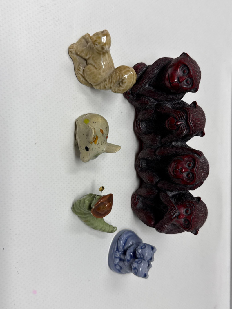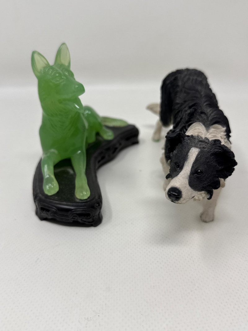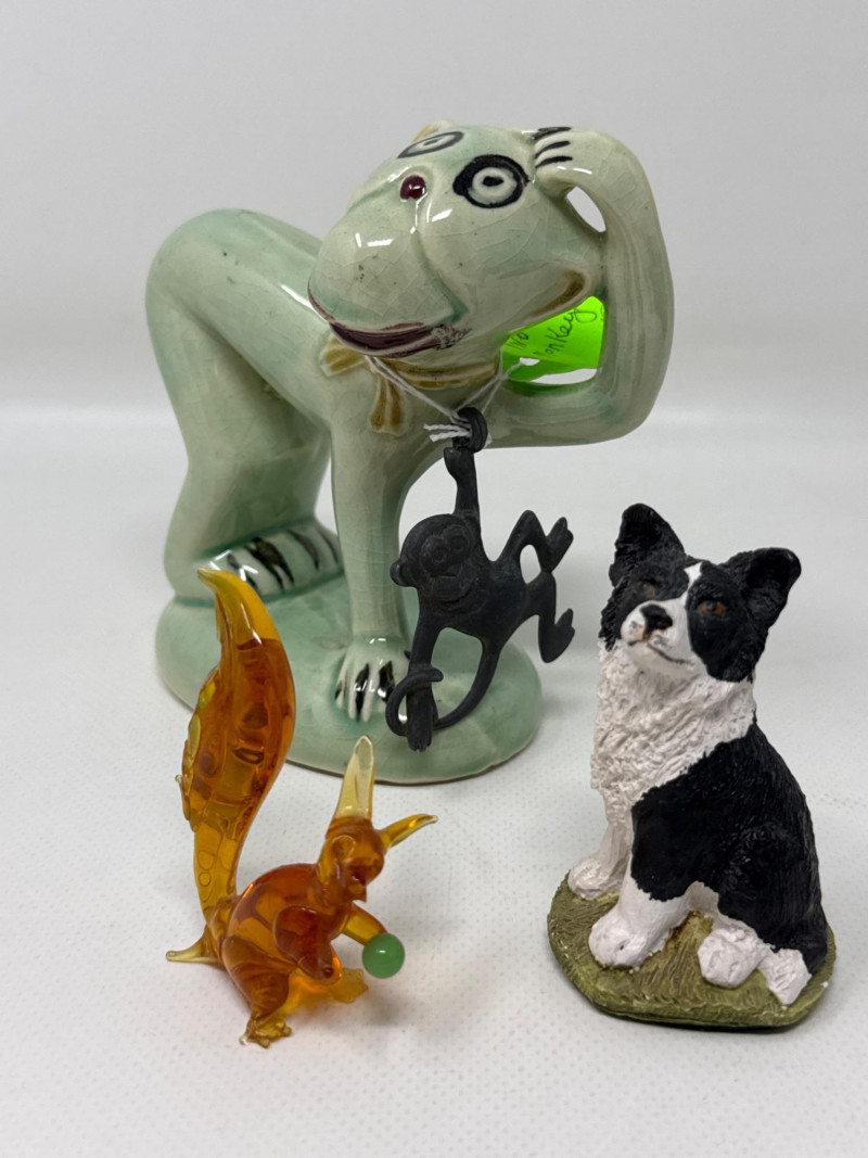 Green Ceramic Monkey: Upright posture with a lead monkey swinging from its neck, possibly stylized or whimsical in design. Green Dog Figurine: Lying down, smooth surface, plastic with jade color. Black and White Border Collie: Realistic stance, ceramic dog is 8 inches long, 3.25 inches tall. Copper Horse: Standing upright, detailed mane and tail. Black and White Dog: Smaller than the Border Collie, possibly a terrier breed. Resin Pink Glass Duck: Translucent, stylized with a rounded body and beak. Wizard Holding White Cat: Character figurine with a robe and hat, holding a small white cat. Ceramic Golden Glass Squirrel: Sitting upright, bushy tail, metallic finish. Small Mouse: Simplified form. Ceramic Green Caterpillar with Hat: Small, whimsical frog wearing a hat with pipe, ceramic. Dark Red "Three Wise Monkeys": Classic motif—see no evil, hear no evil, speak no evil—carved in a single piece. Resin or similar material Two White and Light Blue Birds: Wings spread, possibly in flight or landing pose, delicate and airy. Ceramic Green Turtle with Pink Hat: Small and playful, hat adds a humorous touch. Glass or plastic Small Black Dog: Positioned next to a tag reading “Handmade by Helicon Creations Ltd.”—likely a handcrafted piece. Genuine lost Wax bronze, casting handmade by heirloom edition Limited dog with pillow.Top Tier