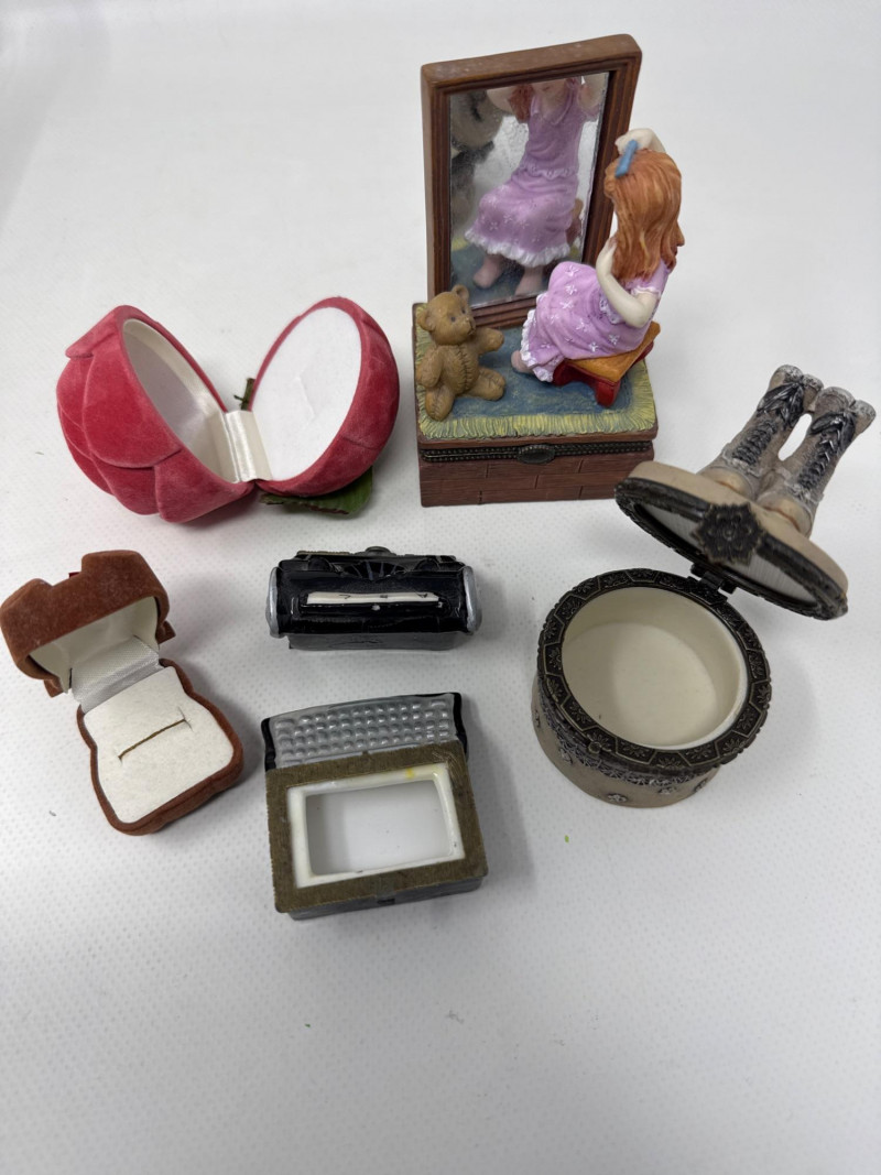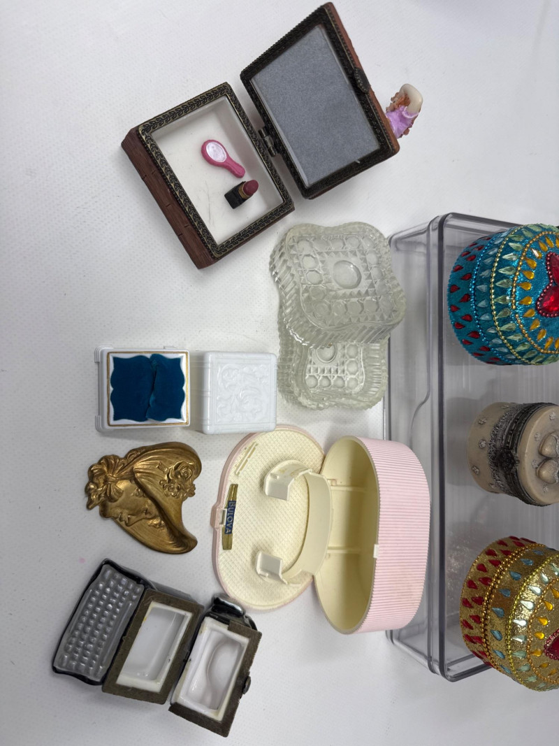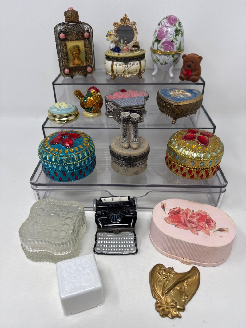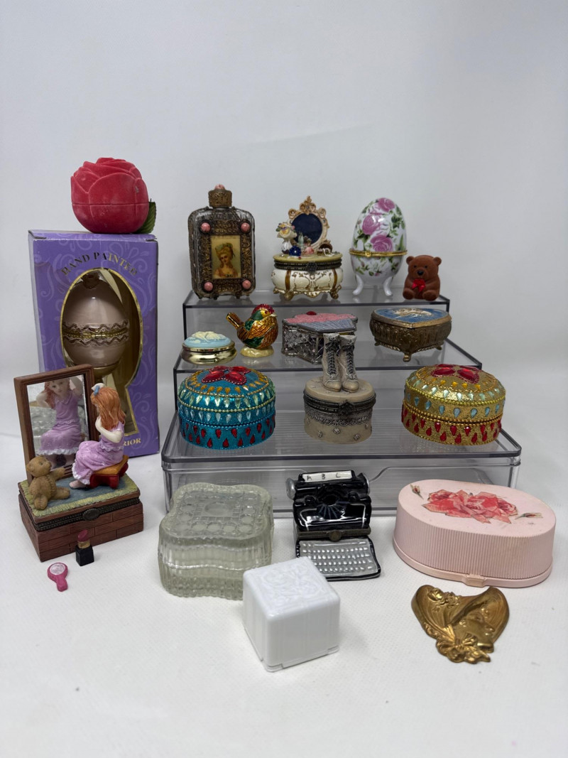 19 pieces. Replicating an era of refined sophistication. A collection of vintage-style trinket boxes and figurines. The assortment includes: Ornate trinket boxes: Egg-shaped, heart-shaped, and round boxes adorned with jewels, floral motifs, and intricate patterns. One heart-shaped box features a delicate pink rose design. Miniature figurines: A girl seated at a vanity with a teddy bear, a small bear figurine, and a bird add a whimsical touch. Unique items: A miniature typewriter and a purple box labeled "HAND PAINTED" suggest handcrafted artistry. Decorative craftsmanship: Many items exhibit detailed metalwork, enamel finishes, and embedded rhinestones, reflecting a collector’s eye for elegance and nostalgia. The overall aesthetic is eclectic and romantic, ideal for collectors of decorative arts or vintage. Style up your vanity, decor, closet or curio